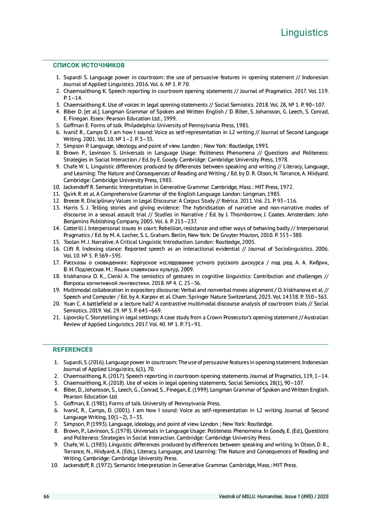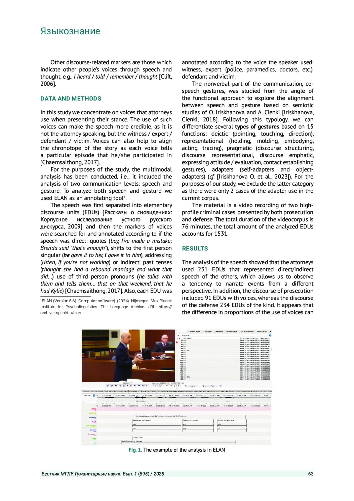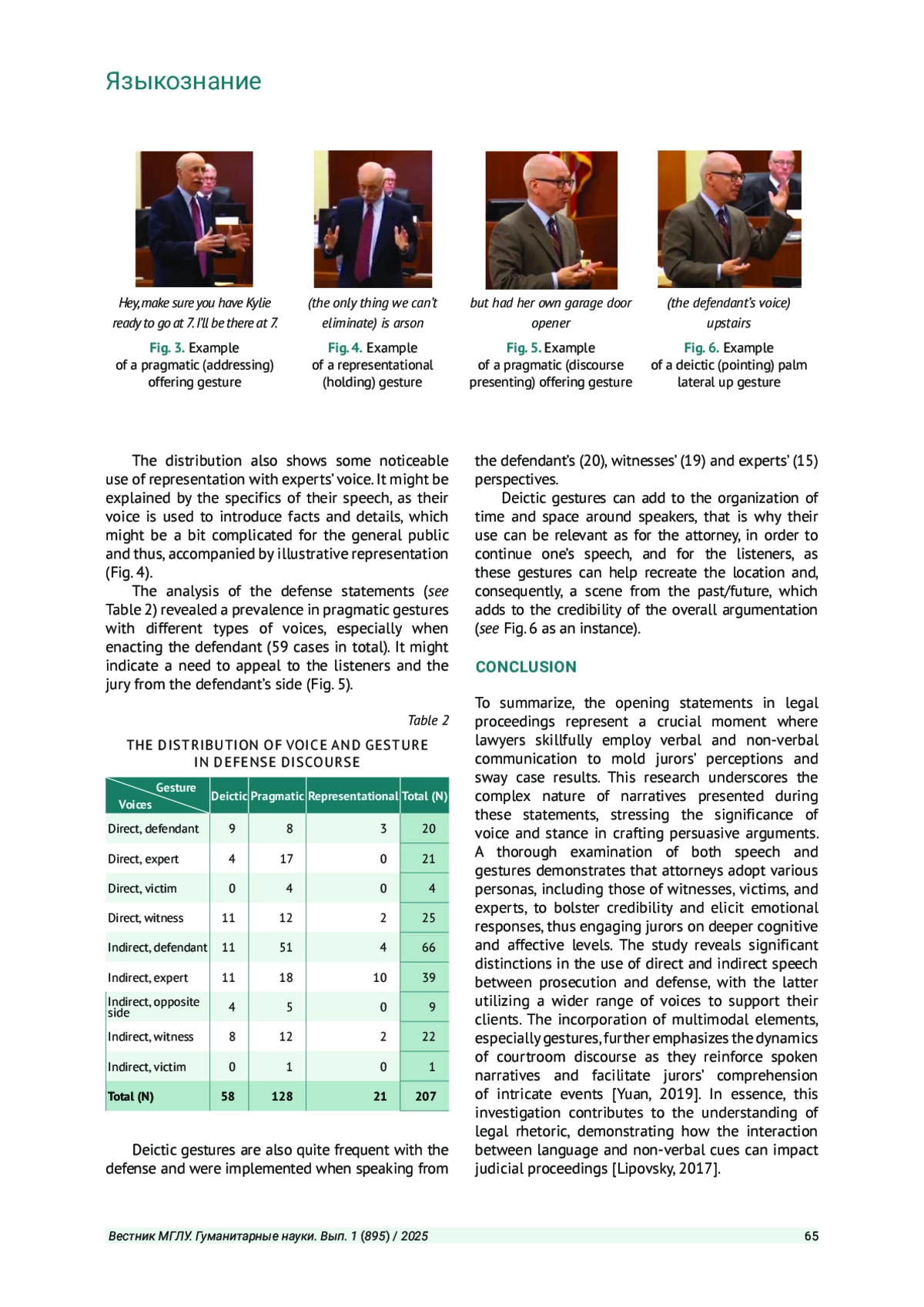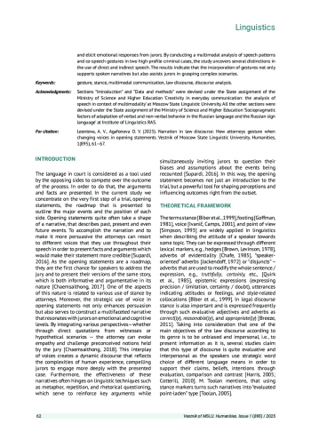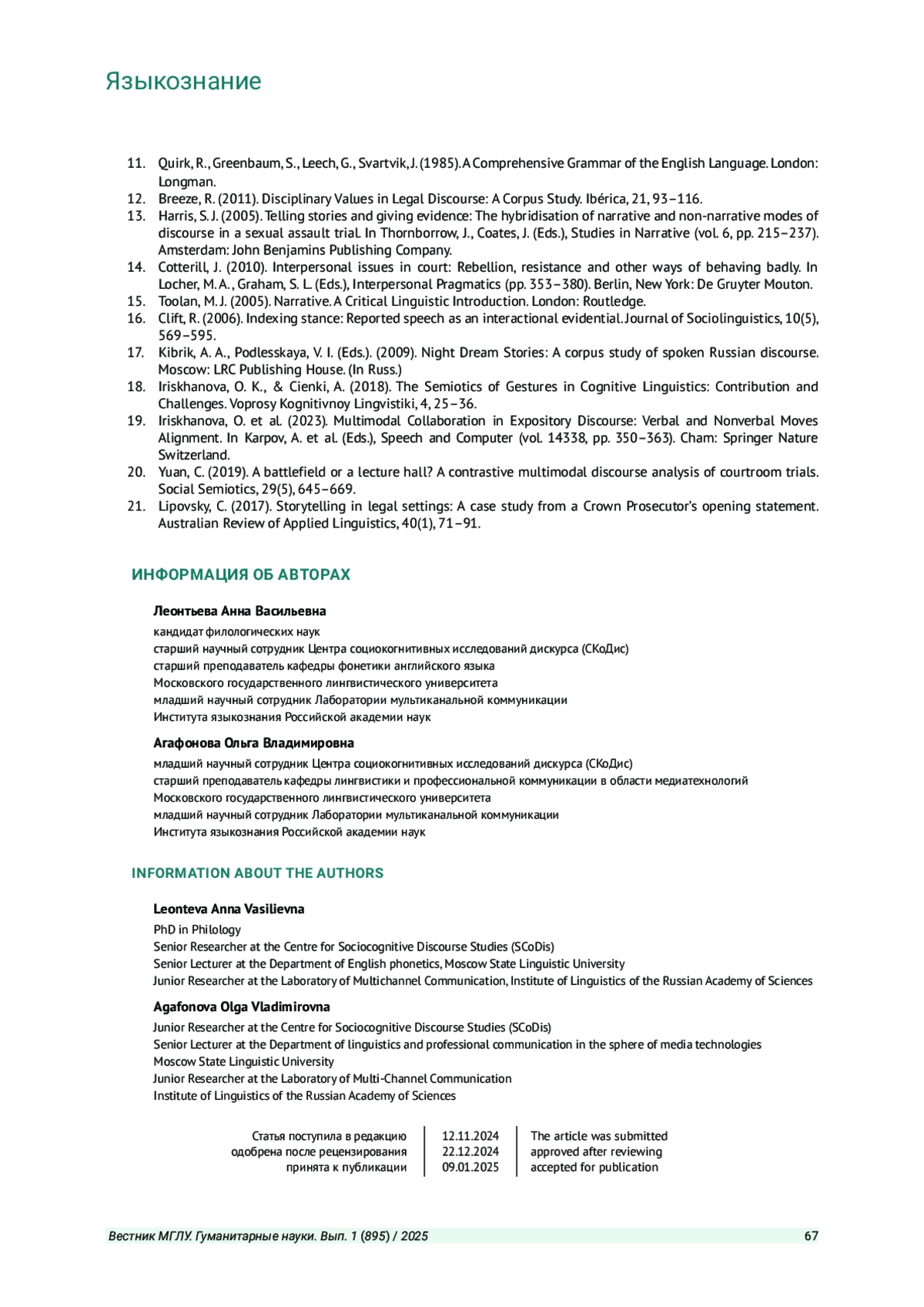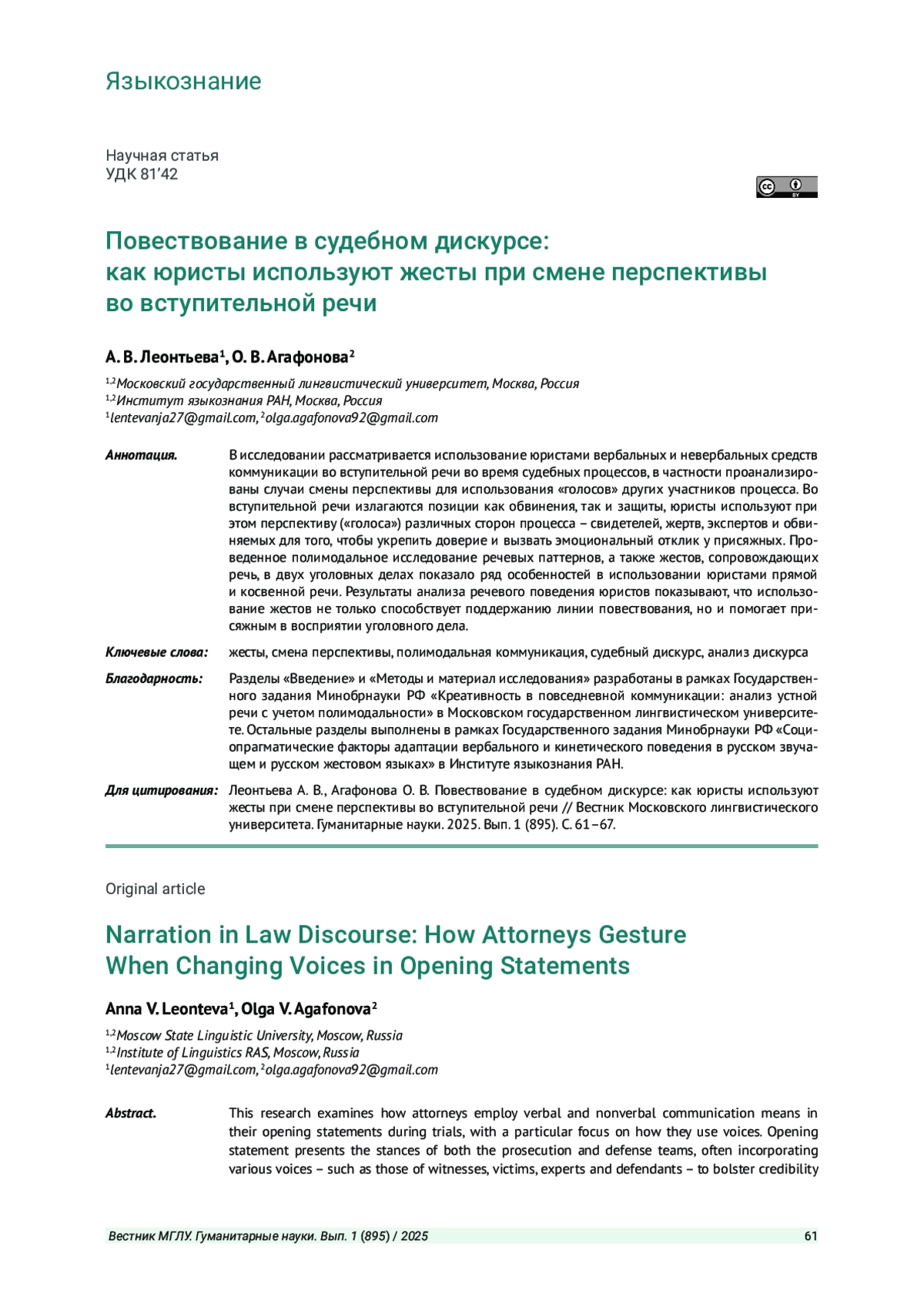 ЛЕОНТЬЕВА А. В., АГАФОНОВА О. В. ПОВЕСТВОВАНИЕ В СУДЕБНОМ ДИСКУРСЕ: КАК ЮРИСТЫ ИСПОЛЬЗУЮТ ЖЕСТЫ ПРИ СМЕНЕ ПЕРСПЕКТИВЫ ВО ВСТУПИТЕЛЬНОЙ РЕЧИ // ВЕСТНИК МОСКОВСКОГО ГОСУДАРСТВЕННОГО ЛИНГВИСТИЧЕСКОГО УНИВЕРСИТЕТА. ГУМАНИТАРНЫЕ НАУКИ. 2025. № 1 (895)