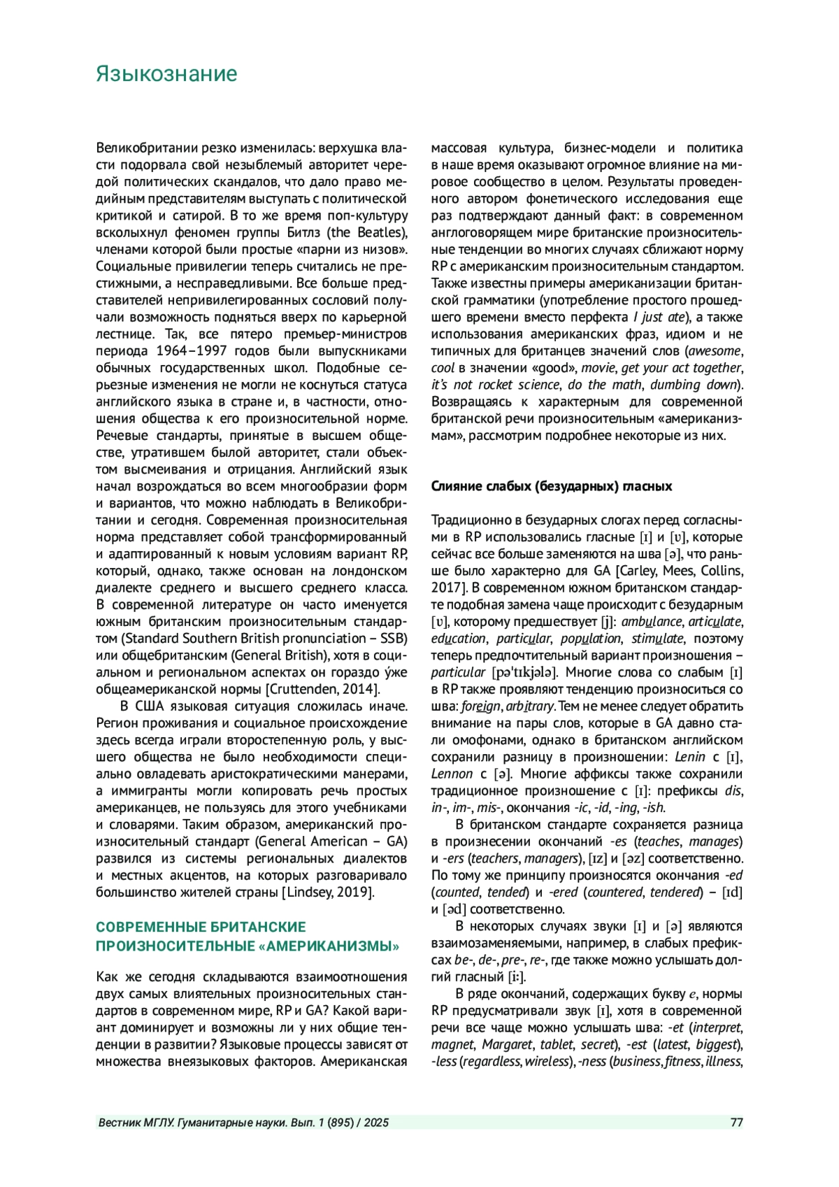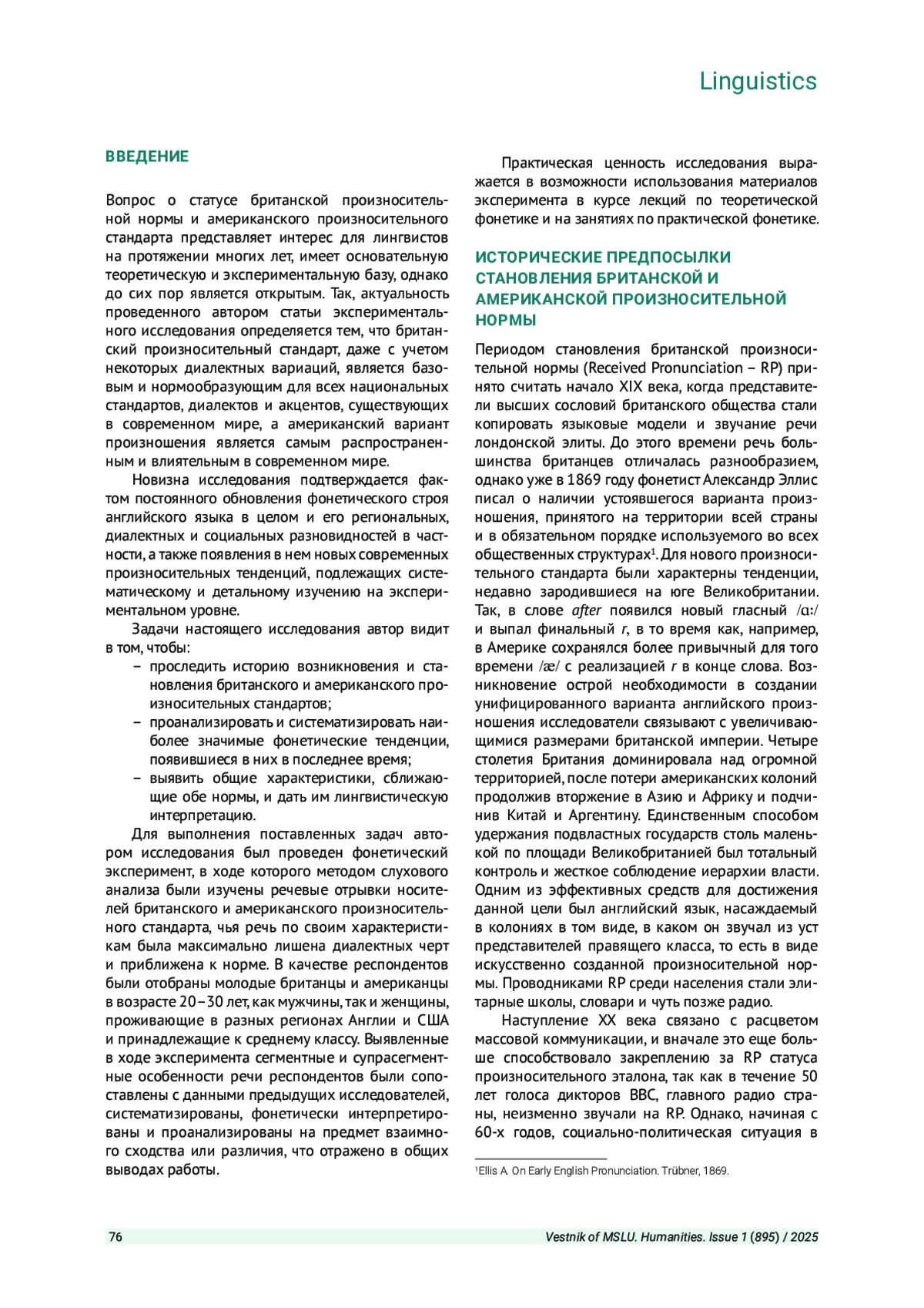 Вопрос о статусе британской произносительной нормы и американского произносительного стандарта представляет интерес для лингвистов на протяжении многих лет, имеет основательную теоретическую и экспериментальную базу, однако до сих пор является открытым. Так, актуальность проведенного автором статьи экспериментального исследования определяется тем, что британский произносительный стандарт, даже с учетом некоторых диалектных вариаций, является базовым и нормообразующим для всех национальных стандартов, диалектов и акцентов, существующих в современном мире, а американский вариант произношения является самым распространенным и влиятельным в современном мире.