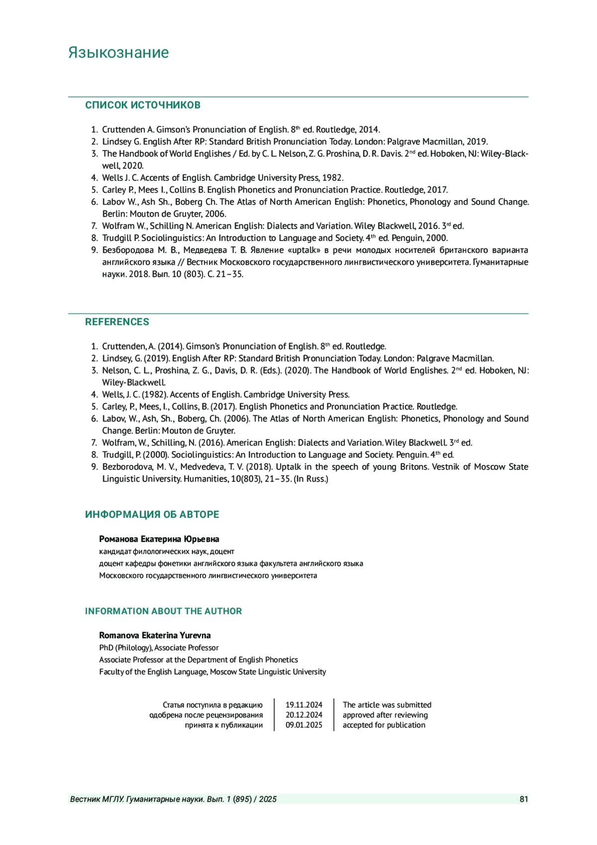 9. Безбородова М. В., Медведева Т. В. Явление “uptalk” в речи молодых носителей британского варианта английского языка // Вестник Московского государственного лингвистического университета. Гуманитарные науки. 2018. Вып. 10 (803). С. 21-35. EDN: PEMIBM