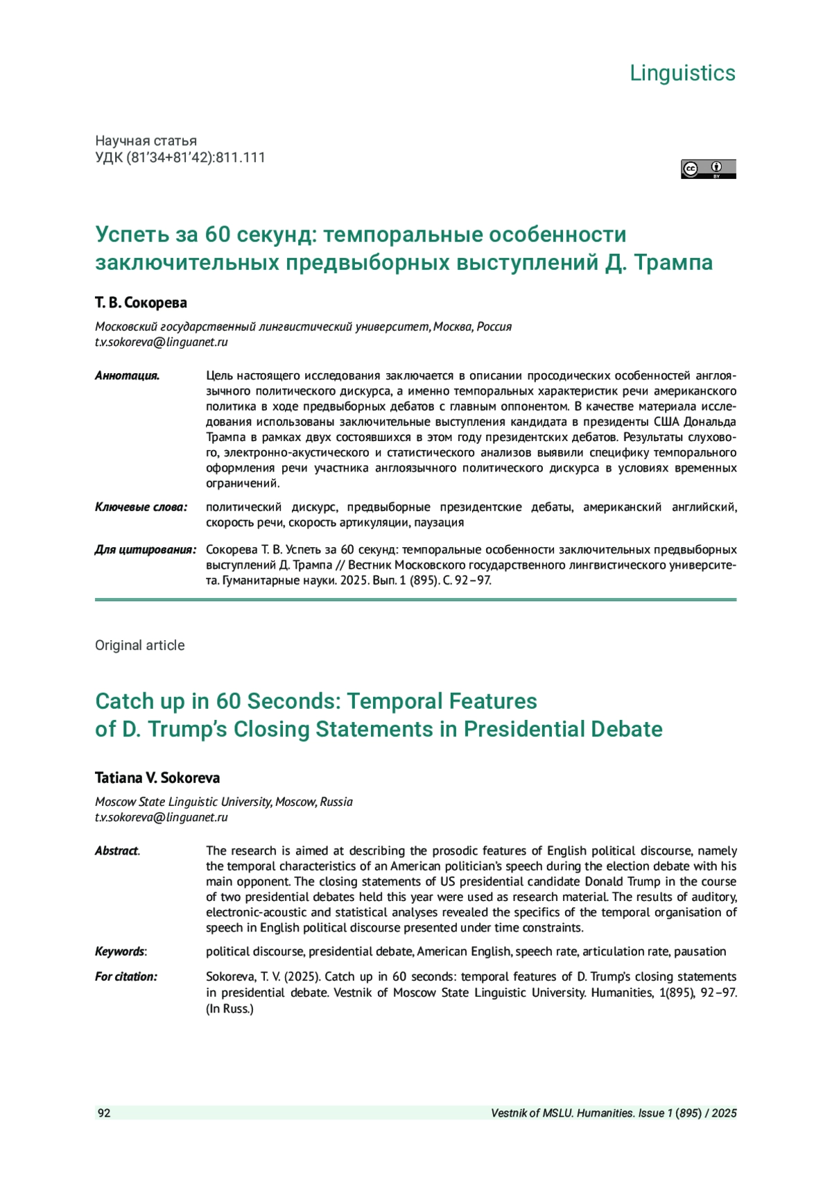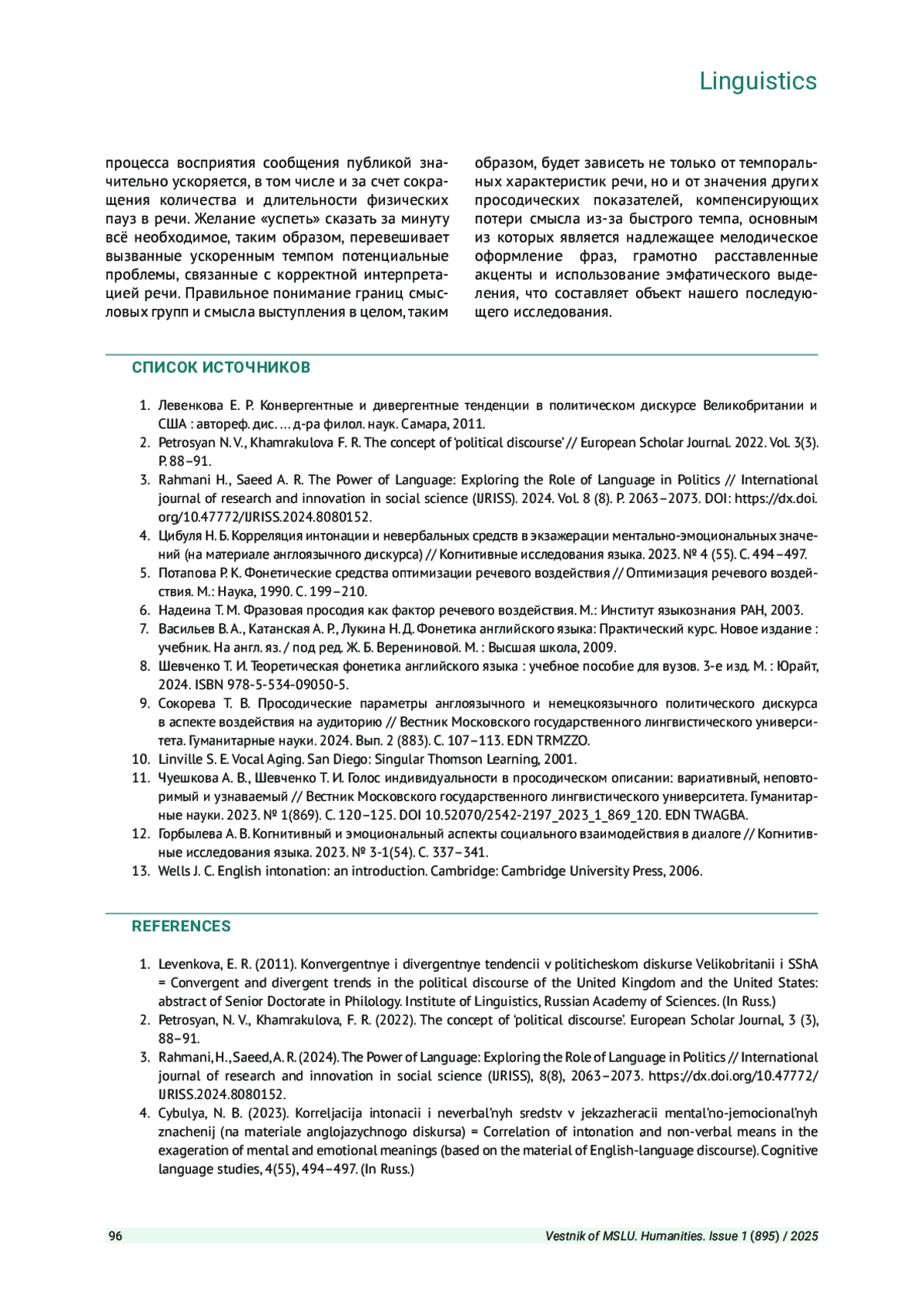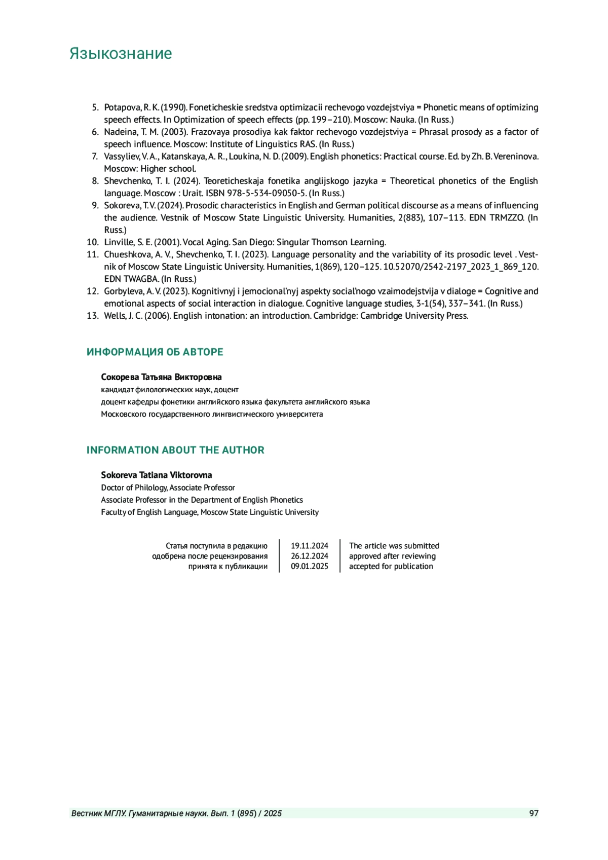 9. Сокорева Т. В. Просодические параметры англоязычного и немецкоязычного политического дискурса в аспекте воздействия на аудиторию // Вестник Московского государственного лингвистического университета. Гуманитарные науки. 2024. Вып. 2 (883). С. 107-113. EDN: TRMZZO