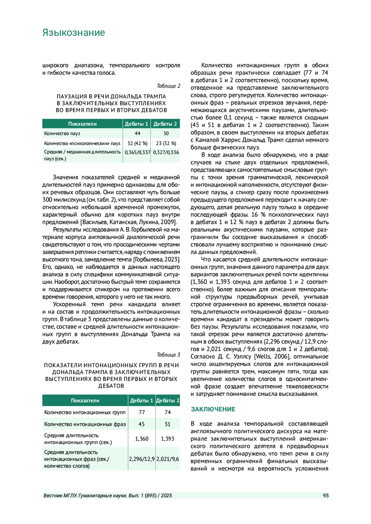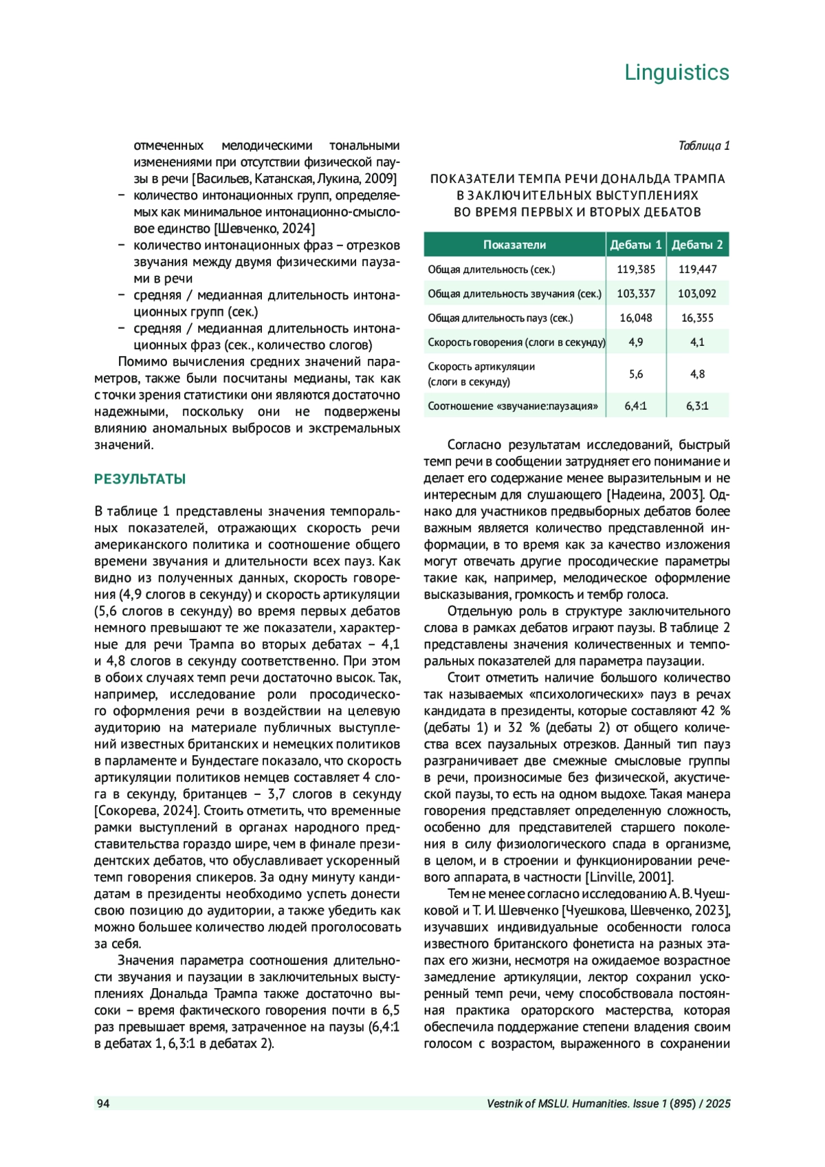 Цель настоящего исследования заключается в описании просодических особенностей англоязычного политического дискурса, а именно темпоральных характеристик речи американского политика в ходе предвыборных дебатов с главным оппонентом. В качестве материала исследования использованы заключительные выступления кандидата в президенты США Дональда Трампа в рамках двух состоявшихся в этом году президентских дебатов. Результаты слухового, электронно-акустического и статистического анализов выявили специфику темпорального оформления речи участника англоязычного политического дискурса в условиях временных ограничений.