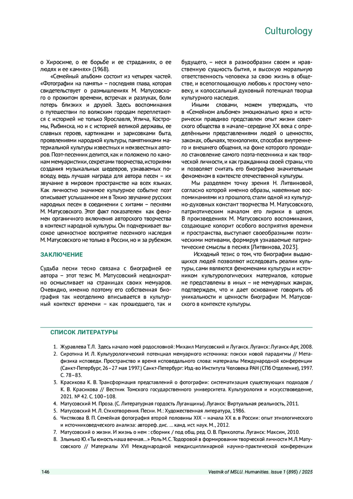Творчество поэта-песенника М. Матусовского известно далеко за пределами нашей страны. Внутренний мир человека искусства отражает мемуаристика - письма, воспоминания, автобиографии. «Семейный альбом» - единственное прозаическое произведение писателя, своеобразный ключ к его биографии, содержит воспоминания детства, зарисовки военных лет, размышления о творчестве, впечатления о путешествиях. Цель исследования обусловлена актуальностью изучения жизненного пути и творчества выдающегося поэта-песенника в контексте культуры. Для достижения цели применялись научные методы мемуаристики. Проведенный анализ позволил сделать вывод об уникальности аутентичного источника - прозы М. Матусовского - для воссоздания подлинного портрета исторической личности, его роли в формировании творческого жанра, в целом культуры.