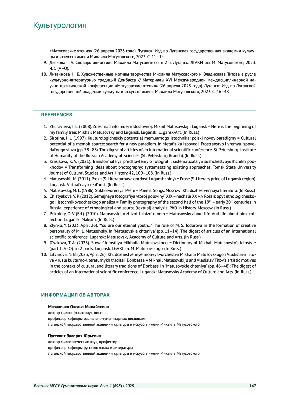 10. Литвинова Н. Б. Художественные мотивы творчества Михаила Матусовского и Владислава Титова в русле культурно-литературных традиций Донбасса // Материалы ХVI Международной междисциплинарной научно-практической конференции “Матусовские чтения” (26 апреля 2023 года). Луганск: Изд-во Луганcкой государственной академии культуры и искусств имени Михаила Матусовского, 2023. С. 46-48.