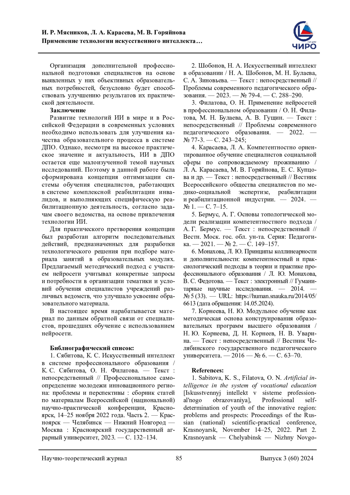 1. Сябитова, К. С. Искусственный интеллект в системе профессионального образования / К. С. Сябитова, О. Н. Филатова. - Текст: непосредственный // Профессиональное самоопределение молодежи инновационного региона: проблемы и перспективы: сборник статей по материалам Всероссийской (национальной) научно-практической конференции, Красноярск, 14-25 ноября 2022 года. Часть 2. - Красноярск - Челябинск - Нижний Новгород - Москва: Красноярский государственный аграрный университет, 2023. - С. 132-134. EDN: MEISQW
