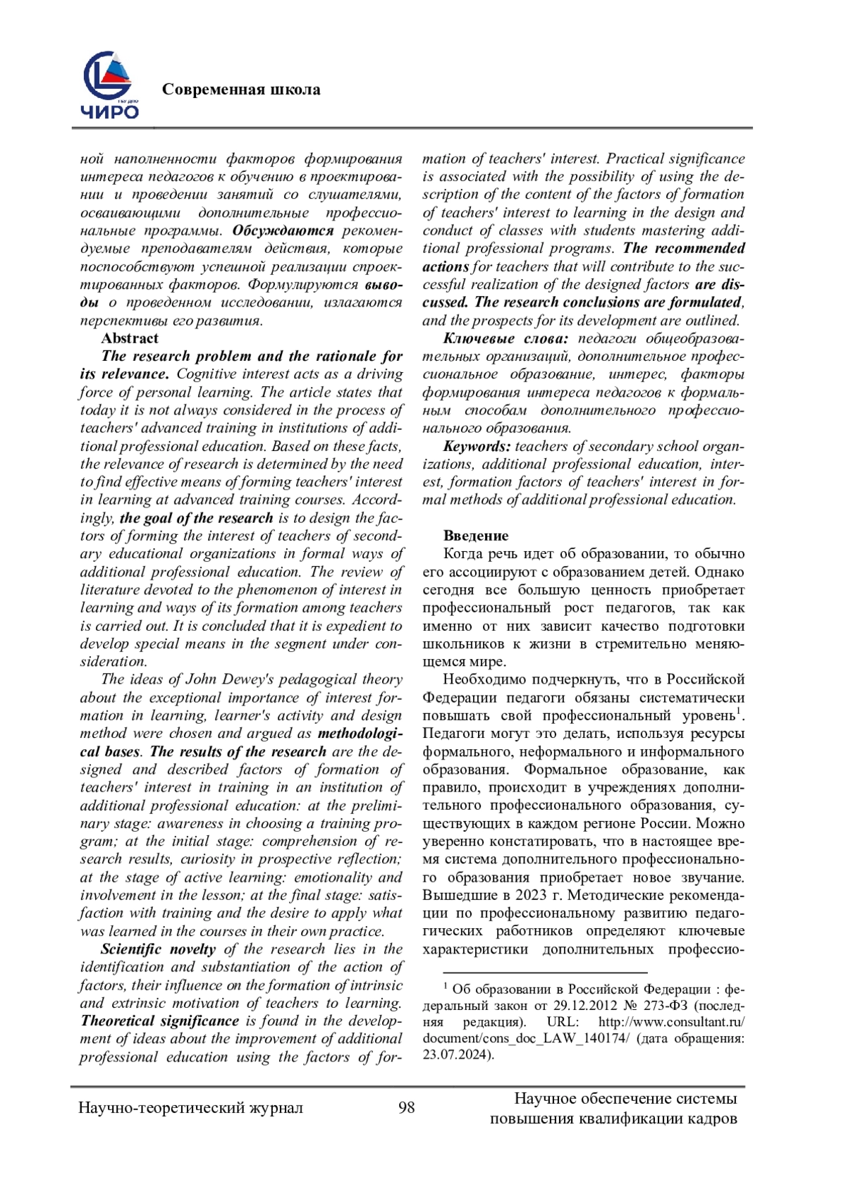 Проблема исследования и обоснование ее актуальности. Познавательный интерес выступает движущей силой обучения личности. В статье констатируется, что сегодня он не всегда учитывается в процессе повышения квалификации педагогов в учреждениях дополнительного профессионального образования. Исходя из этих оснований, актуальность исследования определяется необходимостью поиска действенных средств формирования интереса педагогов к обучению на курсах повышения квалификации. Соответственно, цель исследования состоит в проектировании факторов формирования интереса педагогов общеобразовательных организаций к формальным способам дополнительного профессионального образования. Проводится обзор литературы, посвященной феномену интереса в обучении и способам его формирования у педагогов. Делается вывод о целесообразности разработки специальных средств в рассматриваемом сегменте. В качестве методологических оснований выбраны и аргументированы идеи педагогической теории Джона Дьюи об исключительной важности формировании интереса в обучении, активности обучающегося и метод проектирования. Результатами исследования выступают спроектированные и описанные факторы формирования интереса педагогов к обучению в учреждении дополнительного профессионального образования: на предварительном этапе: осознанность в выборе программы обучения; на начальном этапе: осмысленность результатов исследования, любознательность в осуществлении проспективной рефлексии; на этапе активного обучения: эмоциональность и вовлеченность в занятие; на завершающем этапе: удовлетворенность обучением и желание применять освоенное на курсах в собственной практической деятельности. Научная новизна исследования заключается в выделении и обосновании действия факторов, их влияния на формирование внутреннего и внешней мотивации педагогов к обучению Теоретическая значимость обнаруживается в развитии представлений о совершенствовании дополнительного профессионального образования с использованием факторов формирования интереса педагогов. Практическая значимость связана с возможностью использования описания содержательной наполненности факторов формирования интереса педагогов к обучению в проектировании и проведении занятий со слушателями, осваивающими дополнительные профессиональные программы. Обсуждаются рекомендуемые преподавателям действия, которые поспособствуют успешной реализации спроектированных факторов. Формулируются выводы о проведенном исследовании, излагаются перспективы его развития.