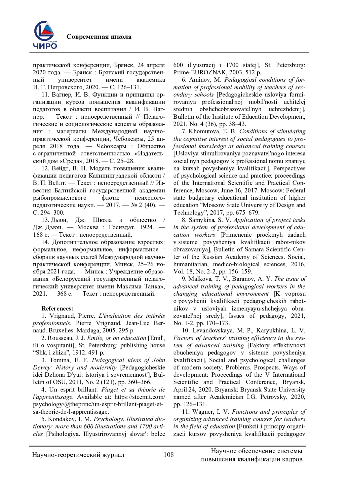 10. Левандовская, М. П. Факторы эффективности обучения педагогов в системе повышения квалификации / М. П. Левандовская, Л. В. Карюхина. - Текст: непосредственный // Социально-психологические вызовы современного общества. Проблемы. Перспективы. Пути развития: материалы V Международной научно-практической конференции, Брянск, 24 апреля 2020 года. - Брянск: Брянский государственный университет имени академика И. Г. Петровского, 2020. - С. 126-131. EDN: VCQFZE