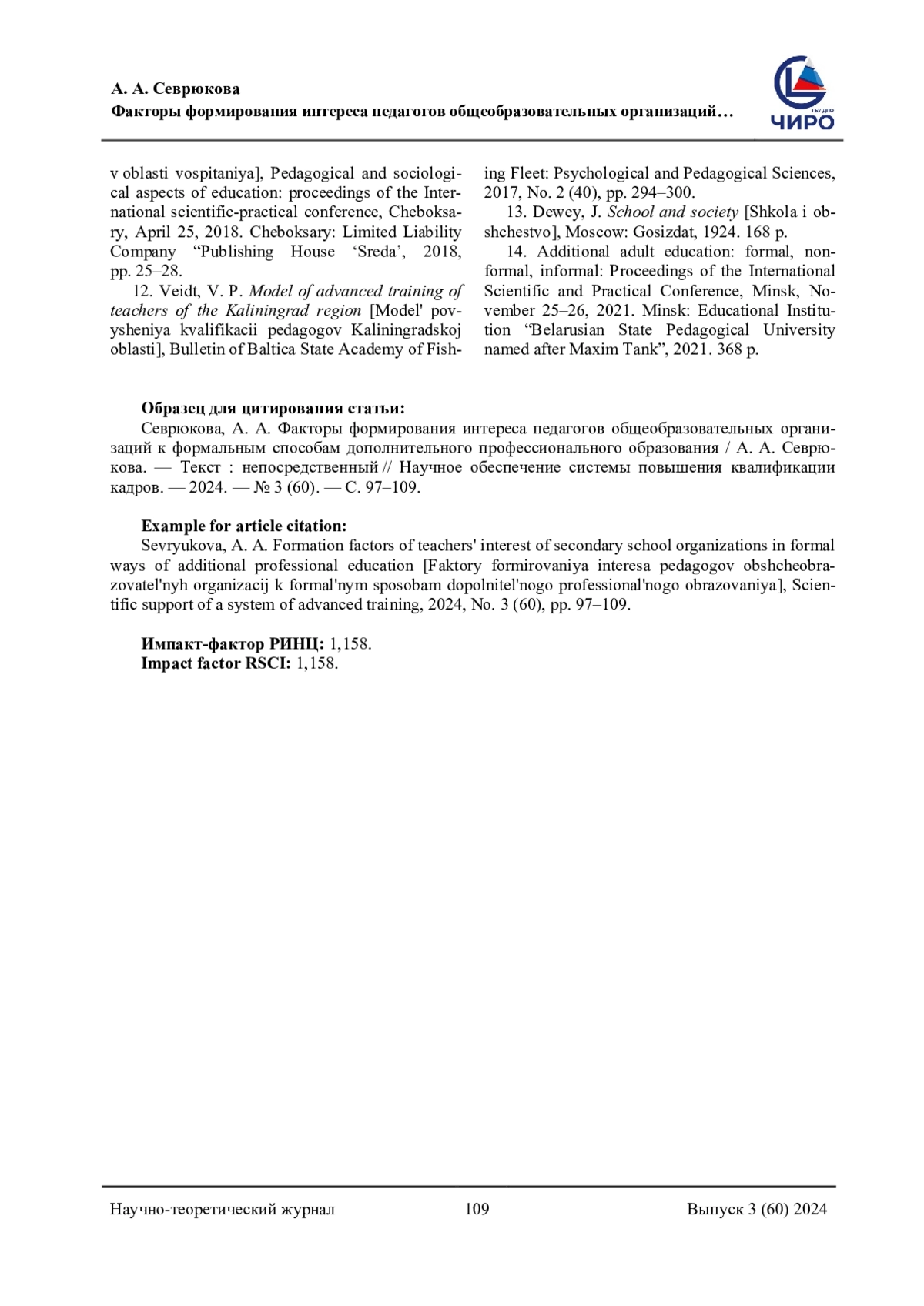 12. Вейдт, В. П. Модель повышения квалификации педагогов Калининградской области / В. П. Вейдт. - Текст: непосредственный // Известия Балтийской государственной академии рыбопромыслового флота: психолого-педагогические науки. - 2017. - № 2 (40). - С. 294-300. EDN: YTPKWT