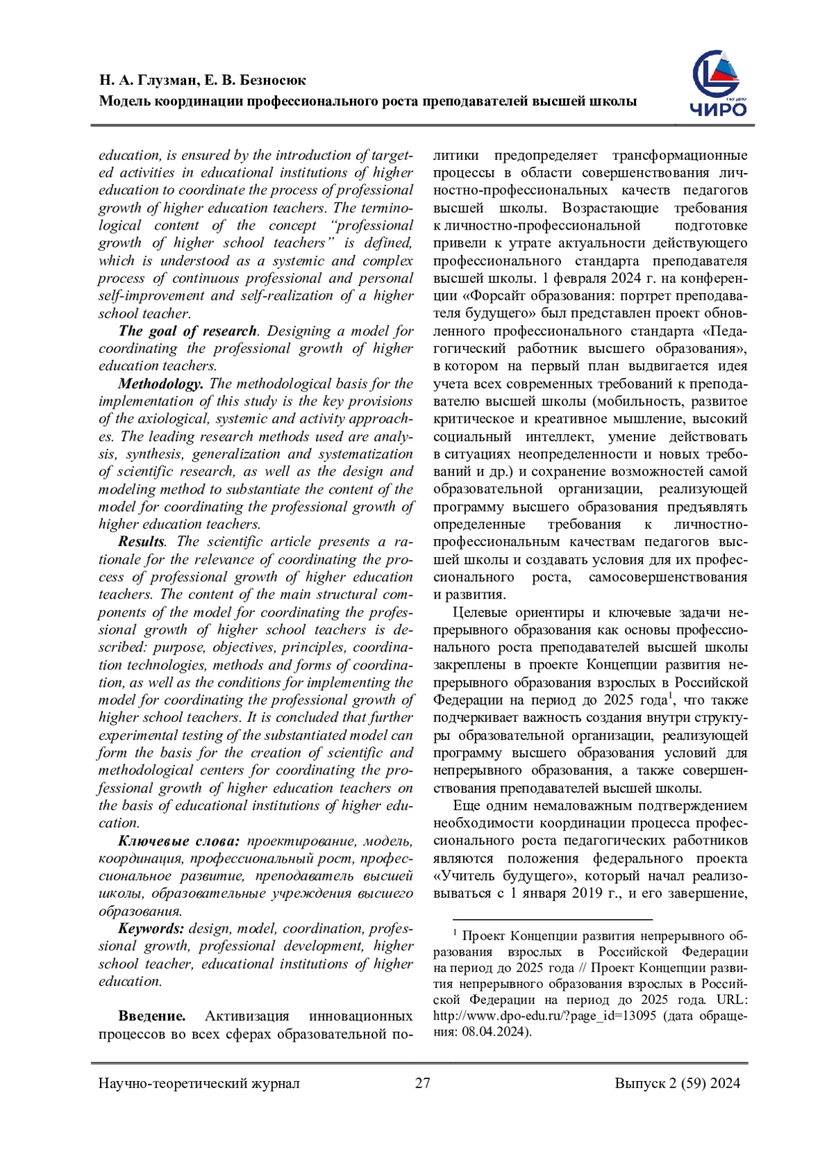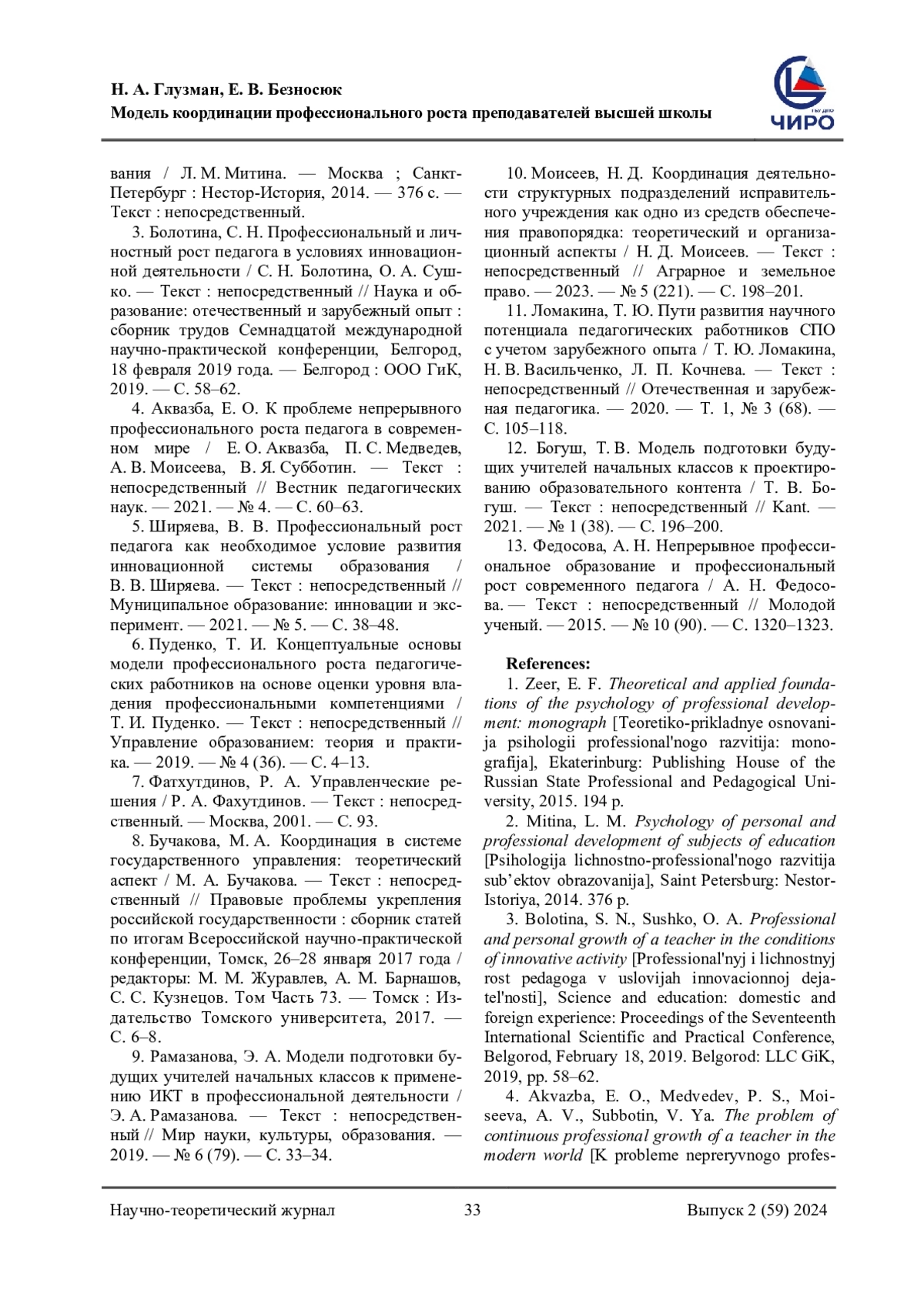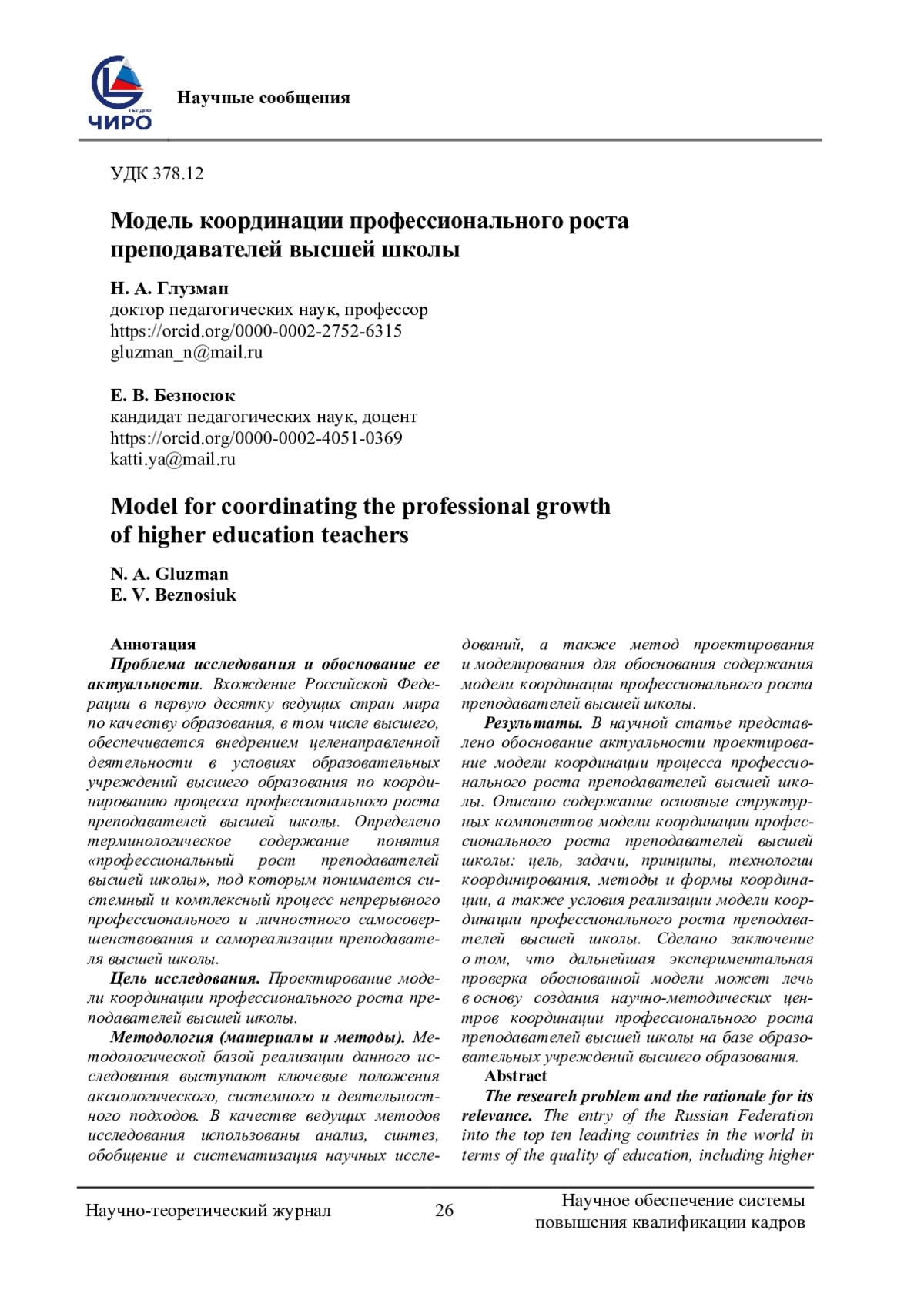 ГЛУЗМАН Н. А., БЕЗНОСЮК Е. В. МОДЕЛЬ КООРДИНАЦИИ ПРОФЕССИОНАЛЬНОГО РОСТА ПРЕПОДАВАТЕЛЕЙ ВЫСШЕЙ ШКОЛЫ // НАУЧНОЕ ОБЕСПЕЧЕНИЕ СИСТЕМЫ ПОВЫШЕНИЯ КВАЛИФИКАЦИИ КАДРОВ. 2024. № 2 (59)