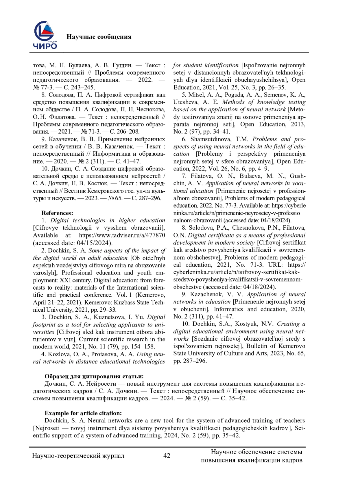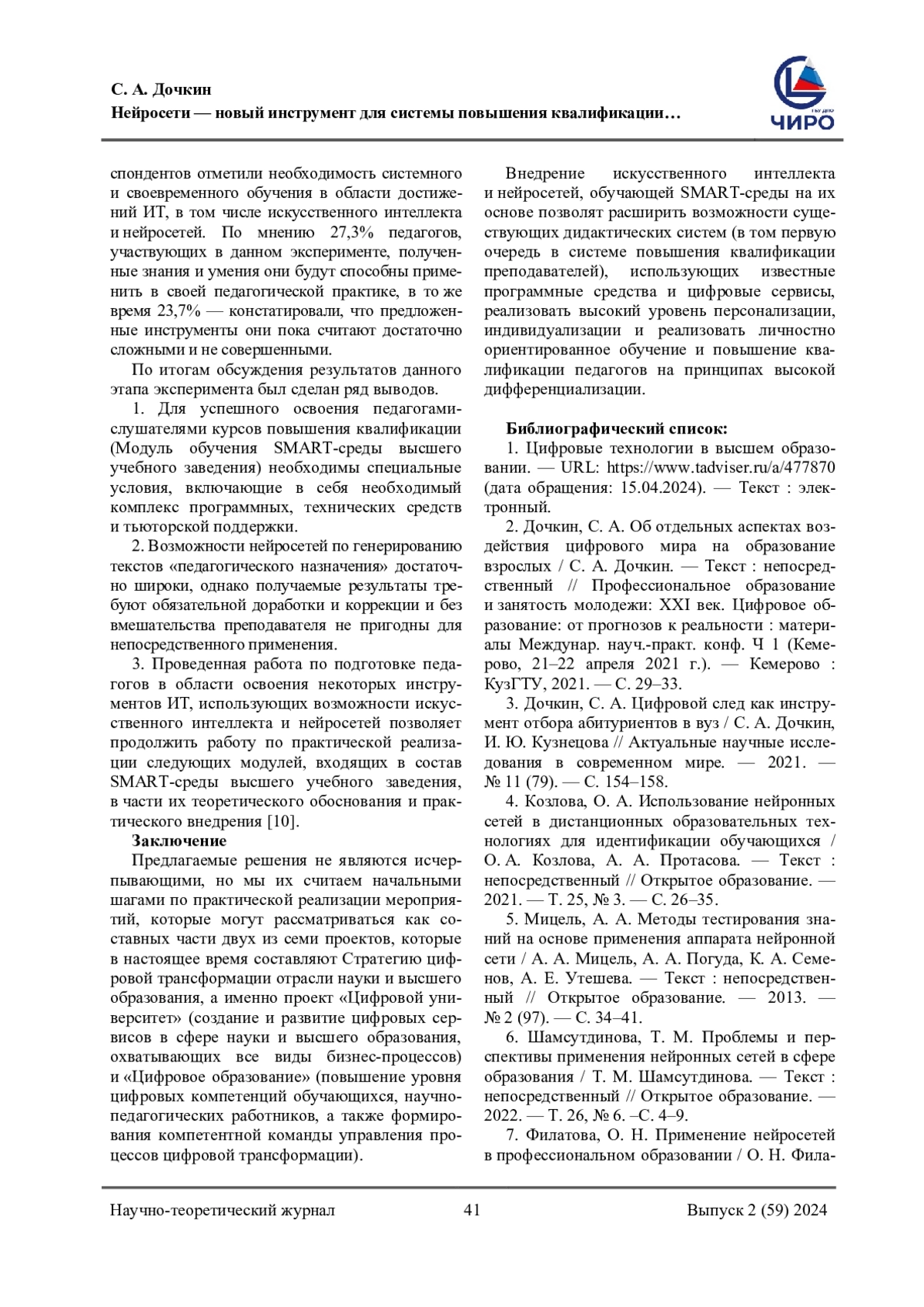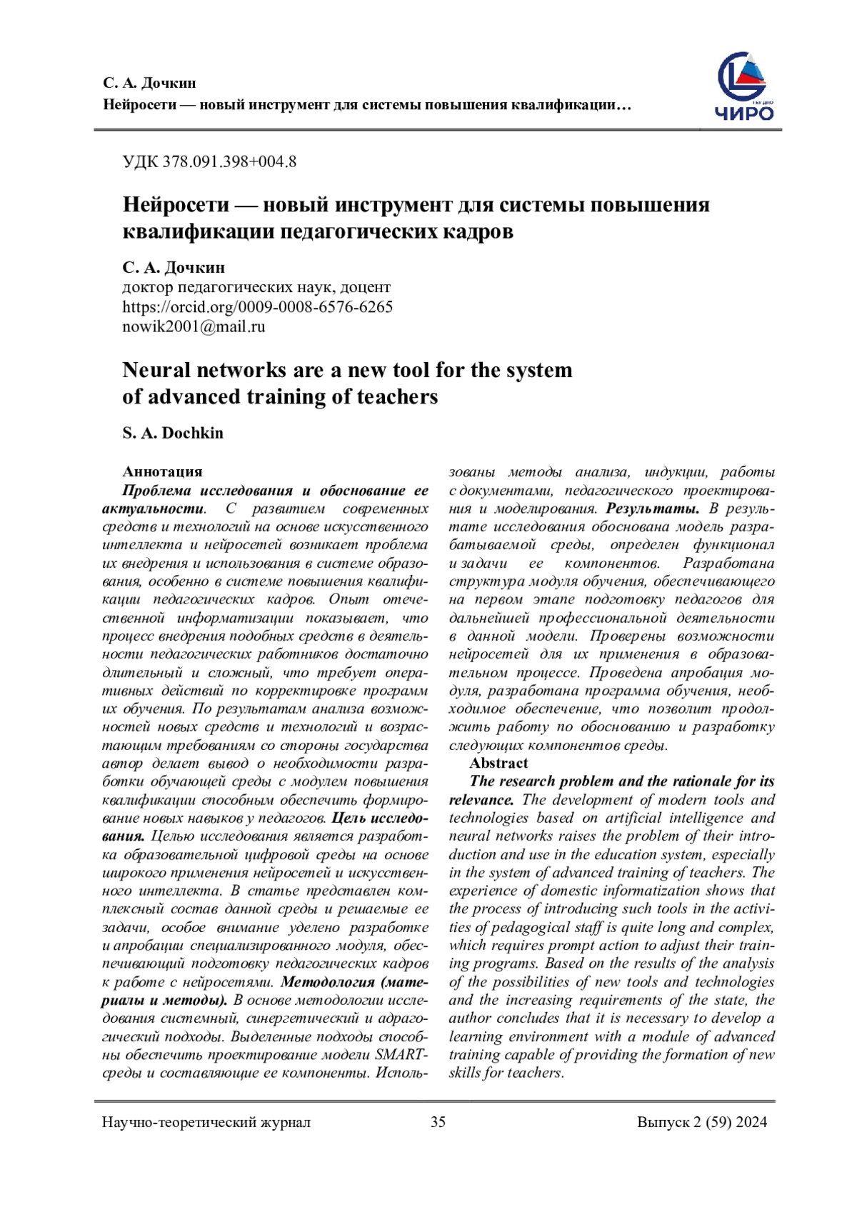 ДОЧКИН С. А. НЕЙРОСЕТИ - НОВЫЙ ИНСТРУМЕНТ ДЛЯ СИСТЕМЫ ПОВЫШЕНИЯ КВАЛИФИКАЦИИ ПЕДАГОГИЧЕСКИХ КАДРОВ // НАУЧНОЕ ОБЕСПЕЧЕНИЕ СИСТЕМЫ ПОВЫШЕНИЯ КВАЛИФИКАЦИИ КАДРОВ. 2024. № 2 (59)
