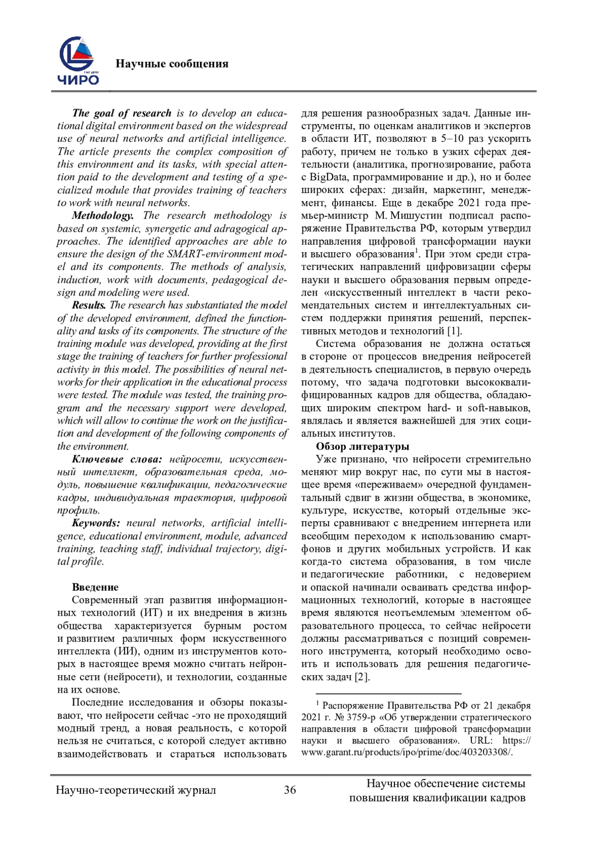 Проблема исследования и обоснование ее актуальности. С развитием современных средств и технологий на основе искусственного интеллекта и нейросетей возникает проблема их внедрения и использования в системе образования, особенно в системе повышения квалификации педагогических кадров. Опыт отечественной информатизации показывает, что процесс внедрения подобных средств в деятельности педагогических работников достаточно длительный и сложный, что требует оперативных действий по корректировке программ их обучения. По результатам анализа возможностей новых средств и технологий и возрастающим требованиям со стороны государства автор делает вывод о необходимости разработки обучающей среды с модулем повышения квалификации способным обеспечить формирование новых навыков у педагогов. Цель исследования. Целью исследования является разработка образовательной цифровой среды на основе широкого применения нейросетей и искусственного интеллекта. В статье представлен комплексный состав данной среды и решаемые ее задачи, особое внимание уделено разработке и апробации специализированного модуля, обеспечивающий подготовку педагогических кадров к работе с нейросетями. Методология (материалы и методы). В основе методологии исследования системный, синергетический и адрагогический подходы. Выделенные подходы способны обеспечить проектирование модели SMART-среды и составляющие ее компоненты. Использованы методы анализа, индукции, работы с документами, педагогического проектирования и моделирования.