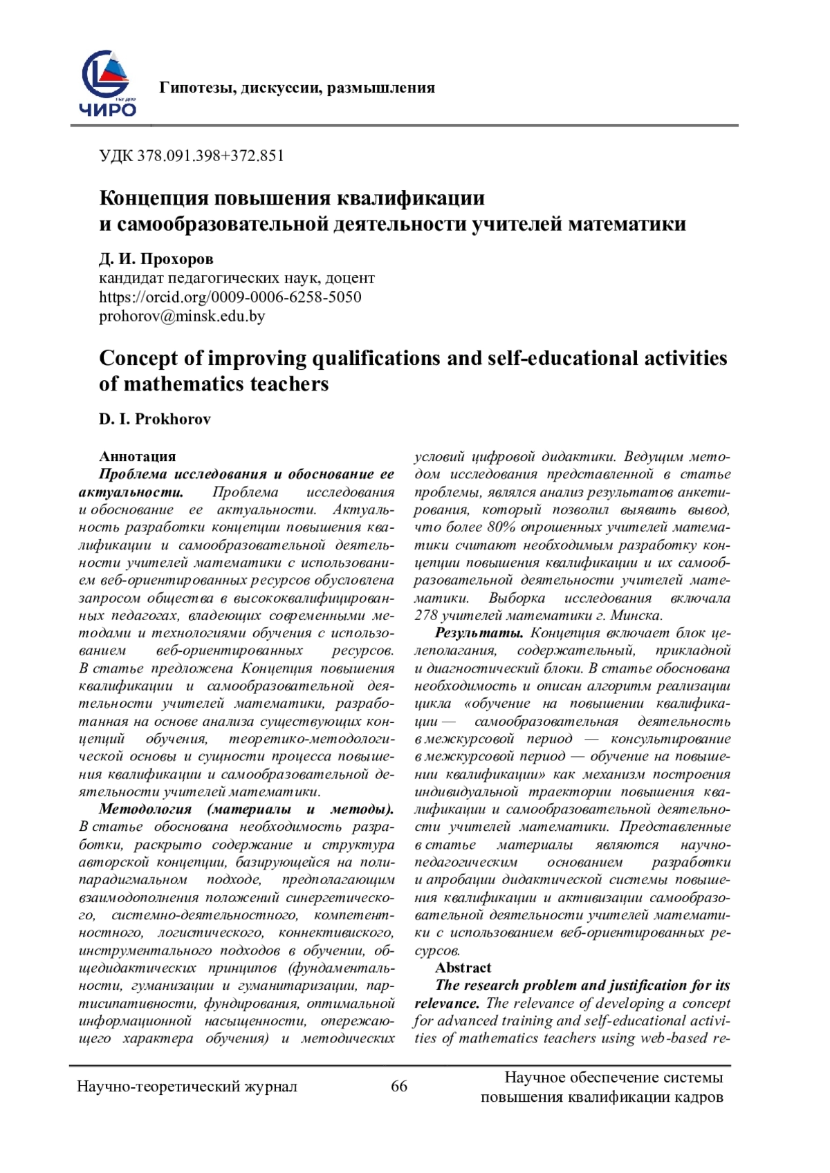 Проблема исследования и обоснование ее актуальности. Проблема исследования и обоснование ее актуальности. Актуальность разработки концепции повышения квалификации и самообразовательной деятельности учителей математики с использованием веб-ориентированных ресурсов обусловлена запросом общества в высококвалифицированных педагогах, владеющих современными методами и технологиями обучения с использованием веб-ориентированных ресурсов. В статье предложена Концепция повышения квалификации и самообразовательной деятельности учителей математики, разработанная на основе анализа существующих концепций обучения, теоретико-методологической основы и сущности процесса повышения квалификации и самообразовательной деятельности учителей математики. Методология (материалы и методы). В статье обоснована необходимость разработки, раскрыто содержание и структура авторской концепции, базирующейся на полипарадигмальном подходе, предполагающим взаимодополнения положений синергетического, системно-деятельностного, компетентностного, логистического, коннективиского, инструментального подходов в обучении, общедидактических принципов (фундаментальности, гуманизации и гуманитаризации, партисипативности, фундирования, оптимальной информационной насыщенности, опережающего характера обучения) и методических условий цифровой дидактики. Ведущим методом исследования представленной в статье проблемы, являлся анализ результатов анкетирования, который позволил выявить вывод, что более 80% опрошенных учителей математики считают необходимым разработку концепции повышения квалификации и их самообразовательной деятельности учителей математики. Выборка исследования включала 278 учителей математики г. Минска. Результаты. Концепция включает блок целеполагания, содержательный, прикладной и диагностический блоки. В статье обоснована необходимость и описан алгоритм реализации цикла «обучение на повышении квалификации - самообразовательная деятельность в межкурсовой период - консультирование в межкурсовой период - обучение на повышении квалификации» как механизм построения индивидуальной траектории повышения квалификации и самообразовательной деятельности учителей математики. Представленные в статье материалы являются научно-педагогическим основанием разработки и апробации дидактической системы повышения квалификации и активизации самообразовательной деятельности учителей математики с использованием веб-ориентированных ресурсов.