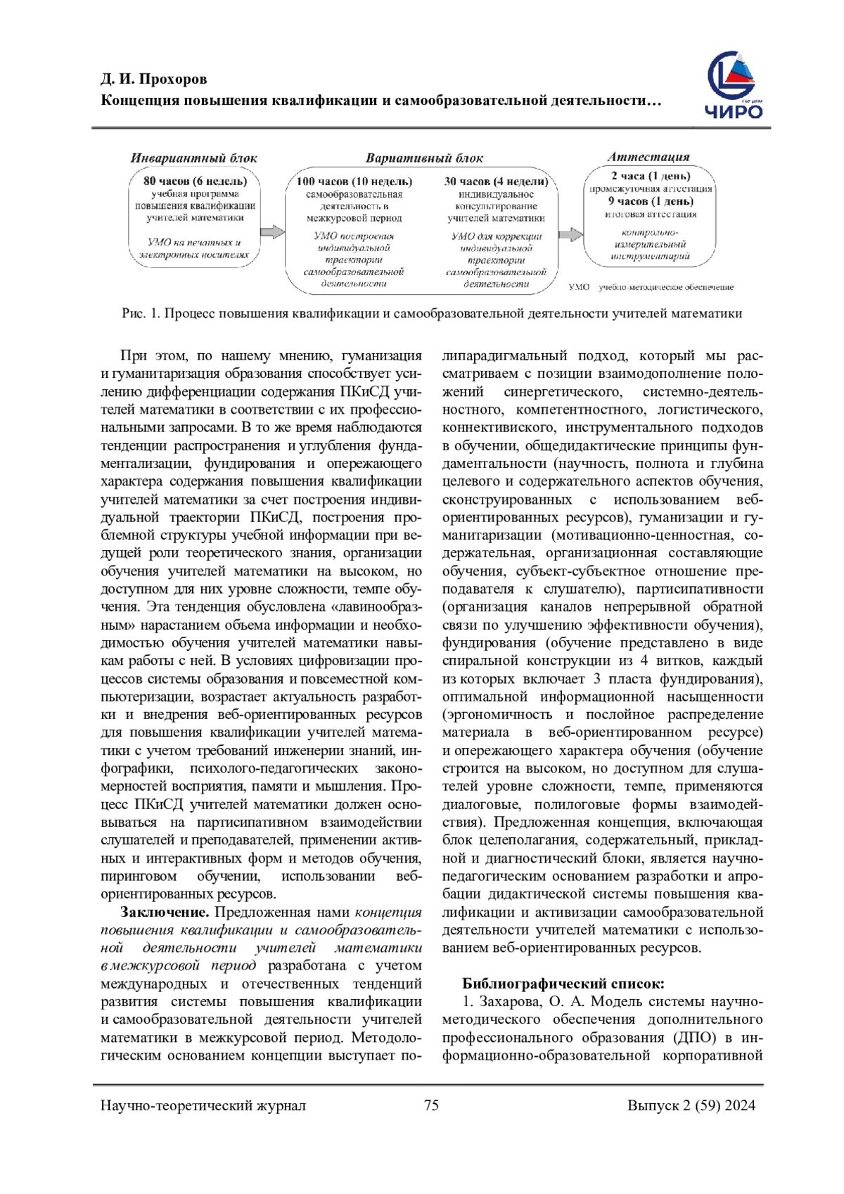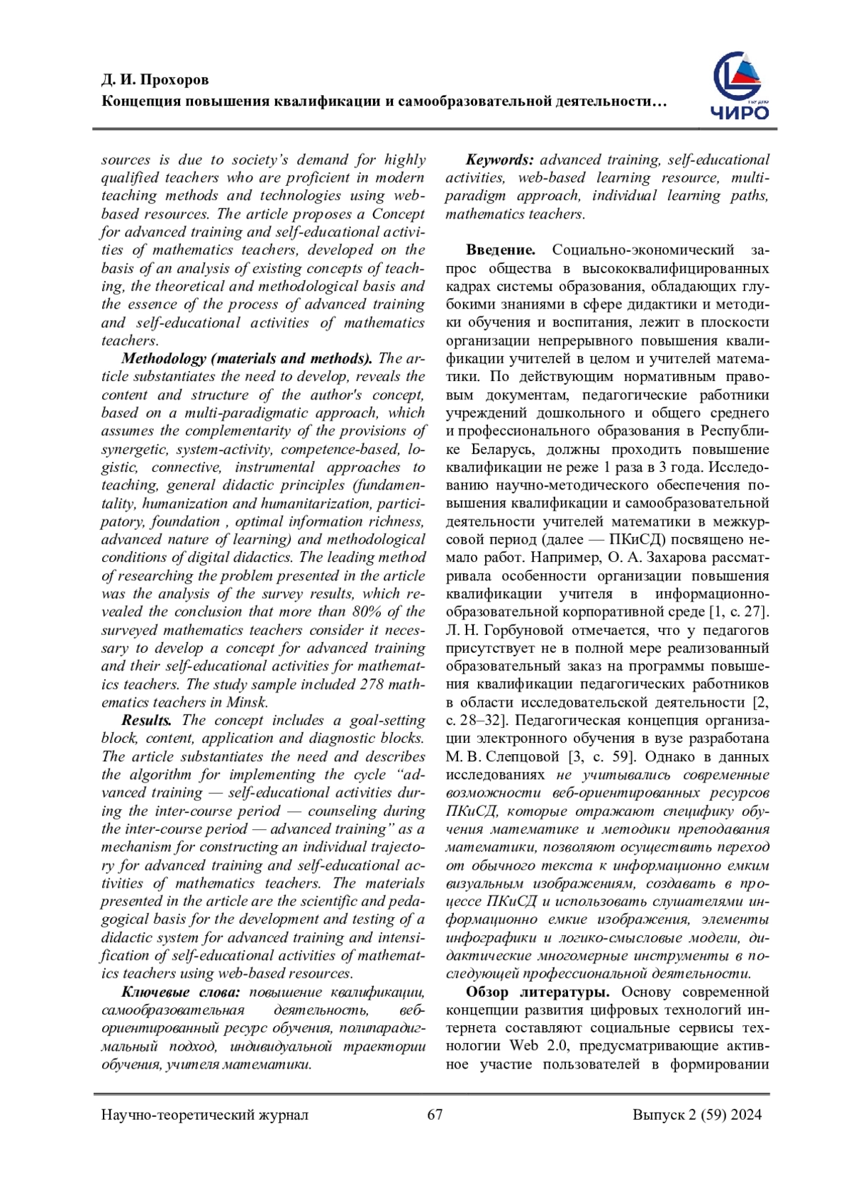 1. Захарова, О. А. Модель системы научно-методического обеспечения дополнительного профессионального образования (ДПО) в информационно-образовательной корпоративной среде / О. А. Захарова. - Текст: непосредственный // Образовательные технологии и общество. - 2017. - № 3. - С. 26-34. EDN: ZRUZOD