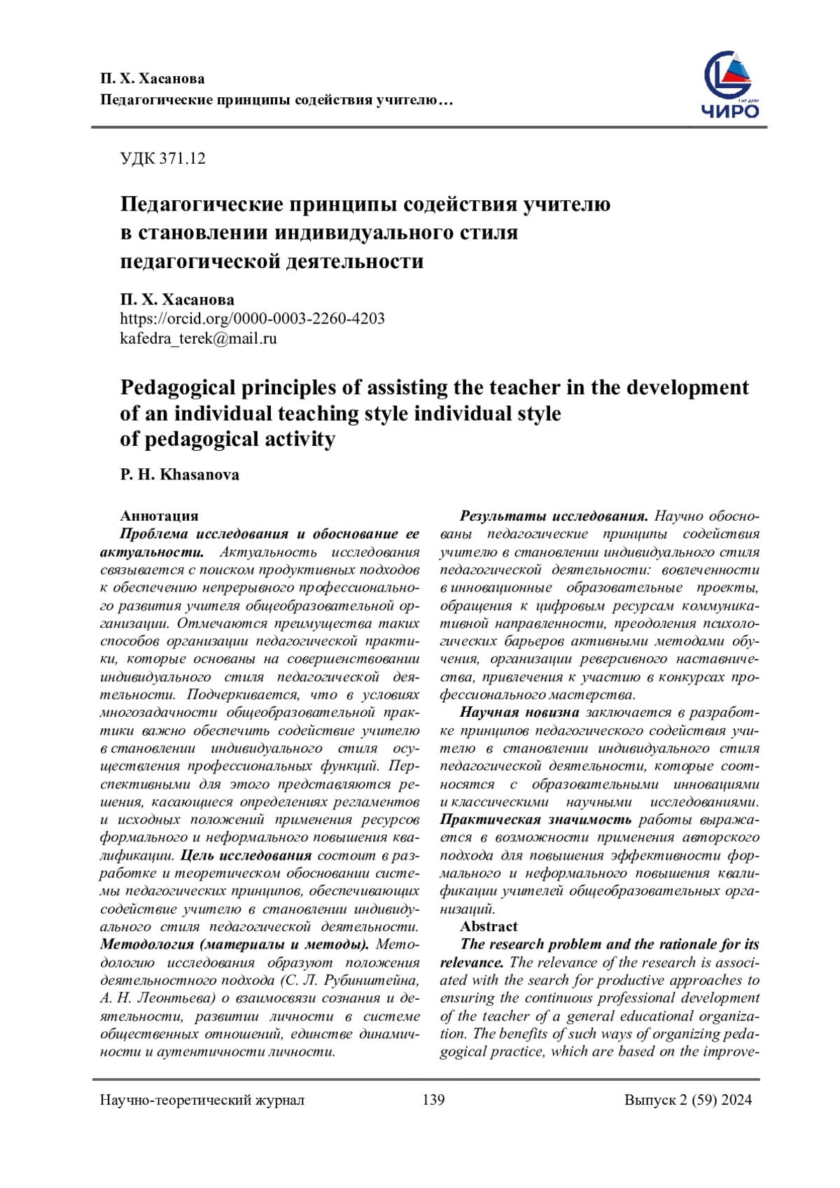 Проблема исследования и обоснование ее актуальности. Актуальность исследования связывается с поиском продуктивных подходов к обеспечению непрерывного профессионального развития учителя общеобразовательной организации. Отмечаются преимущества таких способов организации педагогической практики, которые основаны на совершенствовании индивидуального стиля педагогической деятельности. Подчеркивается, что в условиях многозадачности общеобразовательной практики важно обеспечить содействие учителю в становлении индивидуального стиля осуществления профессиональных функций. Перспективными для этого представляются решения, касающиеся определениях регламентов и исходных положений применения ресурсов формального и неформального повышения квалификации. Цель исследования состоит в разработке и теоретическом обосновании системы педагогических принципов, обеспечивающих содействие учителю в становлении индивидуального стиля педагогической деятельности. Методология (материалы и методы). Методологию исследования образуют положения деятельностного подхода (С. Л. Рубинштейна, А. Н. Леонтьева) о взаимосвязи сознания и деятельности, развитии личности в системе общественных отношений, единстве динамичности и аутентичности личности. Результаты исследования. Научно обоснованы педагогические принципы содействия учителю в становлении индивидуального стиля педагогической деятельности: вовлеченности в инновационные образовательные проекты, обращения к цифровым ресурсам коммуникативной направленности, преодоления психологических барьеров активными методами обучения, организации реверсивного наставничества, привлечения к участию в конкурсах профессионального мастерства. Научная новизна заключается в разработке принципов педагогического содействия учителю в становлении индивидуального стиля педагогической деятельности, которые соотносятся с образовательными инновациями и классическими научными исследованиями. Практическая значимость работы выражается в возможности применения авторского подхода для повышения эффективности формального и неформального повышения квалификации учителей общеобразовательных организаций.