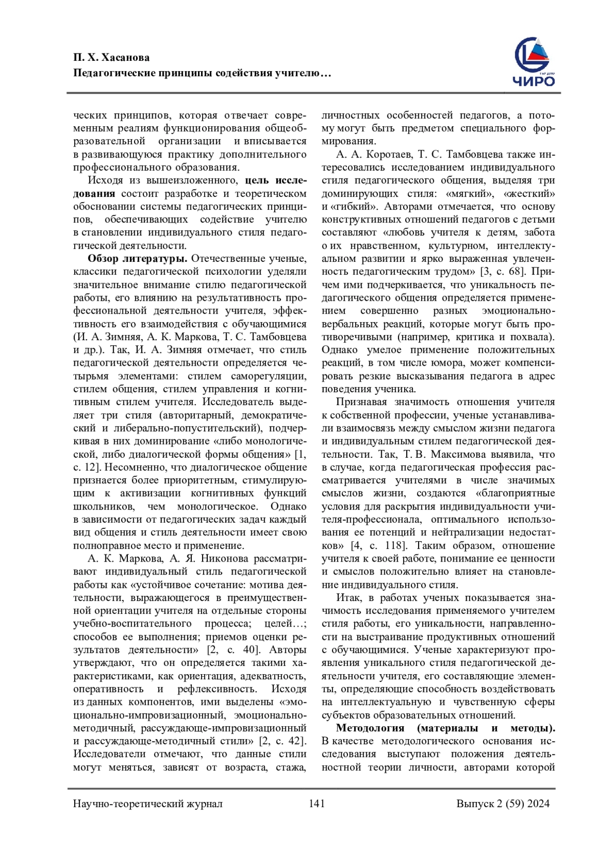 3. Коротаев, А. А. Исследование индивидуального стиля педагогического общения / А. А. Коротаев, Т. С. Тамбовцева. - Текст: непосредственный // Вопросы психологии. - 1990. - Т. 1. - С. 62-69.