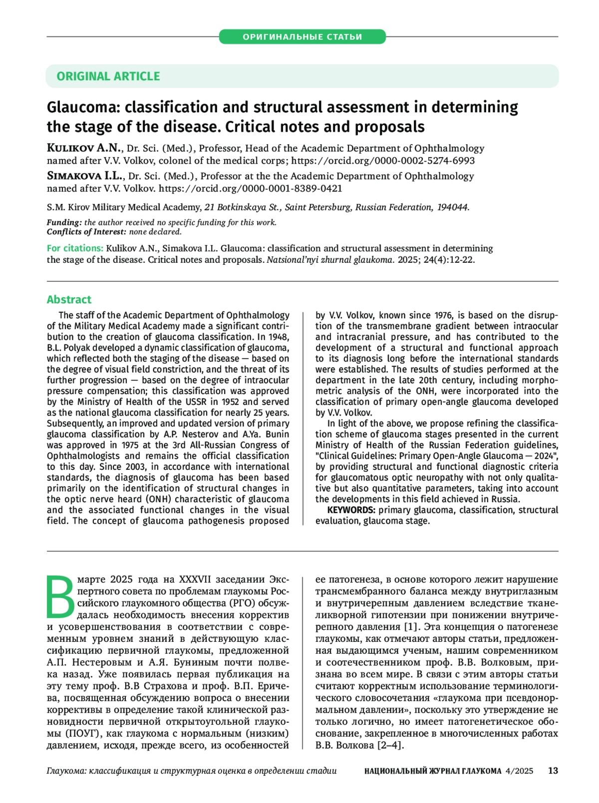 КУЛИКОВ А. Н., СИМАКОВА И. В. ГЛАУКОМА: КЛАССИФИКАЦИЯ И СТРУКТУРНАЯ ОЦЕНКА В ОПРЕДЕЛЕНИИ СТАДИИ ЗАБОЛЕВАНИЯ. КРИТИЧЕСКИЕ ЗАМЕТКИ И ПРЕДЛОЖЕНИЯ // НАЦИОНАЛЬНЫЙ ЖУРНАЛ ГЛАУКОМА. 2025. № 4, ТОМ 24