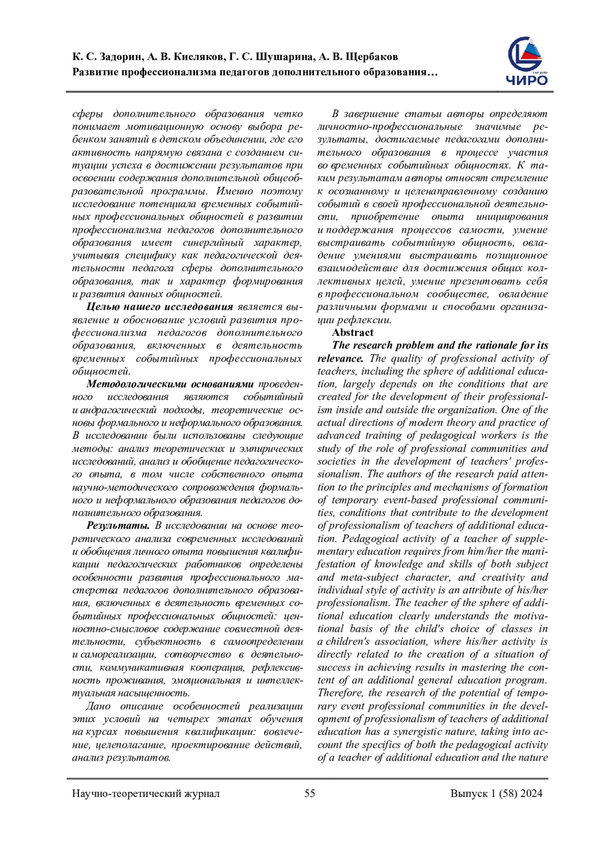Проблема исследования и обоснование ее актуальности. Качество профессиональной деятельности педагогов, в том числе сферы дополнительного образования, во многом зависит от условий, которые создаются для развития их профессионализма внутри организации и за ее пределами. Одним из актуальных направлений современной теории и практики повышения квалификации педагогических работников является изучение роли профессиональных сообществ и общностей в развитии профессионализма педагогов. В исследовании авторы уделили внимание принципам и механизмам формирования временных событийных профессиональных общностей, условиям, способствующим развитию профессионализма педагогов дополнительного образования. Педагогическая деятельность педагога дополнительного образования, требует от него проявления знаний и умений как предметного и метапредметного характера, а творчество и индивидуальный стиль деятельности является атрибутом его профессионализма. Педагог сферы дополнительного образования четко понимает мотивационную основу выбора ребенком занятий в детском объединении, где его активность напрямую связана с созданием ситуации успеха в достижении результатов при освоении содержания дополнительной общеобразовательной программы. Именно поэтому исследование потенциала временных событийных профессиональных общностей в развитии профессионализма педагогов дополнительного образования имеет синергийный характер, учитывая специфику как педагогической деятельности педагога сферы дополнительного образования, так и характер формирования и развития данных общностей. Целью нашего исследования является выявление и обоснование условий развития профессионализма педагогов дополнительного образования, включенных в деятельность временных событийных профессиональных общностей. Методологическими основаниями проведенного исследования являются событийный и андрагогический подходы, теоретические основы формального и неформального образования. В исследовании были использованы следующие методы: анализ теоретических и эмпирических исследований, анализ и обобщение педагогического опыта, в том числе собственного опыта научно-методического сопровождения формального и неформального образования педагогов дополнительного образования. Результаты. В исследовании на основе теоретического анализа современных исследований и обобщения личного опыта повышения квалификации педагогических работников определены особенности развития профессионального мастерства педагогов дополнительного образования, включенных в деятельность временных событийных профессиональных общностей: ценностно-смысловое содержание совместной деятельности, субъектность в самоопределении и самореализации, сотворчество в деятельности, коммуникативная кооперация, рефлексивность проживания, эмоциональная и интеллектуальная насыщенность. Дано описание особенностей реализации этих условий на четырех этапах обучения на курсах повышения квалификации: вовлечение, целеполагание, проектирование действий, анализ результатов. В завершение статьи авторы определяют личностно-профессиональные значимые результаты, достигаемые педагогами дополнительного образования в процессе участия во временных событийных общностях. К таким результатам авто