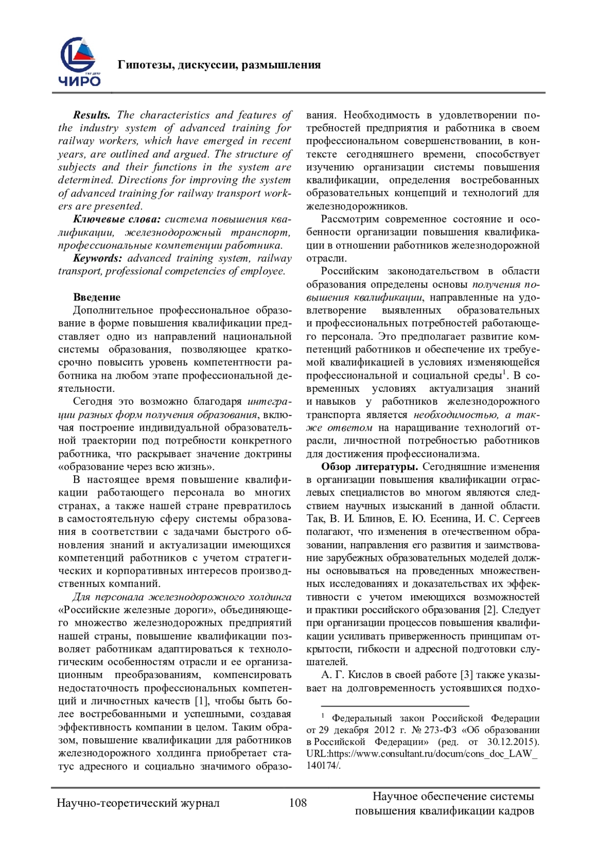 Проблема исследования и обоснование ее актуальности. Рассматриваемая проблема касается анализа научно-исследовательских материалов и нормативного обеспечения системы повышения квалификации персонала компании «Российские железные дороги», что создает возможности построения ее структуры и актуализации значимых характеристик для организации повышения квалификации работников железнодорожных предприятий с учетом особенностей функционирования отрасли. Цель исследования. Выделить методологические основания и взаимосвязь между субъектами отраслевой системы повышения квалификации для персонала железнодорожного транспорта. Раскрыть современные особенности организации дополнительного образования, которые способствуют повышению профессиональных компетенций работников отрасли. Методология (материалы и методы). Анализ научных подходов к совершенствованию отраслевой системы повышения квалификации, нормативно-правового обеспечения и корпоративных требований, их сопоставление применительно к повышению квалификации железнодорожников; структурирование субъектов отраслевой системы повышения квалификации компании «Российские железные дороги».