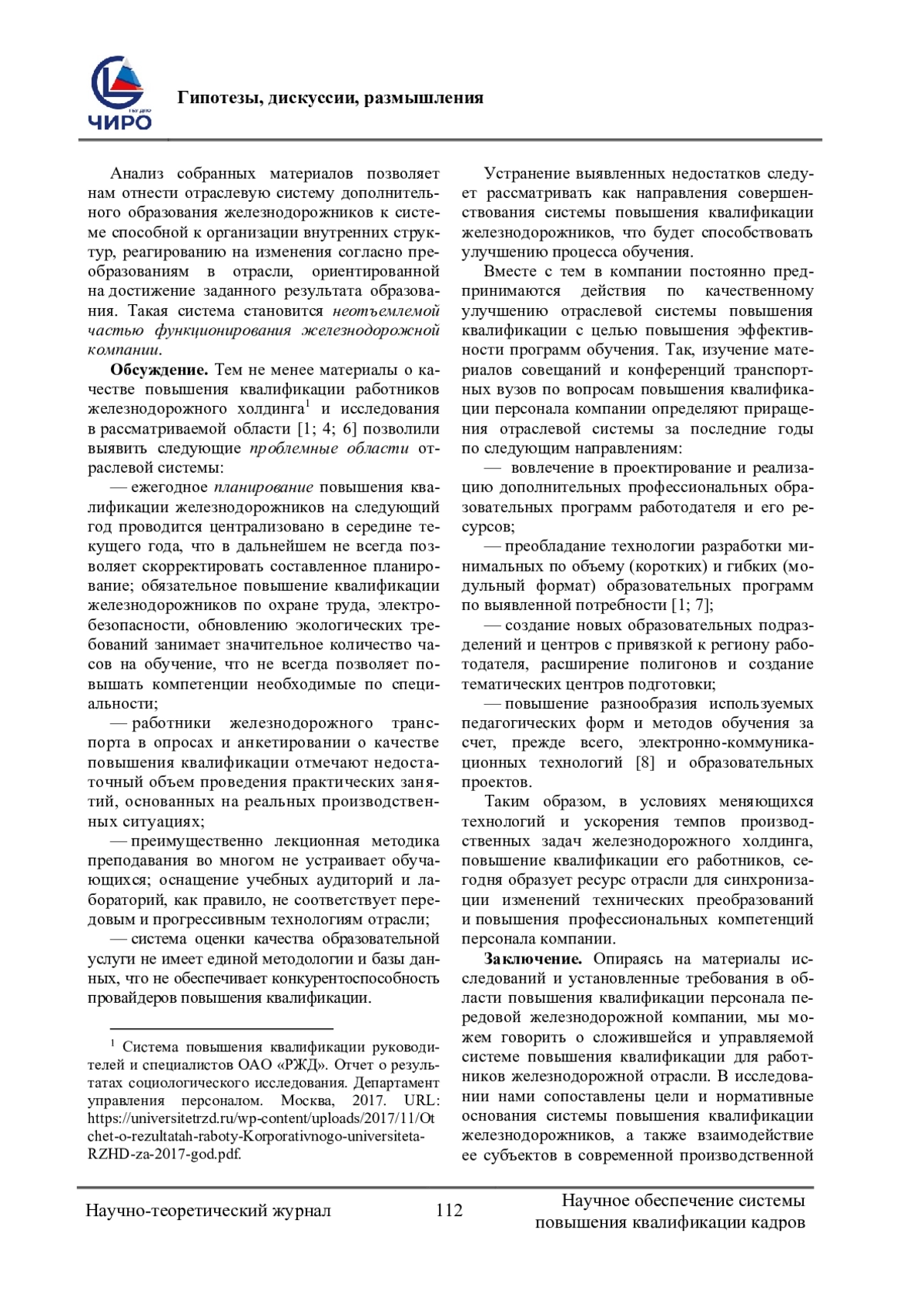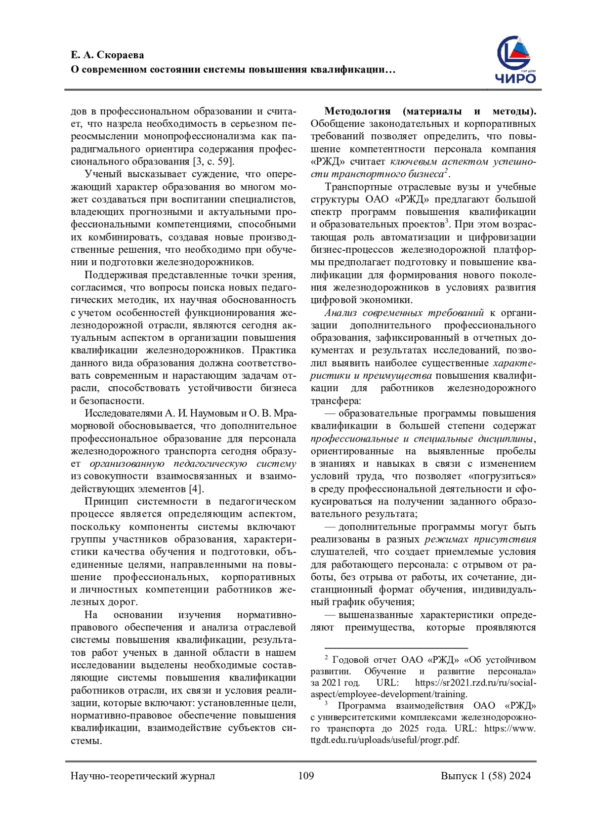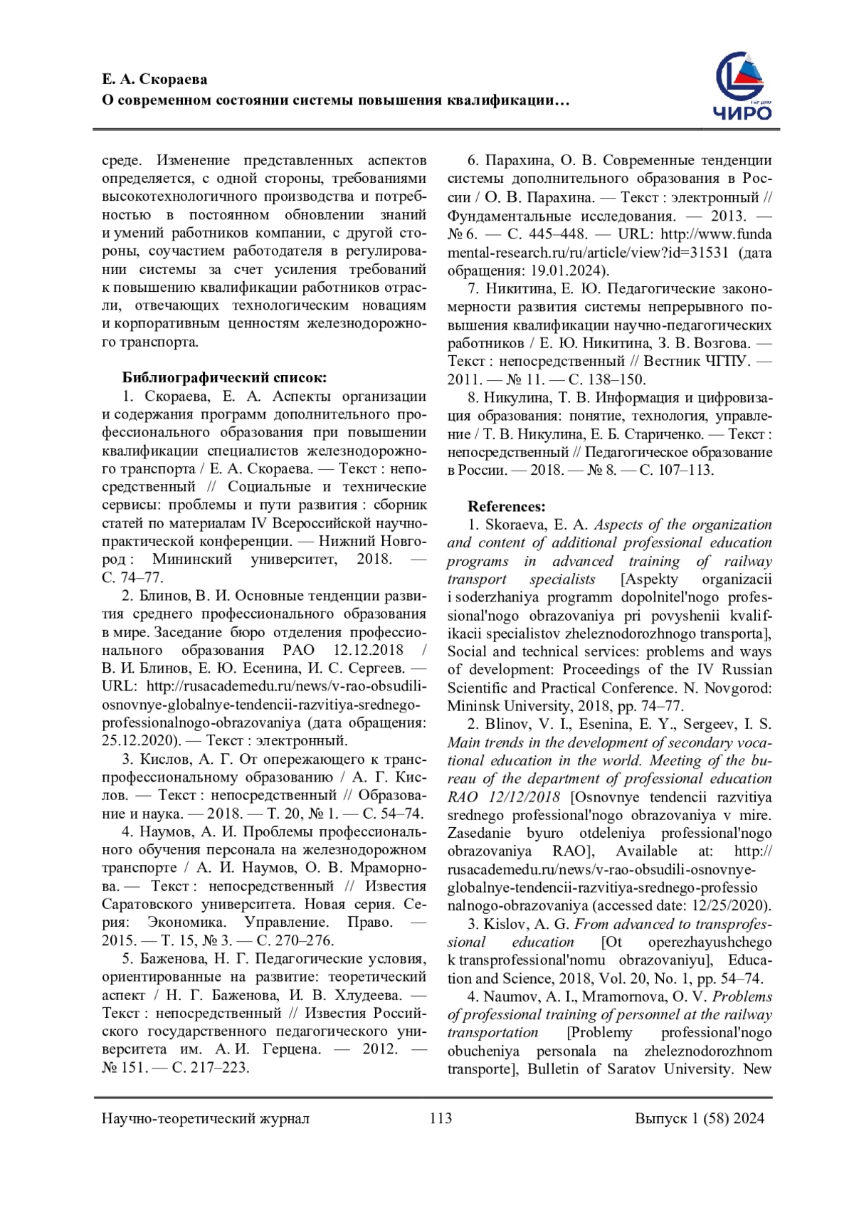 1. Скораева, Е. А. Аспекты организации и содержания программ дополнительного профессионального образования при повышении квалификации специалистов железнодорожного транспорта / Е. А. Скораева. - Текст: непосредственный // Социальные и технические сервисы: проблемы и пути развития: сборник статей по материалам IV Всероссийской научно-практической конференции. - Нижний Новгород: Мининский университет, 2018. - С. 74-77. EDN: VUKMKT