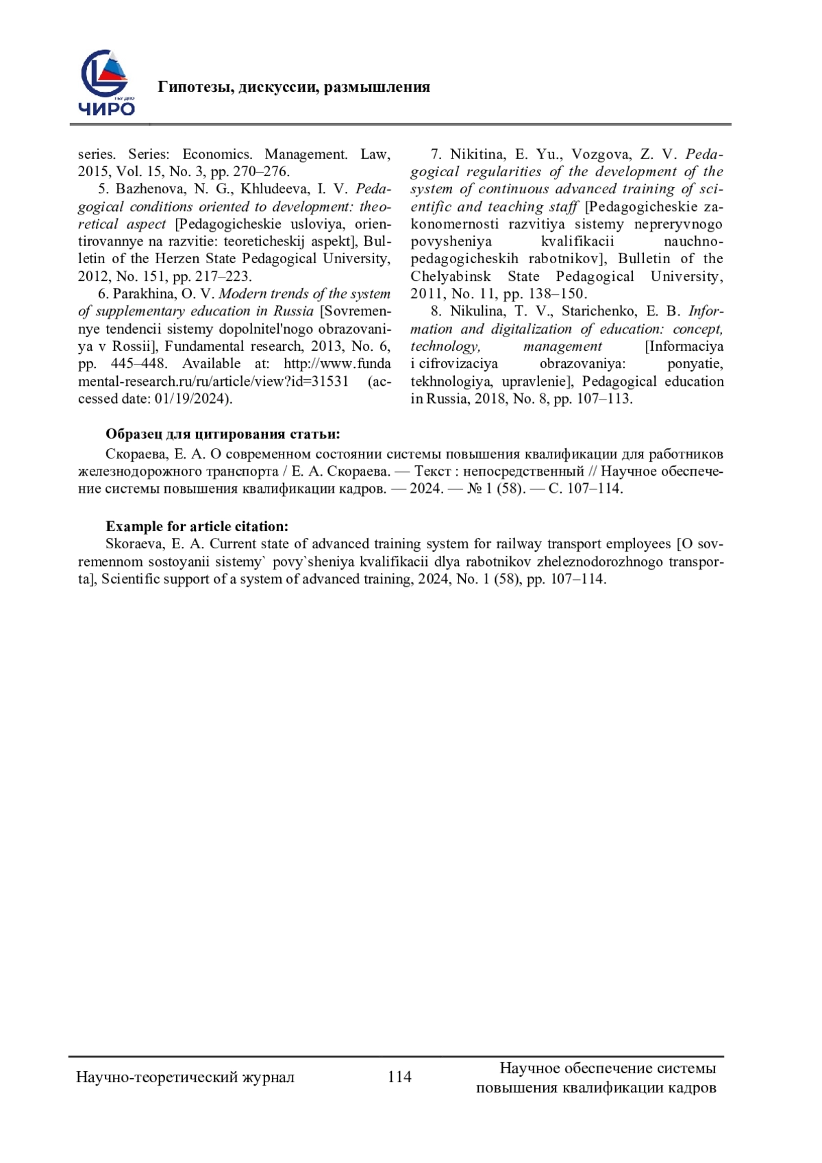 7. Никитина, Е. Ю. Педагогические закономерности развития системы непрерывного повышения квалификации научно-педагогических работников / Е. Ю. Никитина, З. В. Возгова. - Текст: непосредственный // Вестник ЧГПУ. - 2012. - № 11. - С. 138-150. EDN: PMGGAF