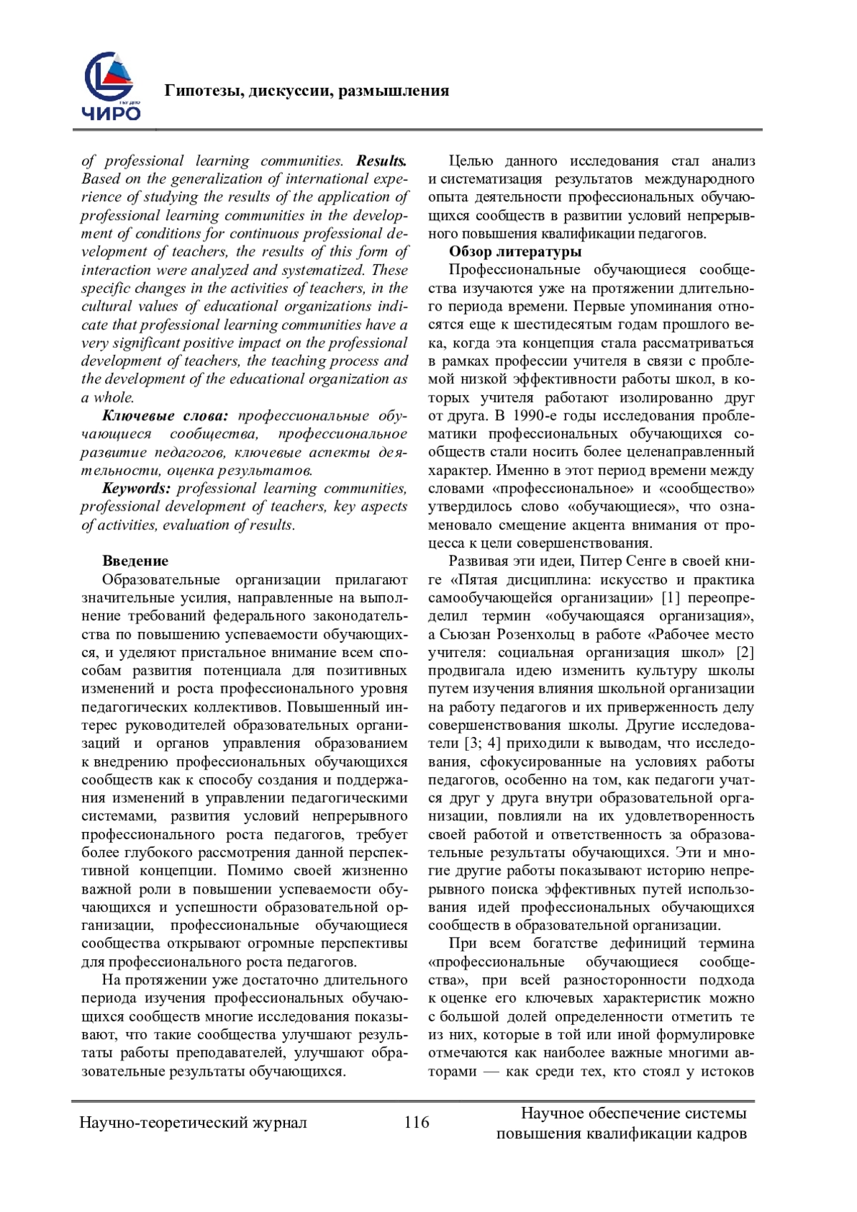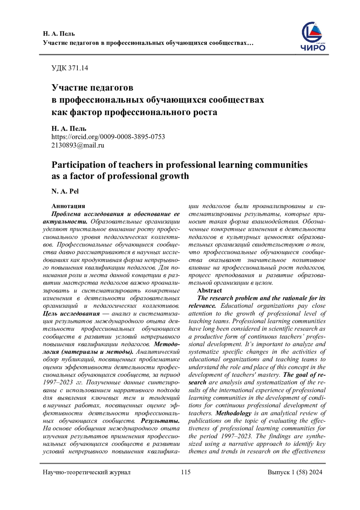 Проблема исследования и обоснование ее актуальности. Образовательные организации уделяют пристальное внимание росту профессионального уровня педагогических коллективов. Профессиональные обучающиеся сообщества давно рассматриваются в научных исследованиях как продуктивная форма непрерывного повышения квалификации педагогов. Для понимания роли и места данной концепции в развитии мастерства педагогов важно проанализировать и систематизировать конкретные изменения в деятельности образовательных организаций и педагогических коллективов. Цель исследования - анализ и систематизация результатов международного опыта деятельности профессиональных обучающихся сообществ в развитии условий непрерывного повышения квалификации педагогов. Методология (материалы и методы). Аналитический обзор публикаций, посвященных проблематике оценки эффективности деятельности профессиональных обучающихся сообществ, за период 1997-2023 гг. Полученные данные синтезированы с использованием нарративного подхода для выявления ключевых тем и тенденций в научных работах, посвященных оценке эффективности деятельности профессиональных обучающихся сообществ.