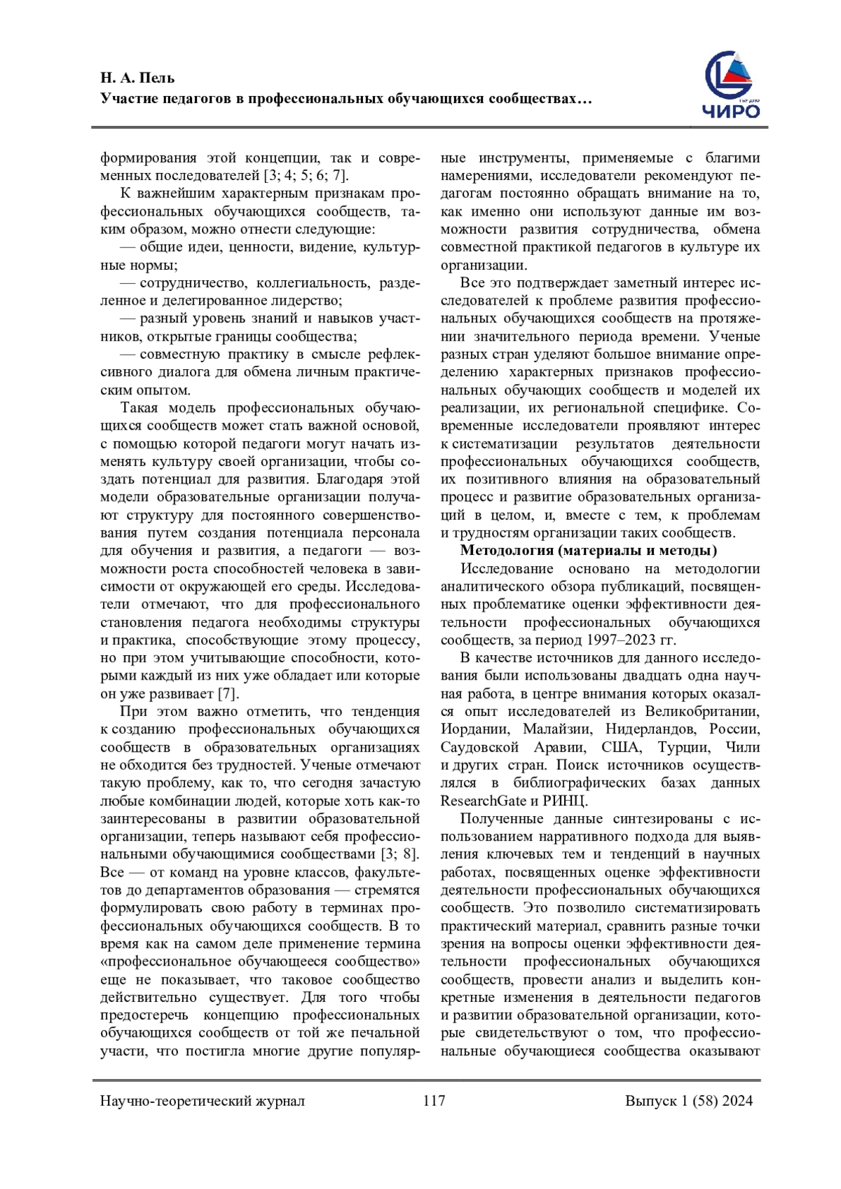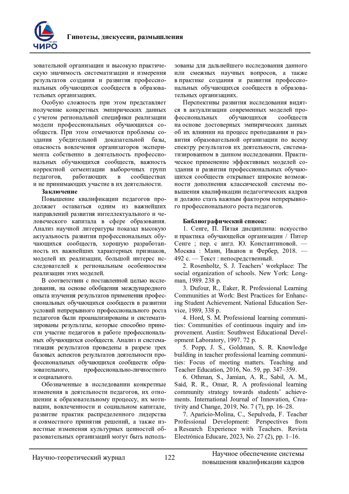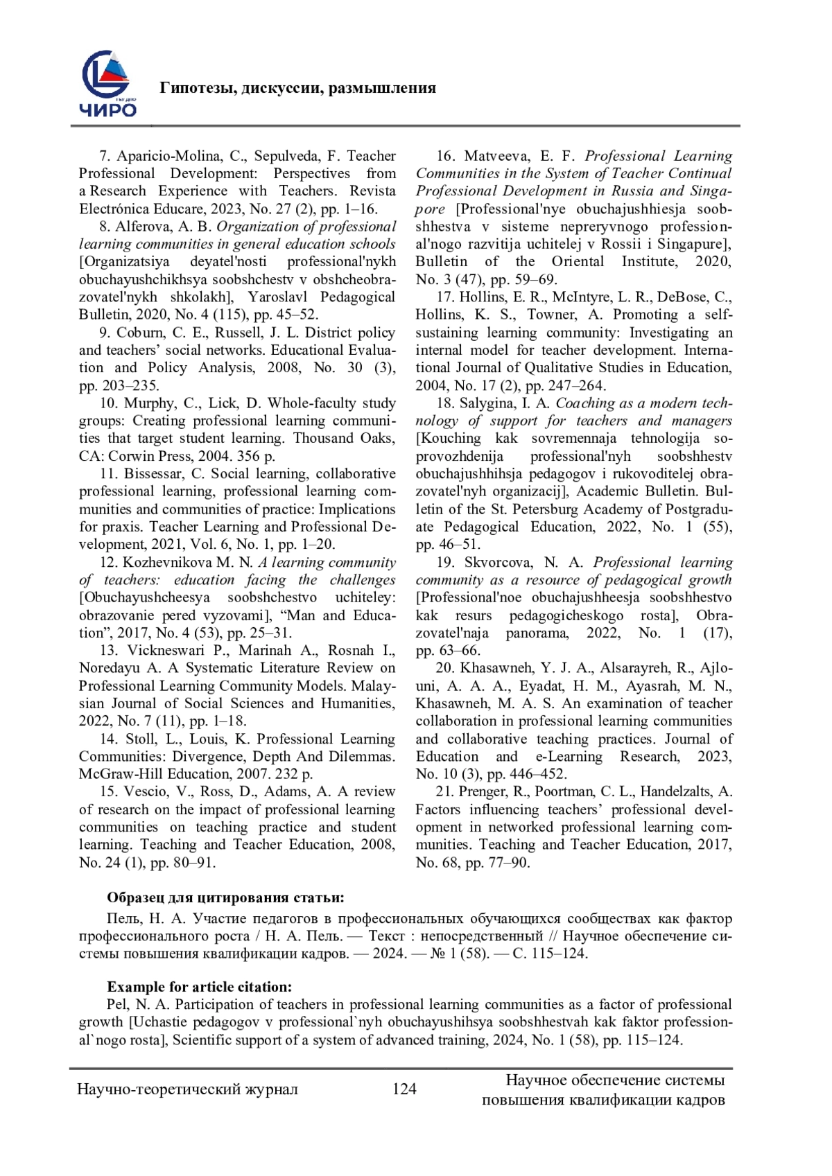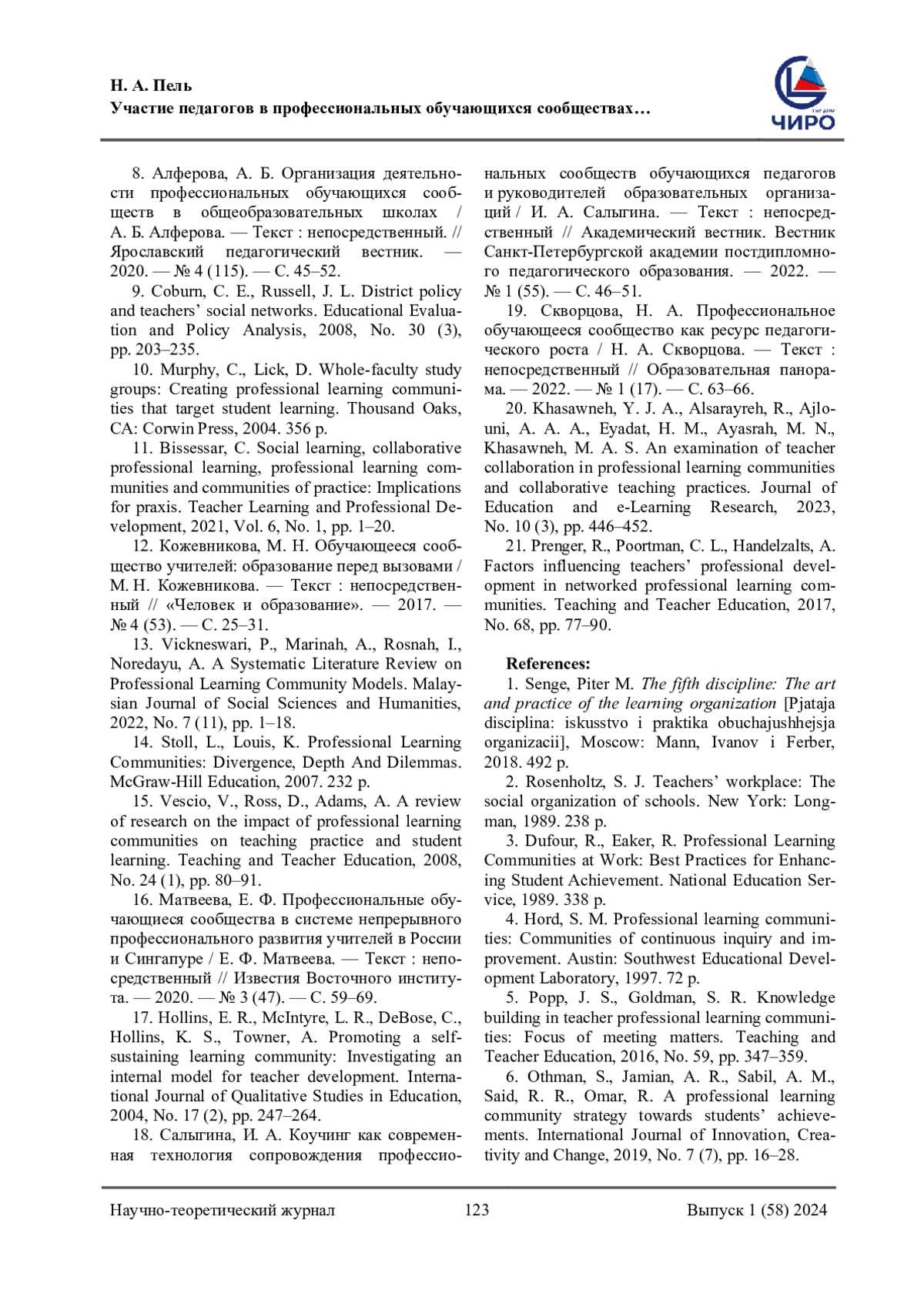 19. Скворцова, Н. А. Профессиональное обучающееся сообщество как ресурс педагогического роста / Н. А. Скворцова. - Текст: непосредственный //Образовательная панорама. - 2022. - № 1 (17). - С. 63-66. EDN: LHEMNG