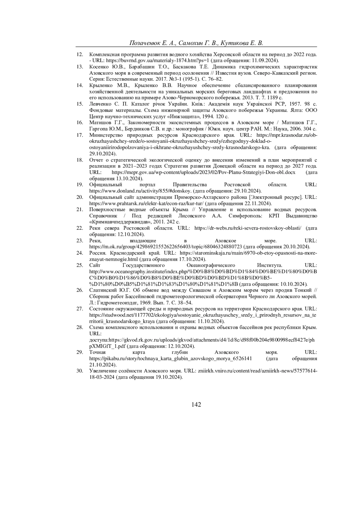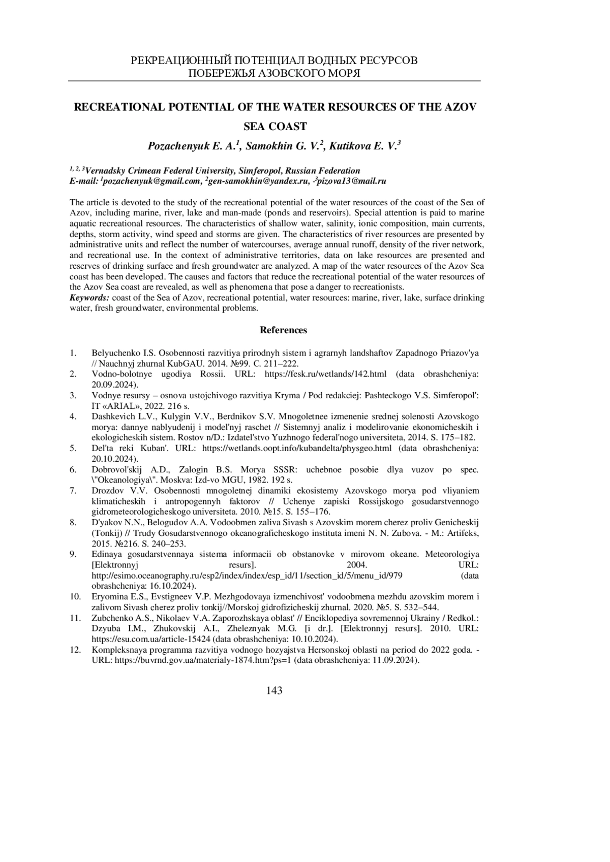 ПОЗАЧЕНЮК Е. А., САМОХИН Г. В., КУТИКОВА Е. В. РЕКРЕАЦИОННЫЙ ПОТЕНЦИАЛ ВОДНЫХ РЕСУРСОВ ПОБЕРЕЖЬЯ АЗОВСКОГО МОРЯ // УЧЕНЫЕ ЗАПИСКИ КРЫМСКОГО ФЕДЕРАЛЬНОГО УНИВЕРСИТЕТА ИМЕНИ В. И. ВЕРНАДСКОГО. ГЕОГРАФИЯ. ГЕОЛОГИЯ. 2025. ТОМ 11 (77). № 1