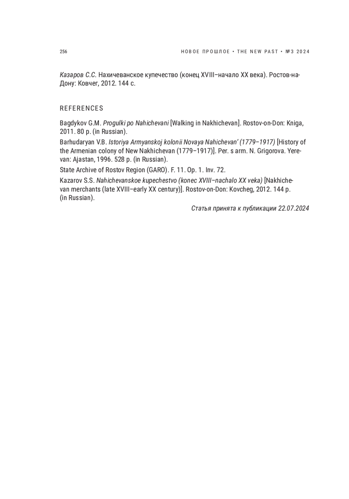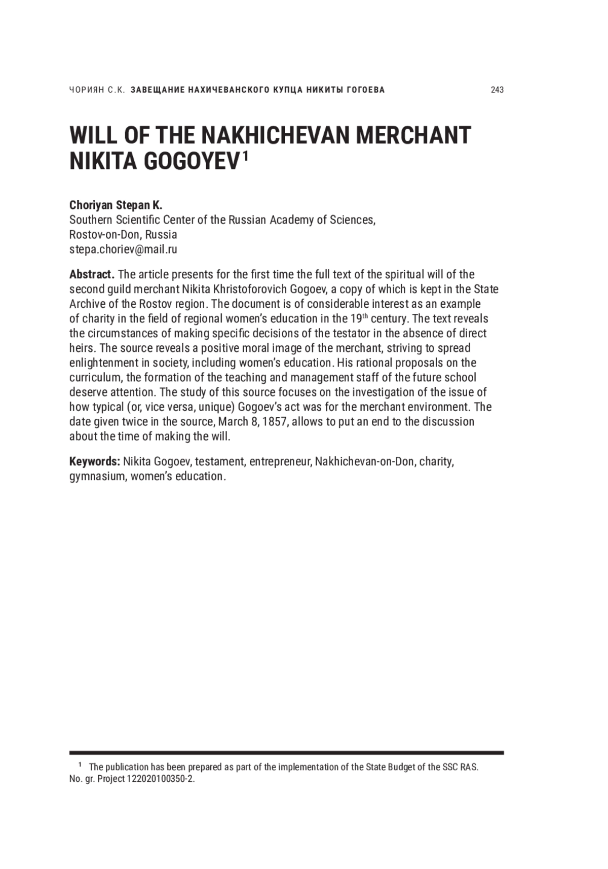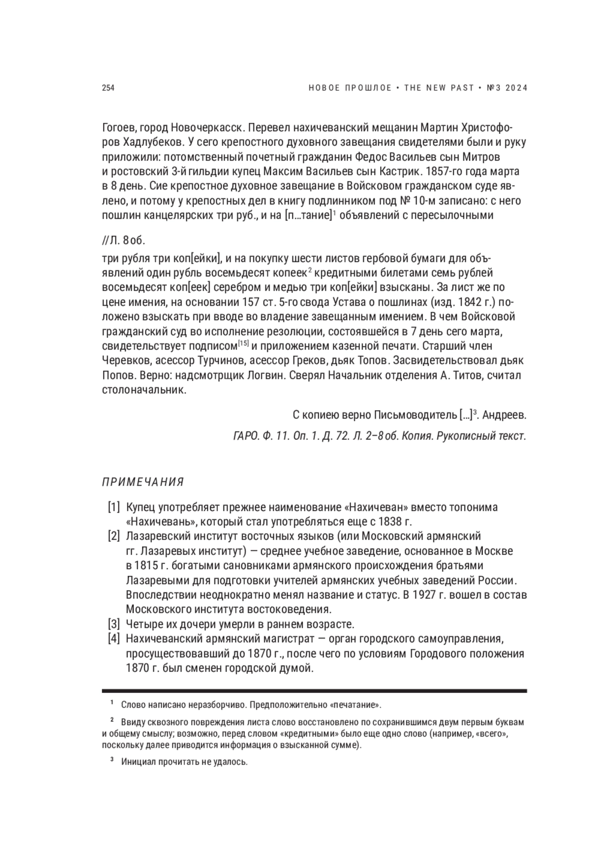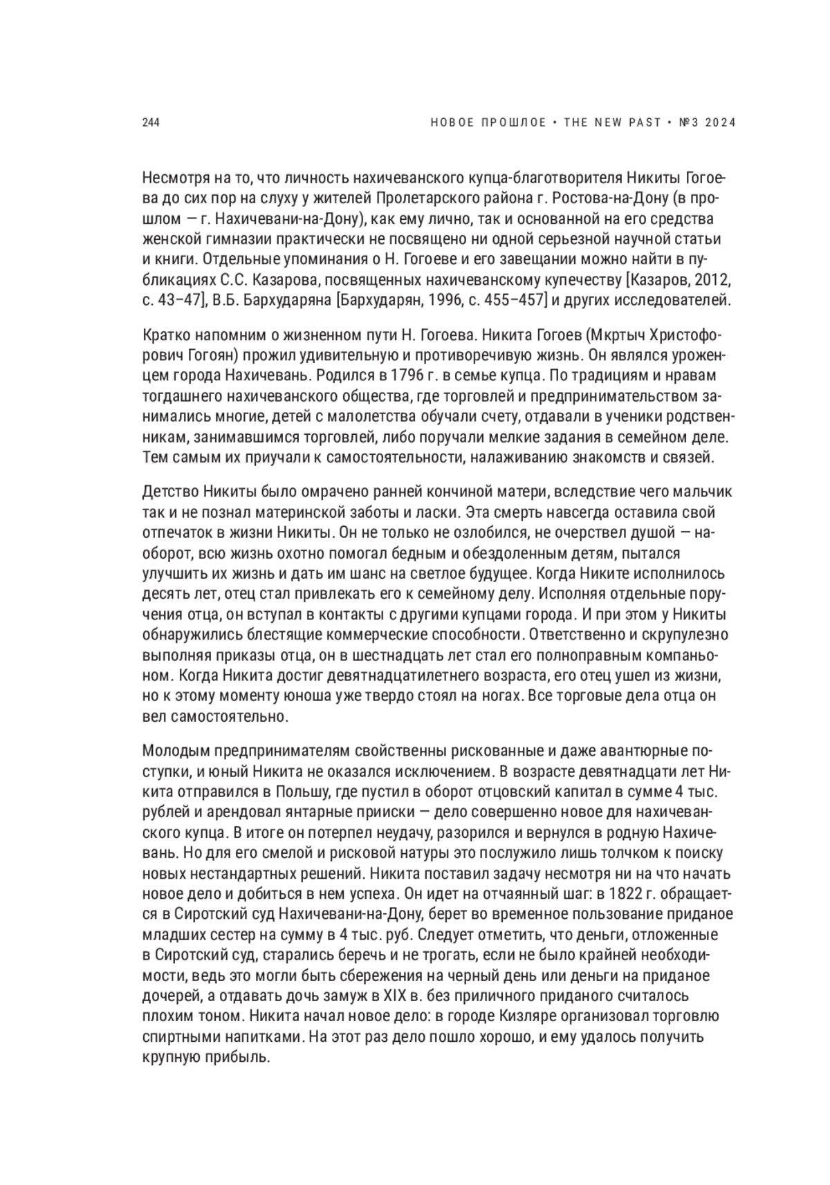 ЧОРИЯН С. К. ЗАВЕЩАНИЕ НАХИЧЕВАНСКОГО КУПЦА НИКИТЫ ГОГОЕВА // НОВОЕ ПРОШЛОЕ. 2024. № 3