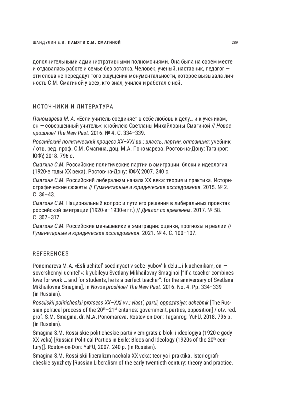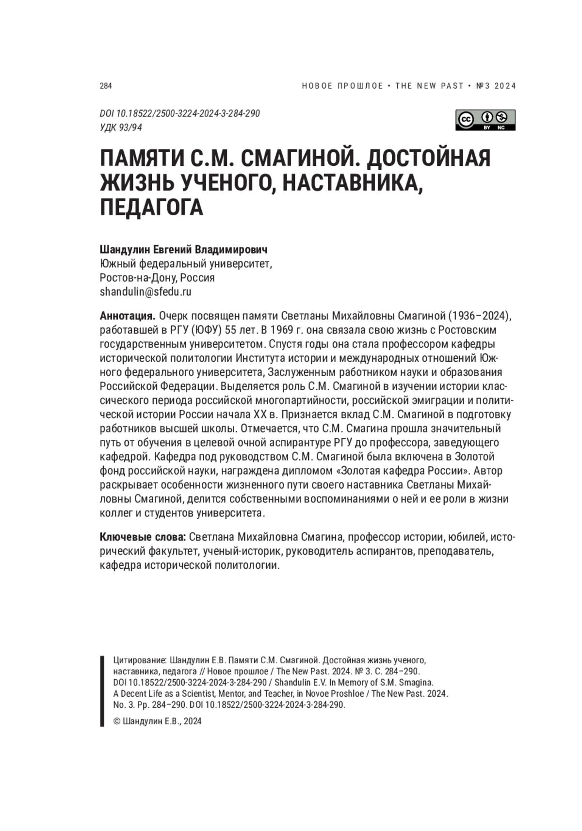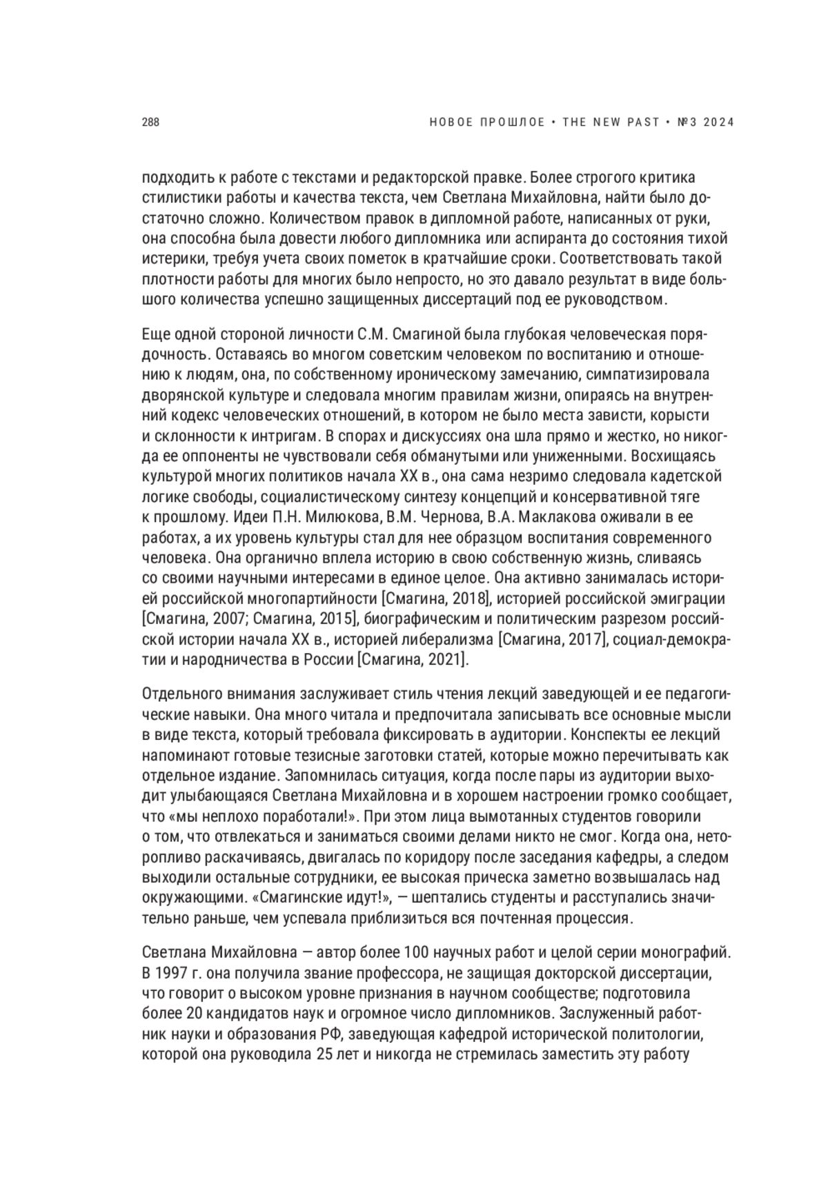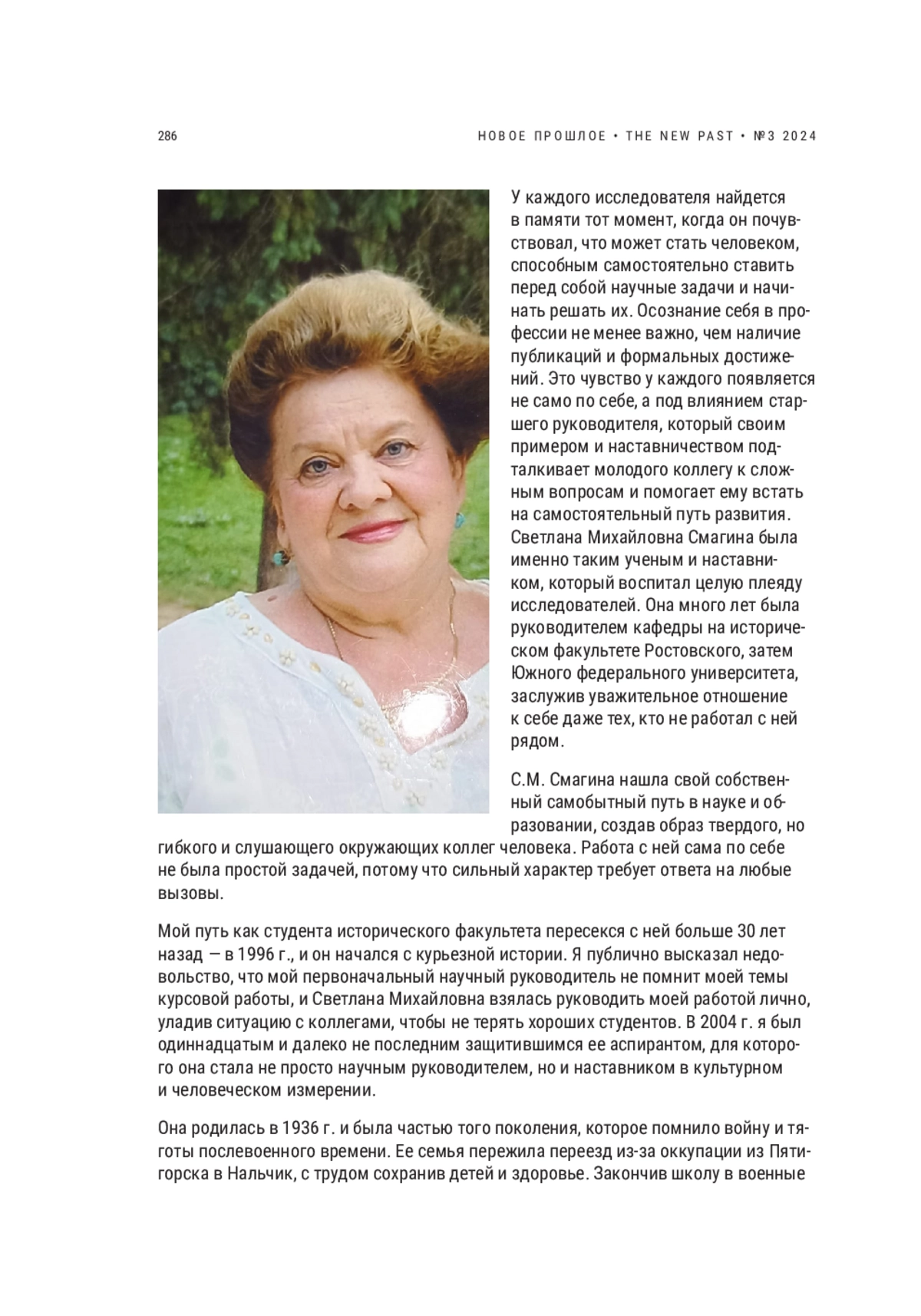 ШАНДУЛИН Е. В. ПАМЯТИ С. М. СМАГИНОЙ. ДОСТОЙНАЯ ЖИЗНЬ УЧЕНОГО, НАСТАВНИКА, ПЕДАГОГА // НОВОЕ ПРОШЛОЕ. 2024. № 3