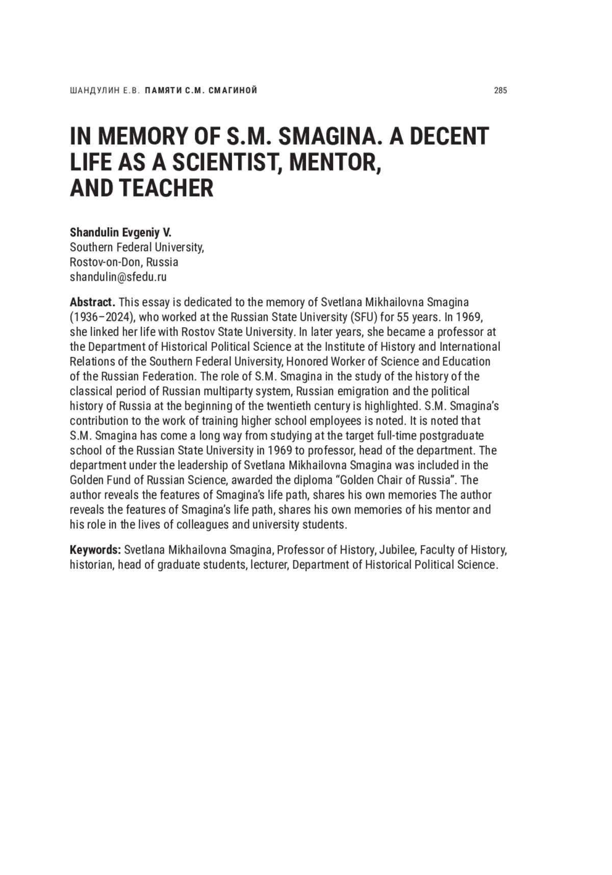 Очерк посвящен памяти Светланы Михайловны Смагиной (1936–2024), работавшей в РГУ (ЮФУ) 55 лет. В 1969 г. она связала свою жизнь с Ростовским государственным университетом. Спустя годы она стала профессором кафедры исторической политологии Института истории и международных отношений Южного федерального университета, Заслуженным работником науки и образования Российской Федерации. Выделяется роль С. М. Смагиной в изучении истории классического периода российской многопартийности, российской эмиграции и политической истории России начала ХХ в. Признается вклад С. М. Смагиной в подготовку работников высшей школы. Отмечается, что С. М. Смагина прошла значительный путь от обучения в целевой очной аспирантуре РГУ до профессора, заведующего кафедрой. Кафедра под руководством С. М. Смагиной была включена в Золотой фонд российской науки, награждена дипломом «Золотая кафедра России». Автор раскрывает особенности жизненного пути своего наставника Светланы Михайловны Смагиной, делится собственными воспоминаниями о ней и ее роли в жизни коллег и студентов университета