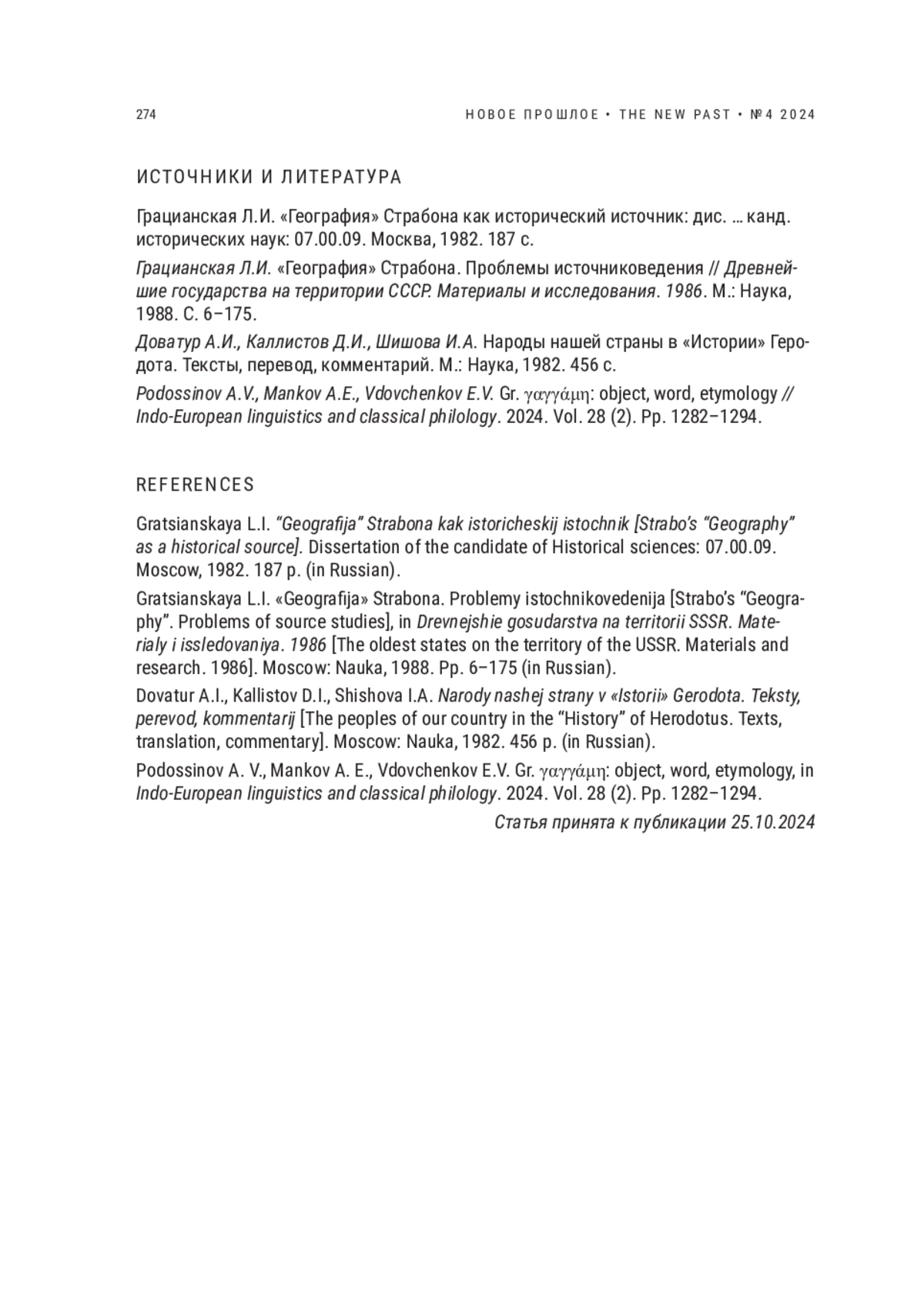 4. Podossinov A.V., Mankov A.E., Vdovchenkov E.V. Gr. γαγγάμη: object, word, etymology // Indo-European linguistics and classical philology. 2024. Vol. 28 (2). Pp. 1282-1294.