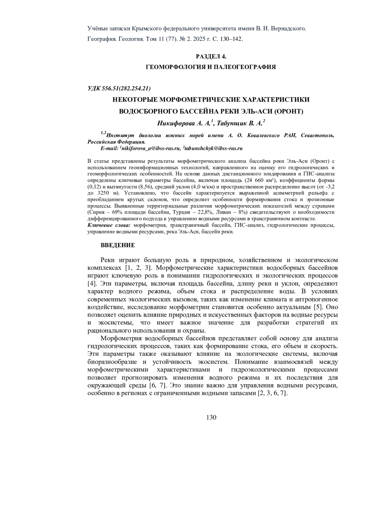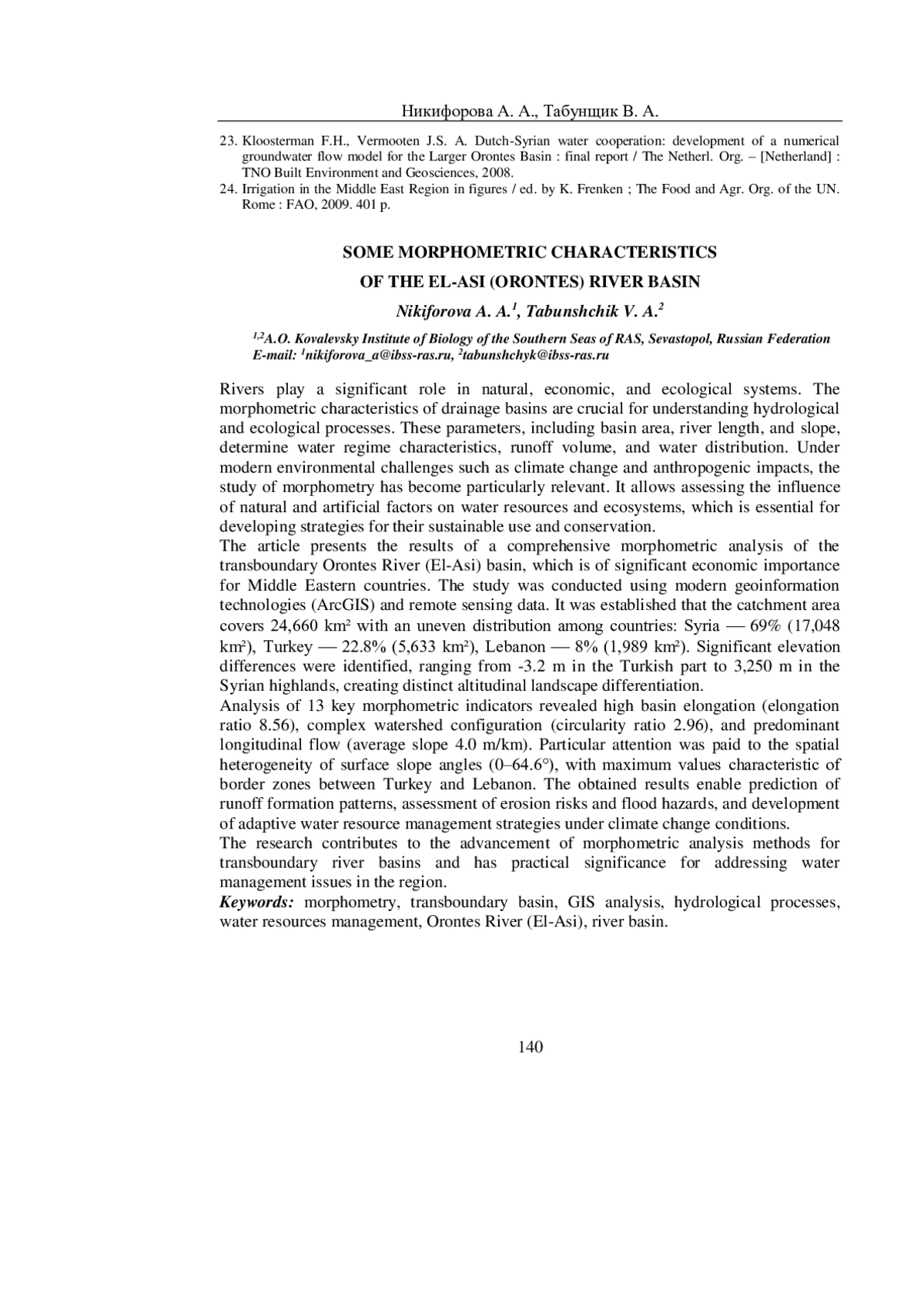 В статье представлены результаты морфометрического анализа бассейна реки Эль-Аси (Оронт) с использованием геоинформационных технологий, направленного на оценку его гидрологических и геоморфологических особенностей. На основе данных дистанционного зондирования и ГИС-анализа определены ключевые параметры бассейна, включая площадь (24 660 км²), коэффициенты формы (0,12) и вытянутости (8,56), средний уклон (4,0 м/км) и пространственное распределение высот (от -3,2 до 3250 м). Установлено, что бассейн характеризуется выраженной асимметрией рельефа с преобладанием крутых склонов, что определяет особенности формирования стока и эрозионные процессы. Выявленные территориальные различия морфометрических показателей между странами (Сирия - 69% площади бассейна, Турция - 22,8%, Ливан - 8%) свидетельствуют о необходимости дифференцированного подхода к управлению водными ресурсами в трансграничном контексте.