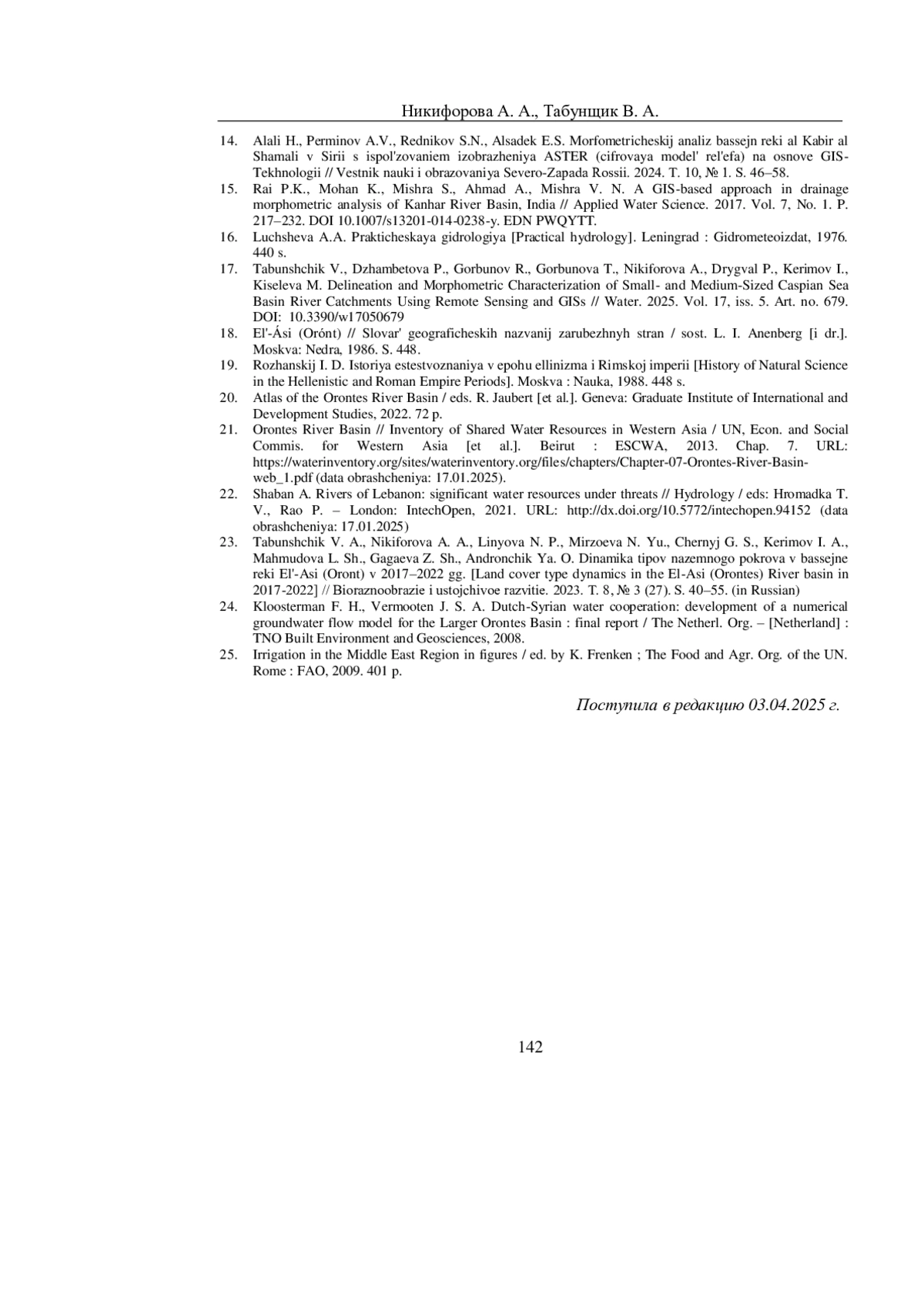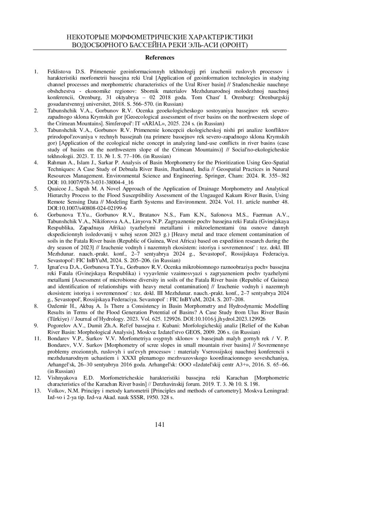 16. Tabunshchik V., Dzhambetova P., Gorbunov R., Gorbunova T., Nikiforova A., Drygval P., Kerimov I., Kiseleva M. Delineation and Morphometric Characterization of Small- and Medium-Sized Caspian Sea Basin River Catchments Using Remote Sensing and GISs // Water. 2025. Vol. 17, iss. 5. Art. no. 679. DOI: 10.3390/w17050679 EDN: VBOVOQ