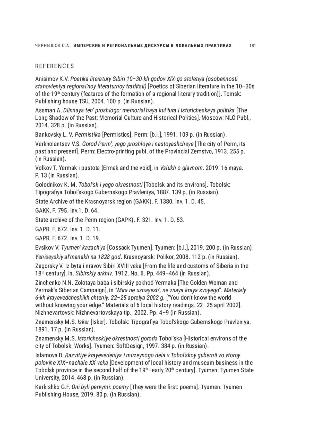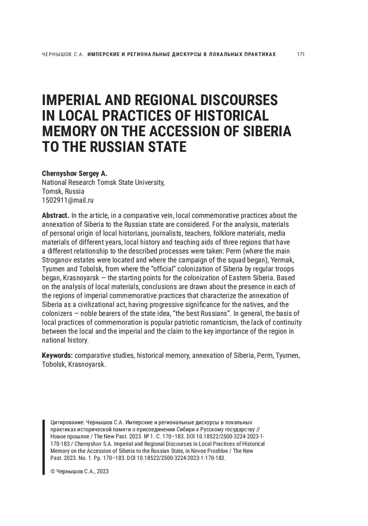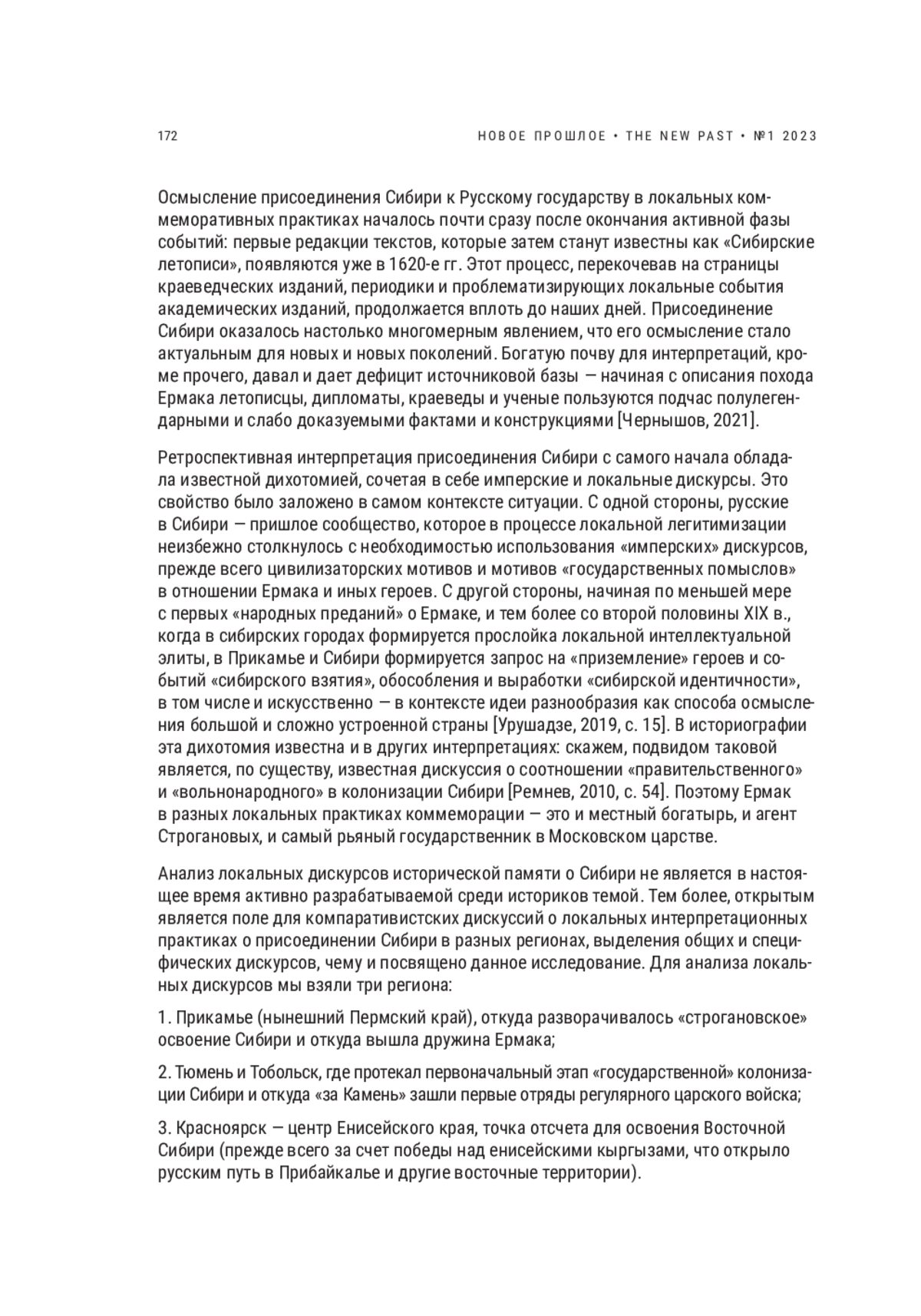 ЧЕРНЫШОВ С. А. ИМПЕРСКИЕ И РЕГИОНАЛЬНЫЕ ДИСКУРСЫ В ЛОКАЛЬНЫХ ПРАКТИКАХ ИСТОРИЧЕСКОЙ ПАМЯТИ О ПРИСОЕДИНЕНИИ СИБИРИ К РУССКОМУ ГОСУДАРСТВУ // НОВОЕ ПРОШЛОЕ. 2023. № 1