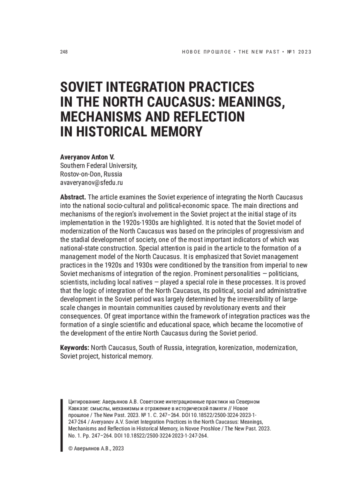 В статье рассматривается советский опыт интеграции Северного Кавказа в общегосударственное социокультурное и политико-экономическое пространство. Выделены основные направления и механизмы вовлечения региона в советский проект на начальном этапе его реализации в 1920–1930-е гг. Отмечается, что советская модель модернизации Северного Кавказа основывалась на принципах прогрессизма и стадиального развития общества, одним из важнейших факторов которого было национально-государственное строительство. Особое внимание в статье уделяется формированию модели управления Северным Кавказом. Подчеркивается, что советские управленческие практики в 1920–1930-е гг. были обусловлены переходом от имперских к новым советским механизмам интеграции региона. Значительную роль в этих процессах играли выдающиеся личности — политики, ученые, в том числе местные уроженцы. Доказывается, что логика интеграции Северного Кавказа, его политического, социального и административного развития в советский период во многом определялась необратимостью масштабных изменений горских сообществ, вызванных революционными событиями и их последствиями. Огромное значение в рамках процессов интеграции имело формирование единого научно-образовательного пространства, которое стало локомотивом развития всего Северного Кавказа в советский период