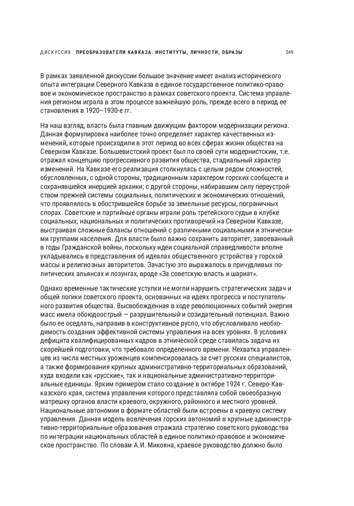 В рамках заявленной дискуссии большое значение имеет анализ исторического опыта интеграции Северного Кавказа в единое государственное политико-правовое и экономическое пространство в рамках советского проекта. Система управления регионом играла в этом процессе важнейшую роль, прежде всего в период еe становления в 1920–1930-е г