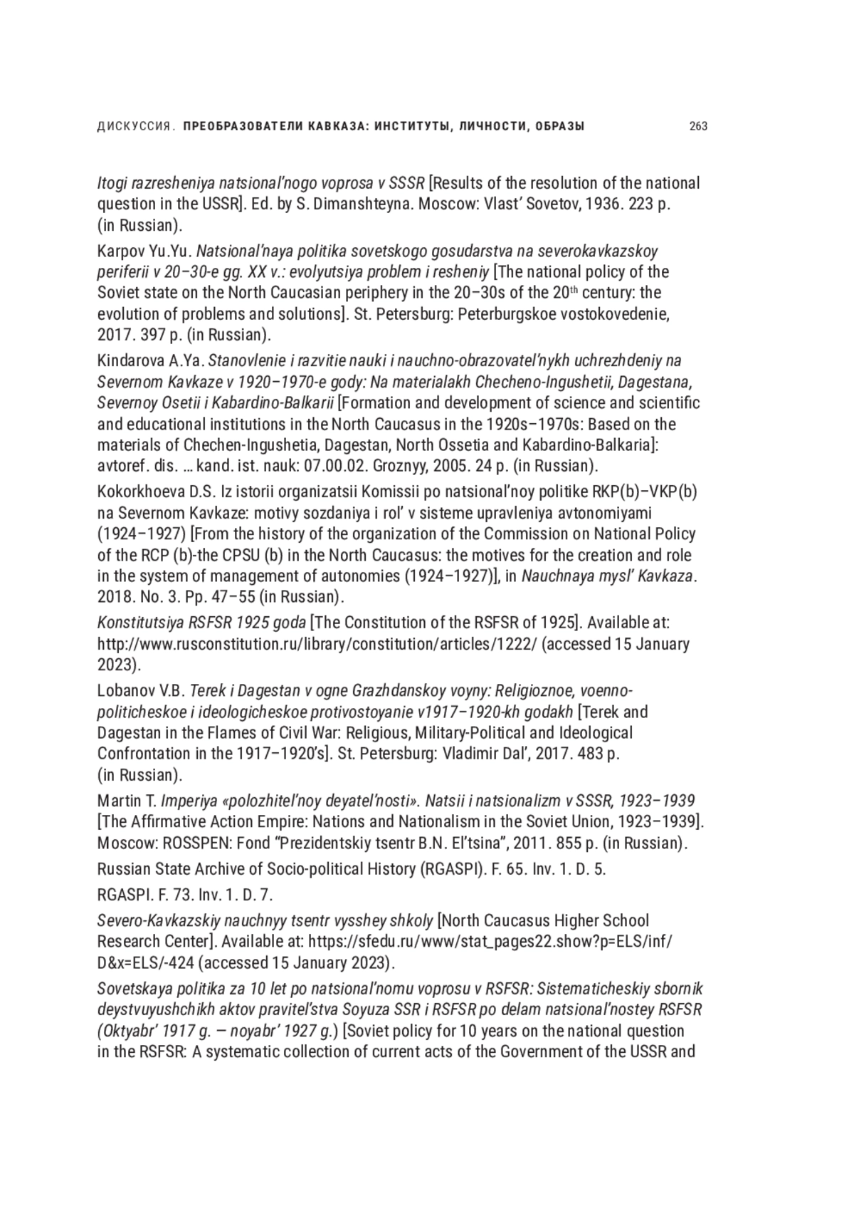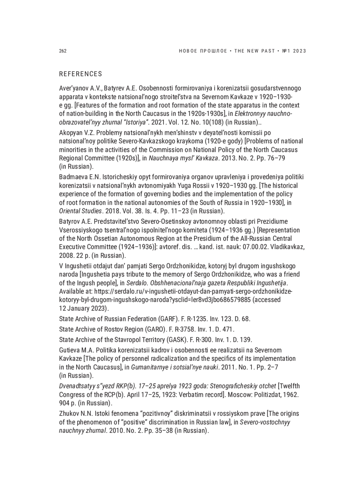 1. Аверьянов А.В., Батырев А.Е. Особенности формирования и коренизации государственного аппарата в контексте национального строительства на Северном Кавказе в 1920-1930-е гг. // Электронный научно-образовательный журнал “История”. 2021. Т. 12. Вып. 10 (108).