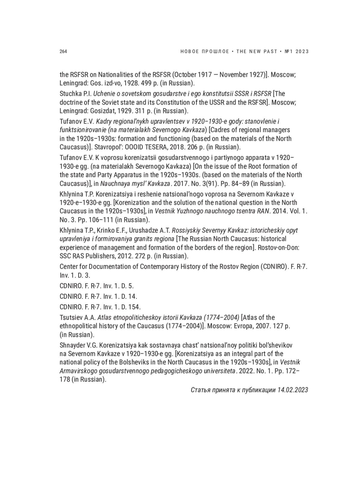 26. Хлынина Т.П. Коренизация и решение национального вопроса на Северном Кавказе в 1920-е - 1930-е гг. // Вестник Южного научного центра РАН. 2014. Т. 1. № 3. С. 106-111.