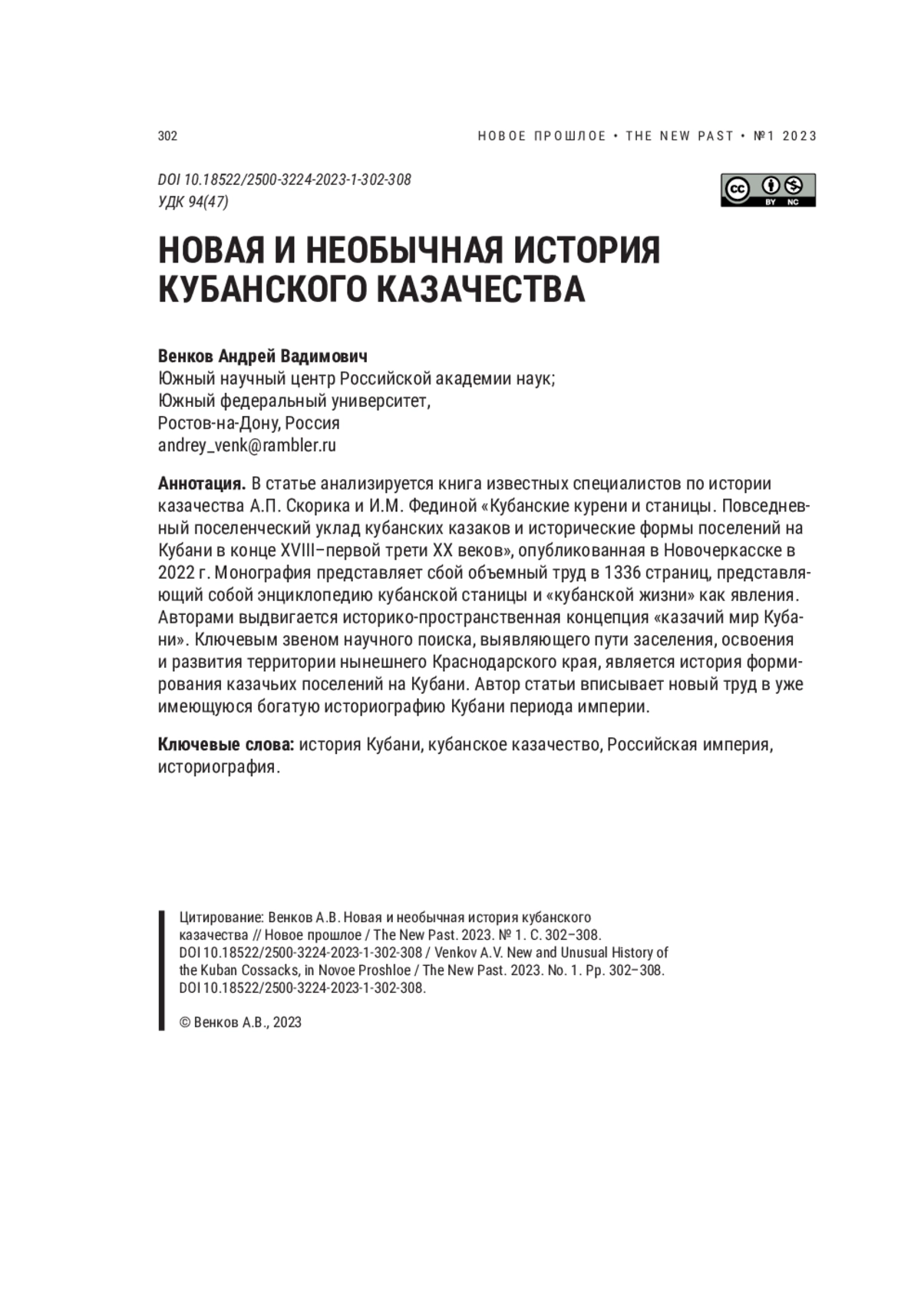 В статье анализируется книга известных специалистов по истории казачества А. П. Скорика и И. М. Фединой «Кубанские курени и станицы. Повседневный поселенческий уклад кубанских казаков и исторические формы поселений на Кубани в конце XVIII–первой трети ХХ веков», опубликованная в Новочеркасске в 2022 г. Монография представляет сбой объемный труд в 1336 страниц, представляющий собой энциклопедию кубанской станицы и «кубанской жизни» как явления. Авторами выдвигается историко-пространственная концепция «казачий мир Кубани». Ключевым звеном научного поиска, выявляющего пути заселения, освоения и развития территории нынешнего Краснодарского края, является история формирования казачьих поселений на Кубани. Автор статьи вписывает новый труд в уже имеющуюся богатую историографию Кубани периода империи