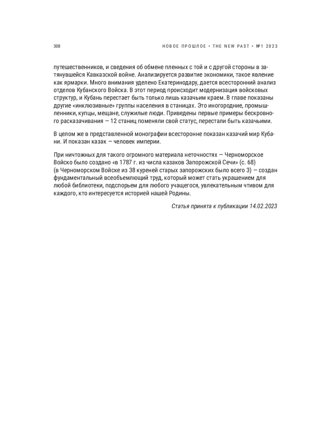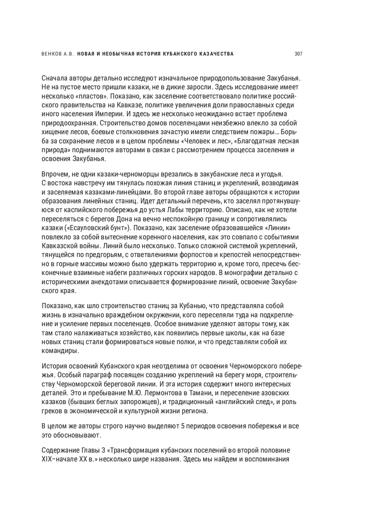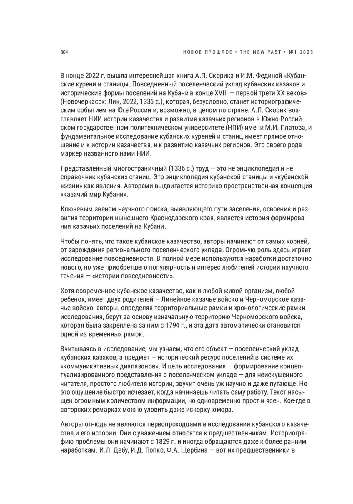 В конце 2022 г. вышла интереснейшая книга А. П. Скорика и И. М. Фединой «Кубанские курени и станицы. Повседневный поселенческий уклад кубанских казаков и исторические формы поселений на Кубани в конце XVIII — первой трети ХХ веков» (Новочеркасск: Лик, 2022, 1336 с.), которая, безусловно, станет историографическим событием на Юге России и, возможно, в целом по стране. А. П. Скорик возглавляет НИИ истории казачества и развития казачьих регионов в Южно-Российском государственном политехническом университете (НПИ) имени М. И. Платова, и фундаментальное исследование кубанских куреней и станиц имеет прямое отношение и к истории казачества, и к развитию казачьих регионов. Это своего рода маркер названного нами НИИ