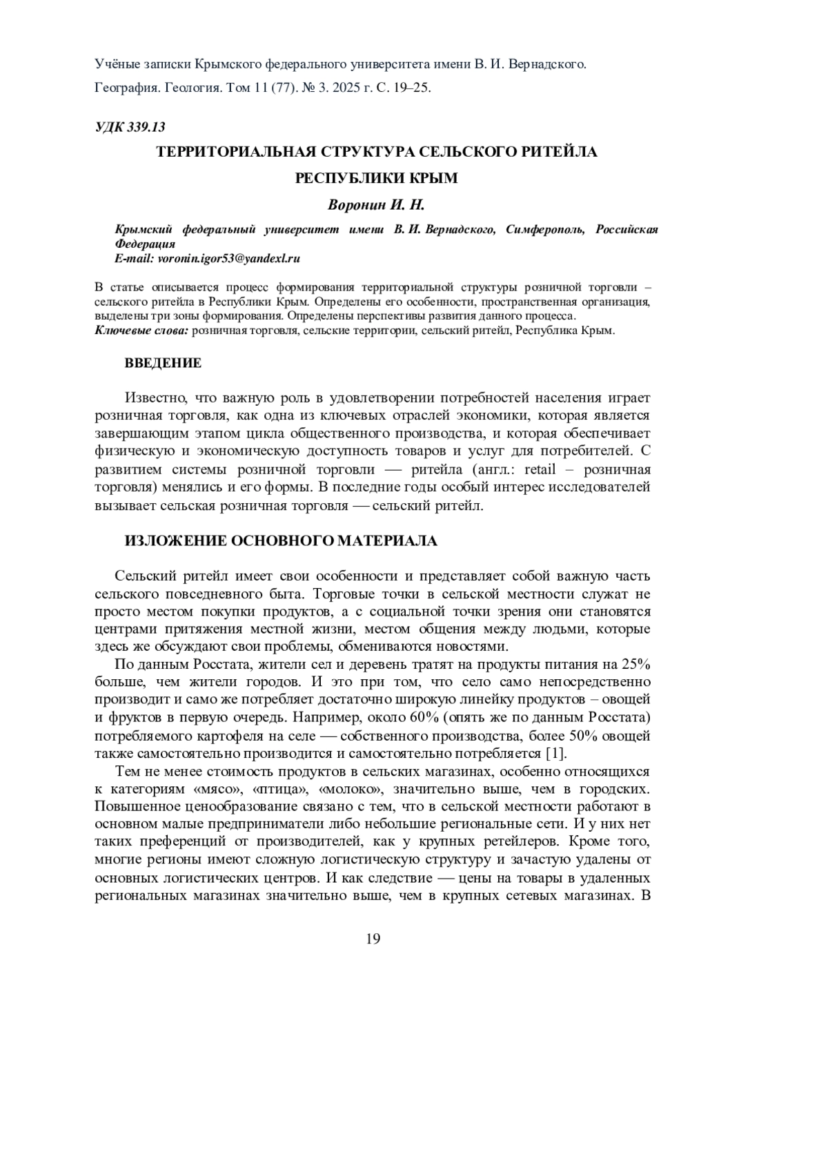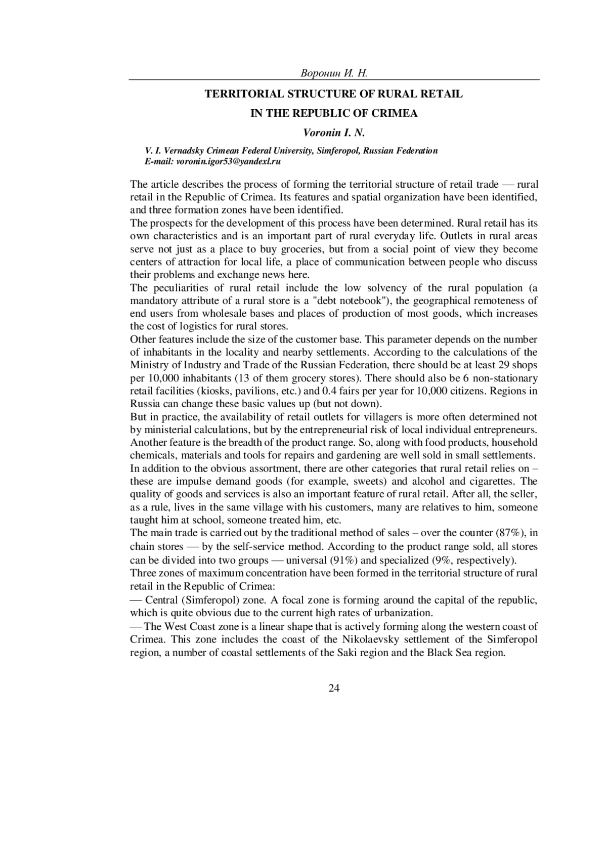 В статье описывается процесс формирования территориальной структуры розничной торговли - сельского ритейла в Республики Крым. Определены его особенности, пространственная организация, выделены три зоны формирования. Определены перспективы развития данного процесса.