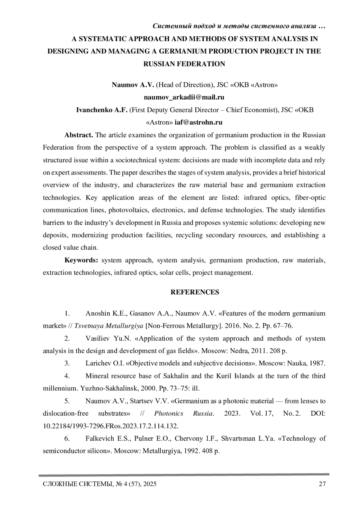 The article examines the organization of germanium production in the Russian Federation from the perspective of a system approach. The problem is classified as a weakly structured issue within a sociotechnical system: decisions are made with incomplete data and rely on expert assessments. The paper describes the stages of system analysis, provides a brief historical overview of the industry, and characterizes the raw material base and germanium extraction technologies. Key application areas of the element are listed: infrared optics, fiber-optic communication lines, photovoltaics, electronics, and defense technologies. The study identifies barriers to the industry’s development in Russia and proposes systemic solutions: developing new deposits, modernizing production facilities, recycling secondary resources, and establishing a closed value chain.