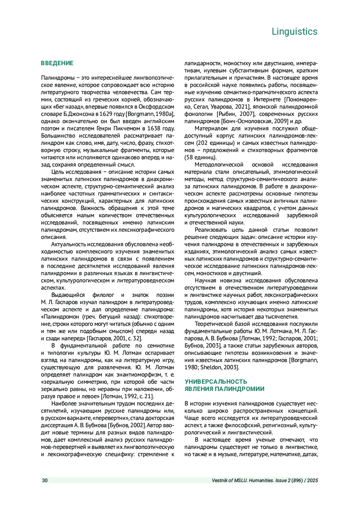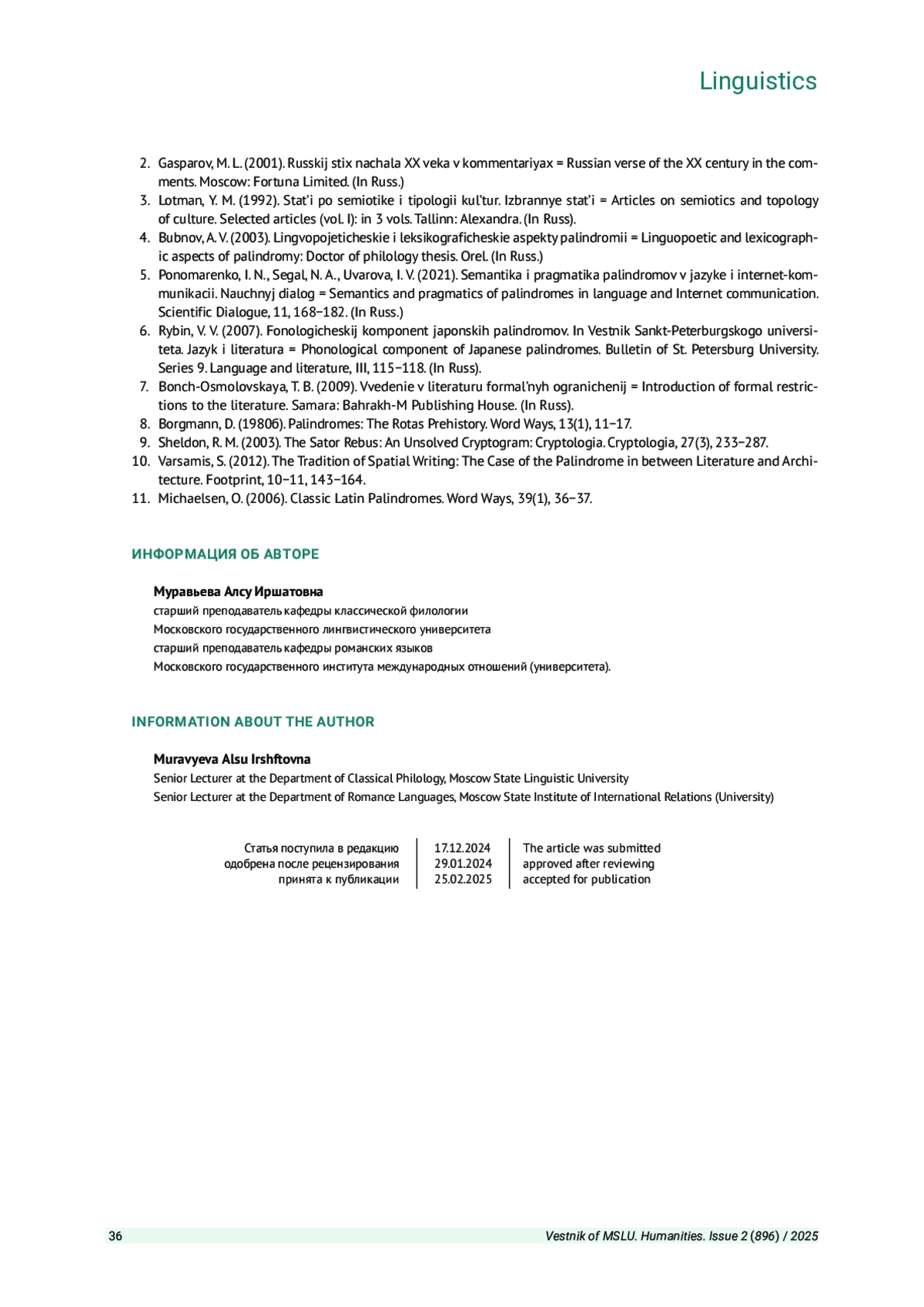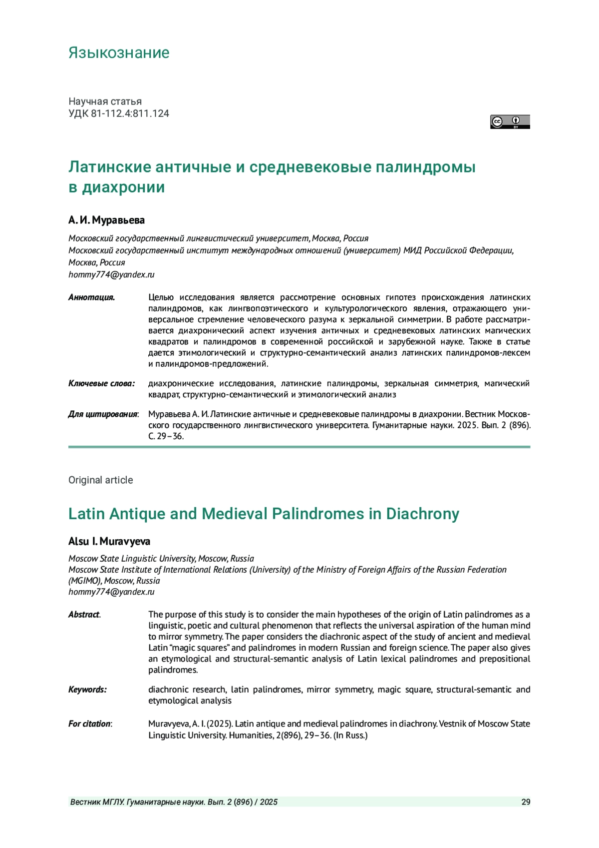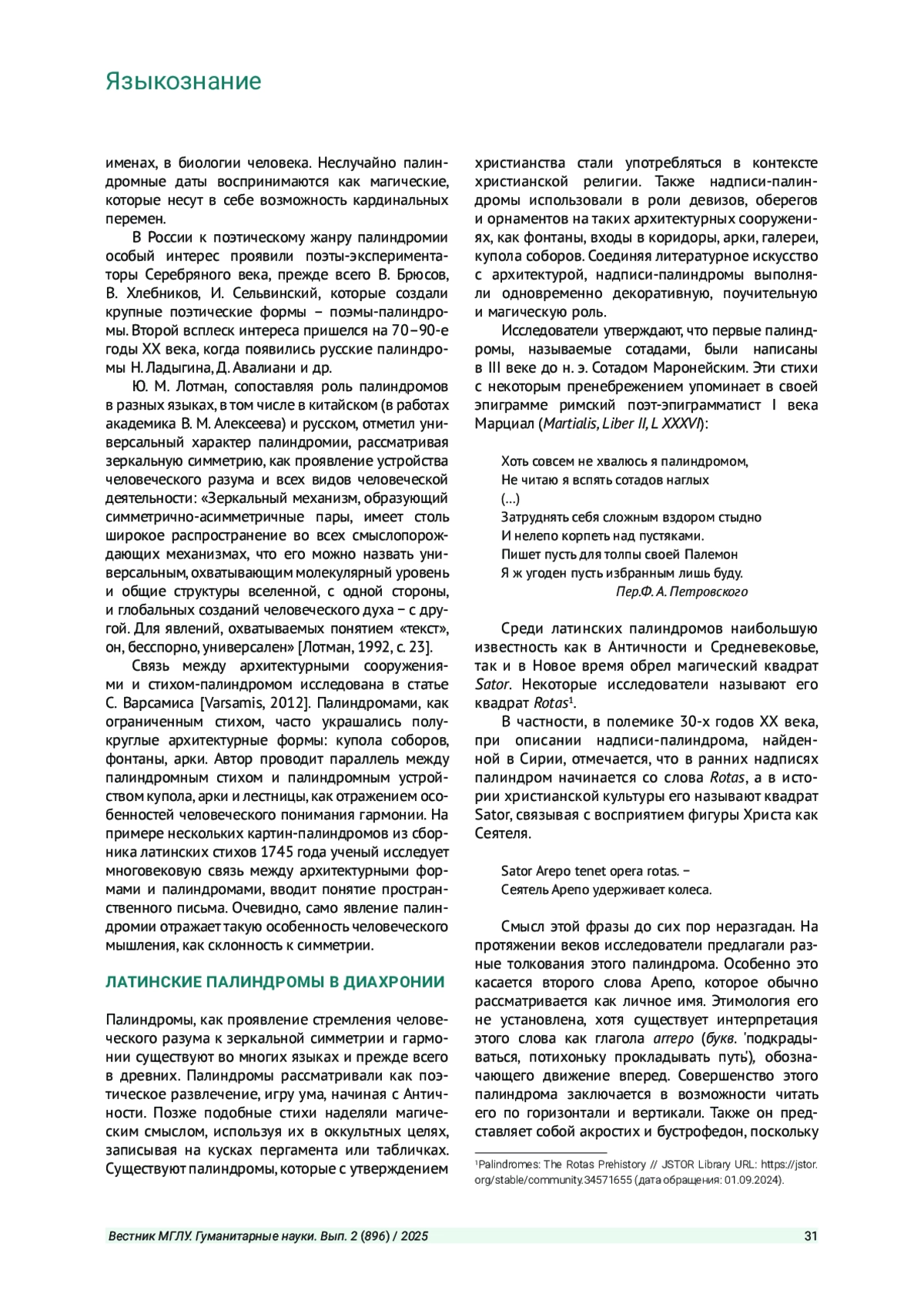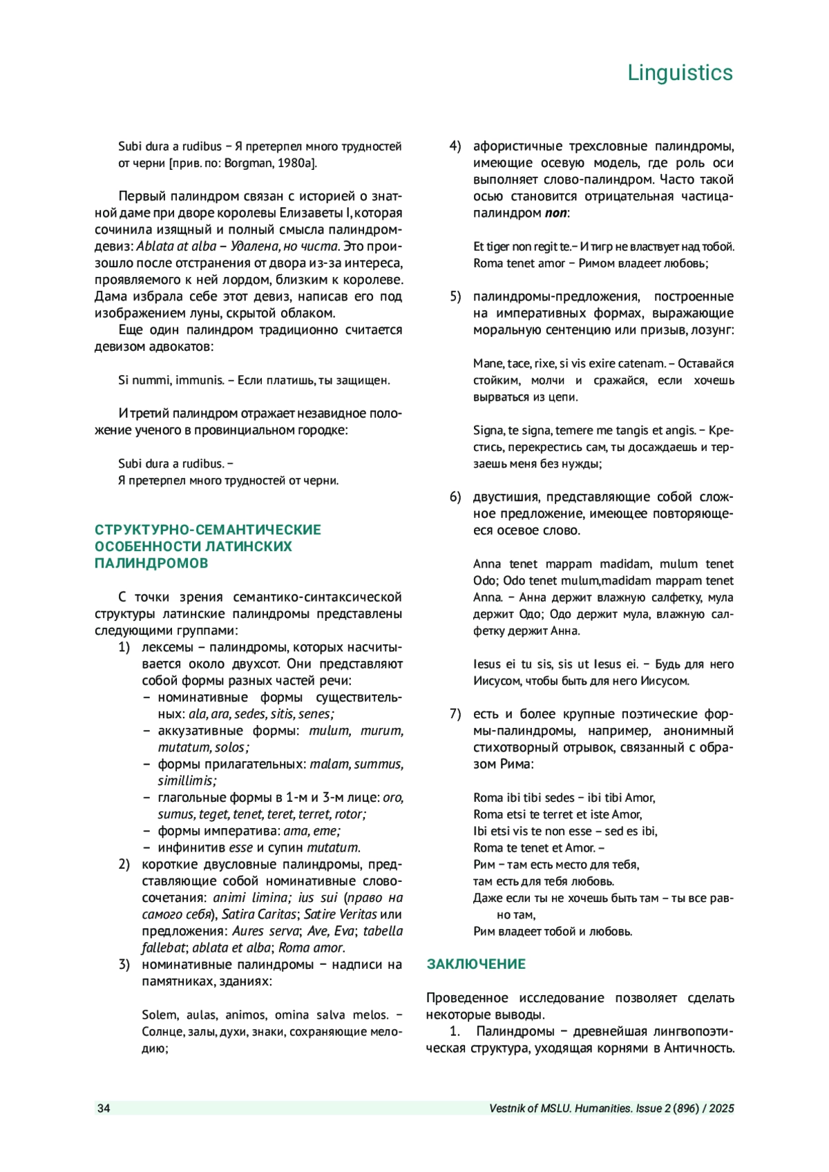 МУРАВЬЕВА А. И. ЛАТИНСКИЕ АНТИЧНЫЕ И СРЕДНЕВЕКОВЫЕ ПАЛИНДРОМЫ В ДИАХРОНИИ // ВЕСТНИК МОСКОВСКОГО ГОСУДАРСТВЕННОГО ЛИНГВИСТИЧЕСКОГО УНИВЕРСИТЕТА. ГУМАНИТАРНЫЕ НАУКИ. 2025. № 2 (896)