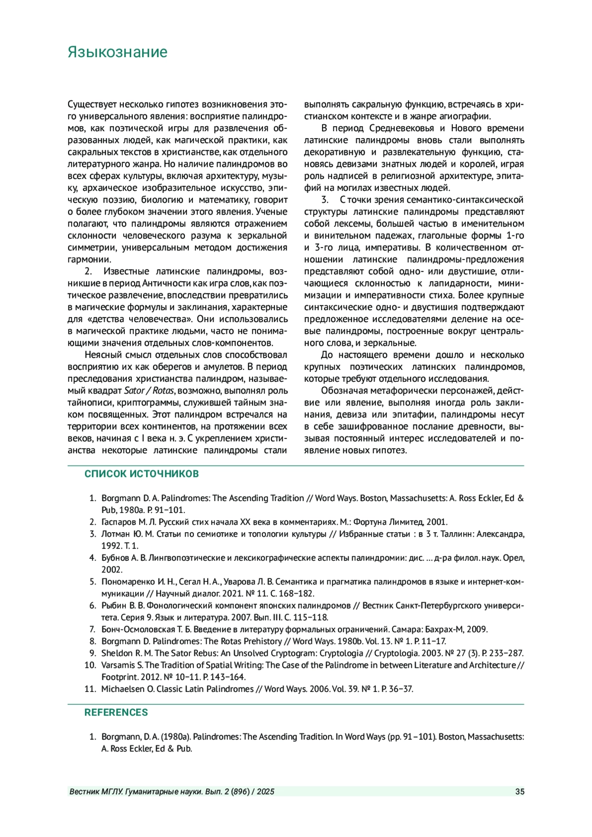 Статья: ЛАТИНСКИЕ АНТИЧНЫЕ И СРЕДНЕВЕКОВЫЕ ПАЛИНДРОМЫ В ДИАХРОНИИ (2025)