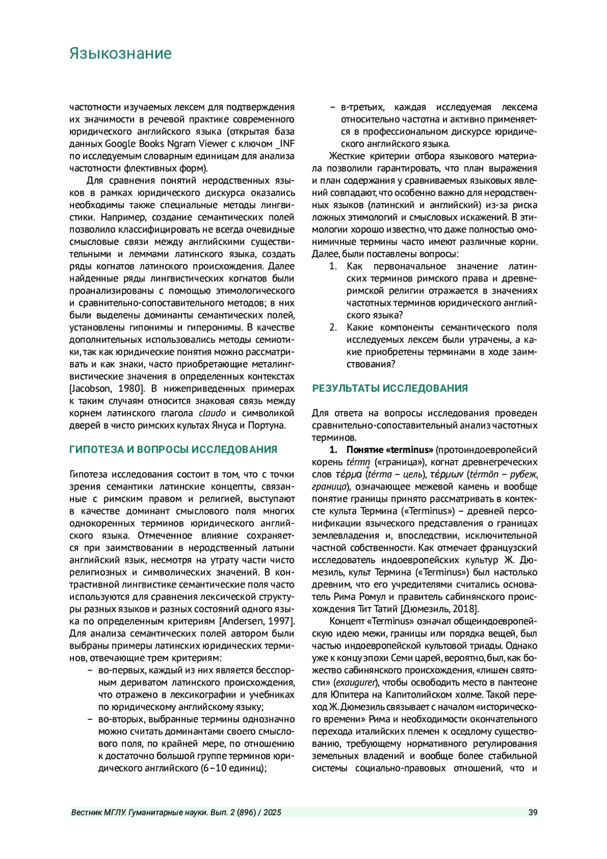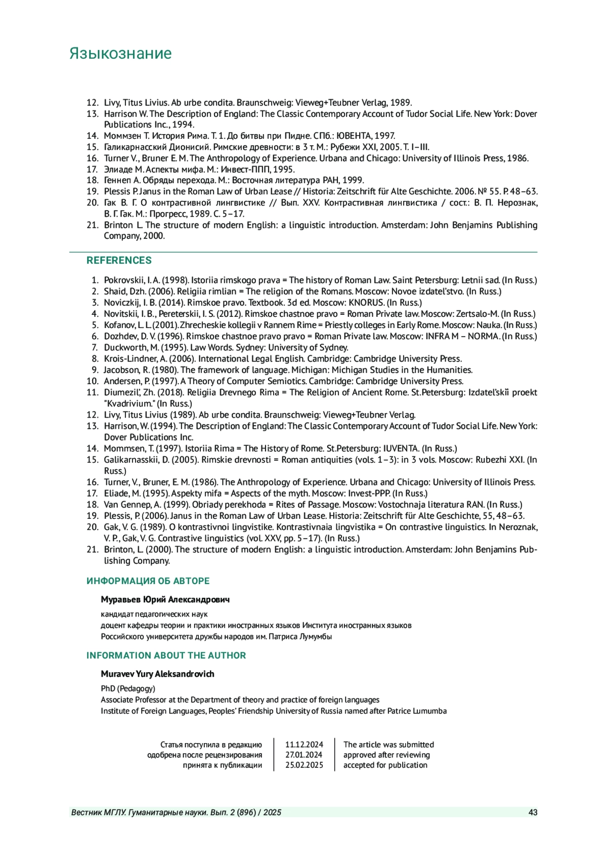 В работе рассматривается этимология ряда терминов современного юридического английского языка, имеющих связь с институтами римского права и древнеримской религии. Цель исследования - установить особенности фонетической, словообразовательной, лексической, синтаксической и семантической деривации таких терминов, выявить их глубинную смысловую структуру в юридическом английском и прояснить доминанты их смысловых полей. Анализ происхождения терминов с помощью методов контрастивной лингвистики позволяет глубже понять значение отдельных институтов и правовых концептов, которые до сих пор используются в современных юрисдикциях общего права и романо-германской правовой семьи.