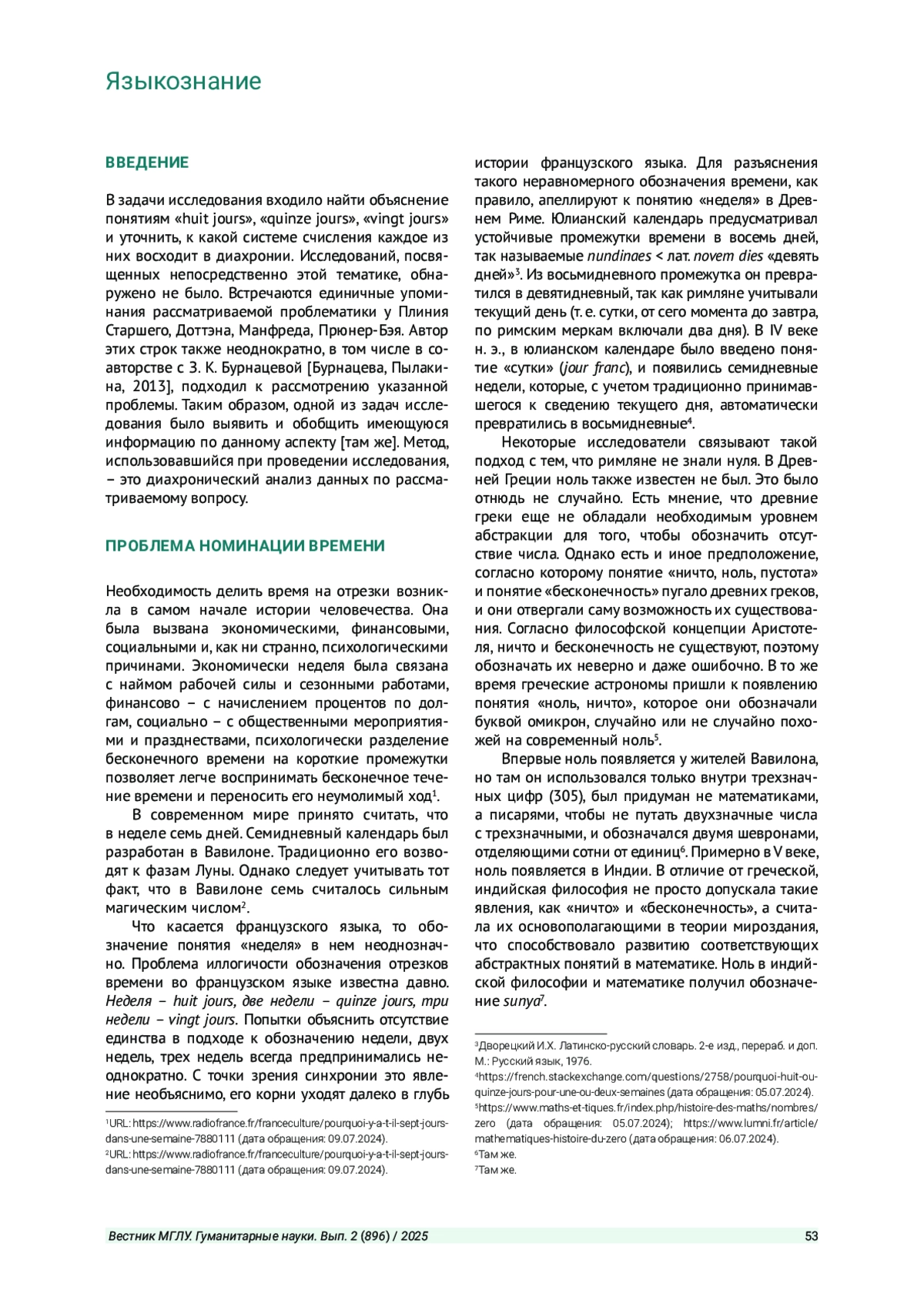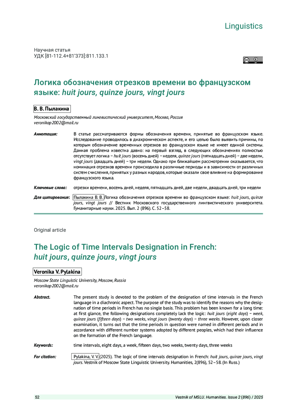 ПЫЛАКИНА В. В. ЛОГИКА ОБОЗНАЧЕНИЯ ОТРЕЗКОВ ВРЕМЕНИ ВО ФРАНЦУЗСКОМ ЯЗЫКЕ: HUIT JOURS, QUINZE JOURS, VINGT JOURS // ВЕСТНИК МОСКОВСКОГО ГОСУДАРСТВЕННОГО ЛИНГВИСТИЧЕСКОГО УНИВЕРСИТЕТА. ГУМАНИТАРНЫЕ НАУКИ. 2025. № 2 (896)