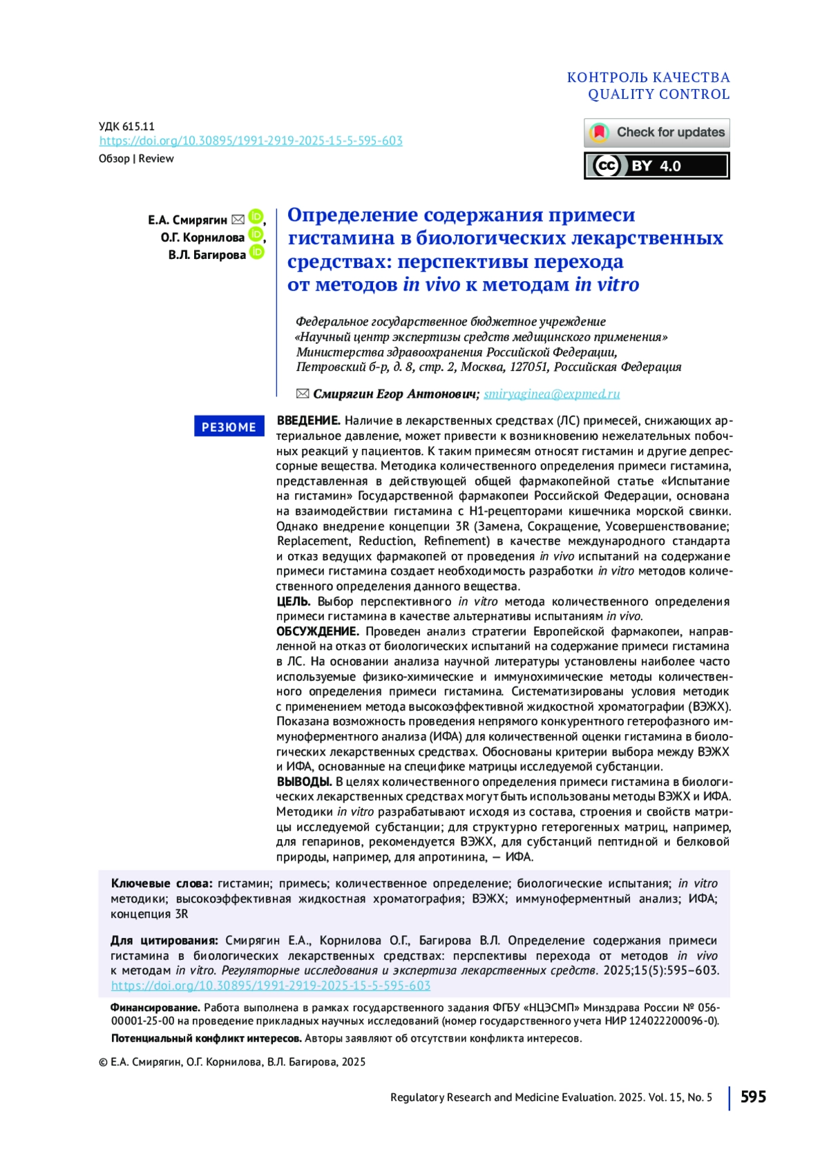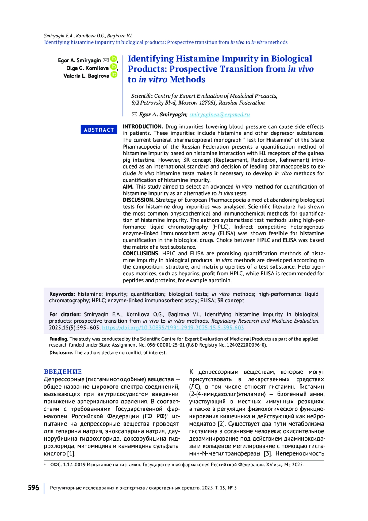 ВВЕДЕНИЕ. Наличие в лекарственных средствах (ЛС) примесей, снижающих артериальное давление, может привести к возникновению нежелательных побочных реакций у пациентов. К таким примесям относят гистамин и другие депрессорные вещества. Методика количественного определения примеси гистамина, представленная в действующей общей фармакопейной статье «Испытание на гистамин» Государственной фармакопеи Российской Федерации, основана на взаимодействии гистамина с Н1-рецепторами кишечника морской свинки. Однако внедрение концепции 3R (Замена, Сокращение, Усовершенствование; Replacement, Reduction, Refinement) в качестве международного стандарта и отказ ведущих фармакопей от проведения in vivo испытаний на содержание примеси гистамина создает необходимость разработки in vitro методов количественного определения данного вещества.
