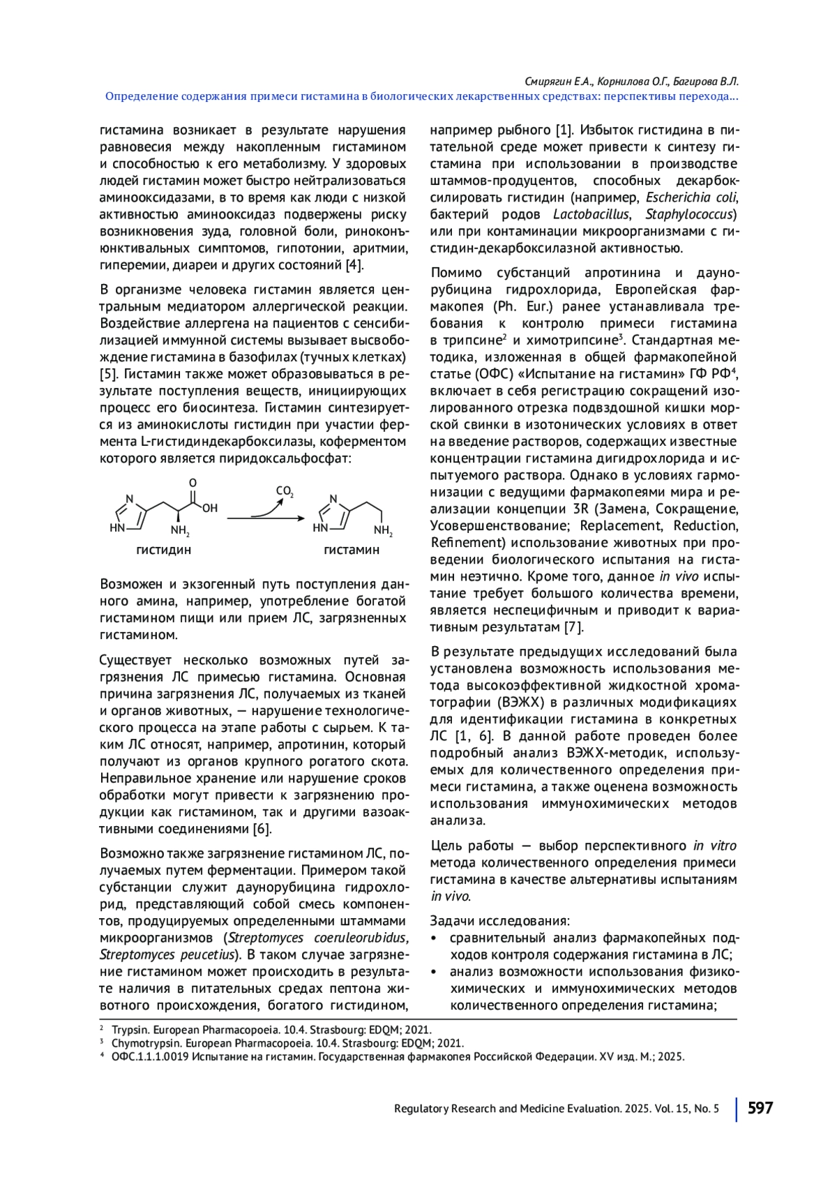 ОБСУЖДЕНИЕ. Проведен анализ стратегии Европейской фармакопеи, направленной на отказ от биологических испытаний на содержание примеси гистамина в ЛС. На основании анализа научной литературы установлены наиболее часто используемые физико-химические и иммунохимические методы количественного определения примеси гистамина. Систематизированы условия методик с применением метода высокоэффективной жидкостной хроматографии (ВЭЖХ). Показана возможность проведения непрямого конкурентного гетерофазного иммуноферментного анализа (ИФА) для количественной оценки гистамина в биологических лекарственных средствах. Обоснованы критерии выбора между ВЭЖХ и ИФА, основанные на специфике матрицы исследуемой субстанции.