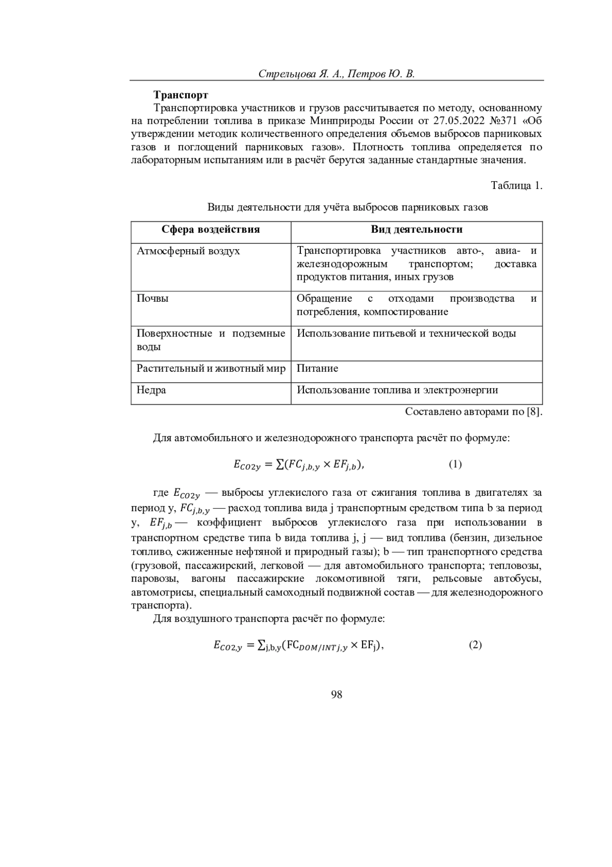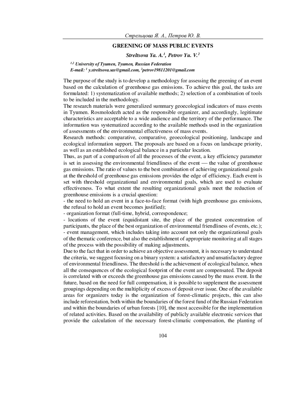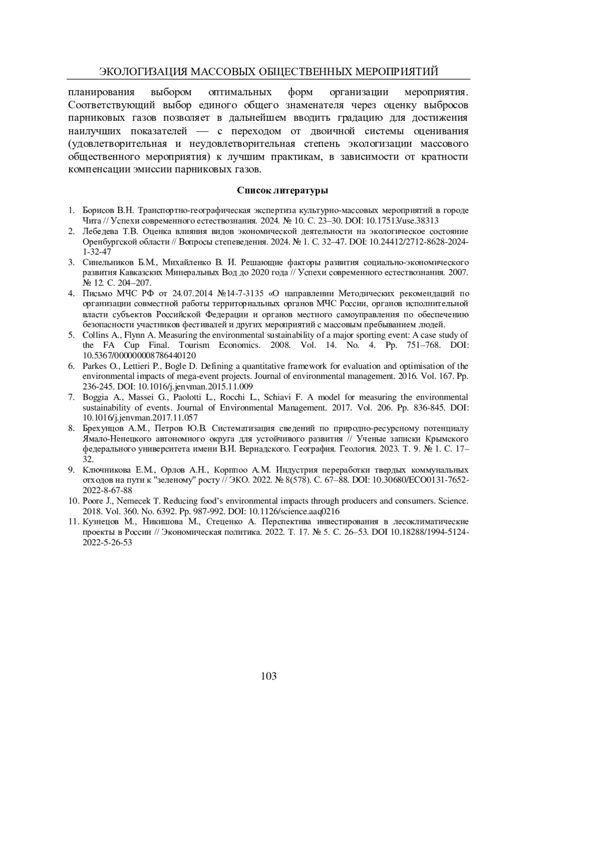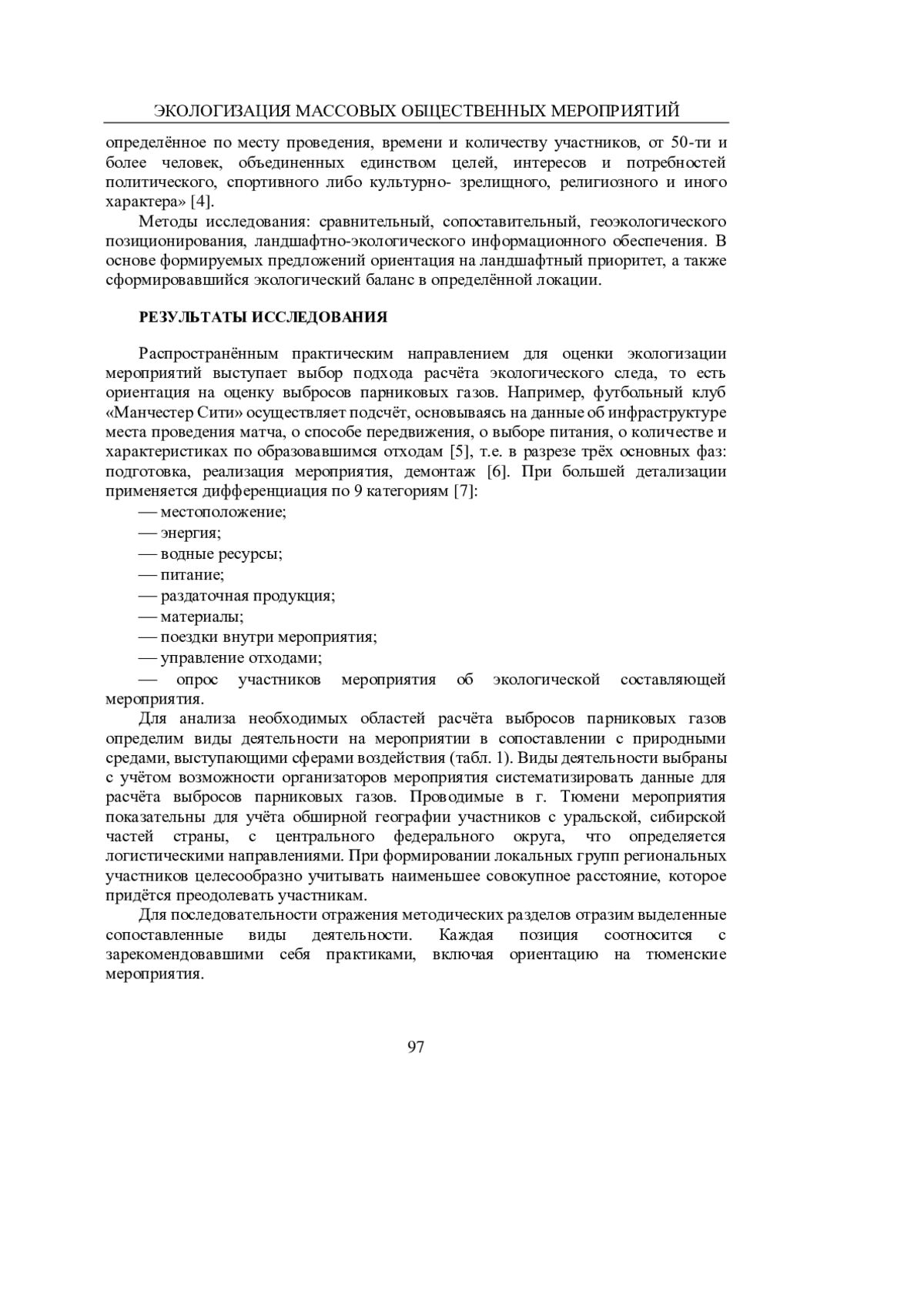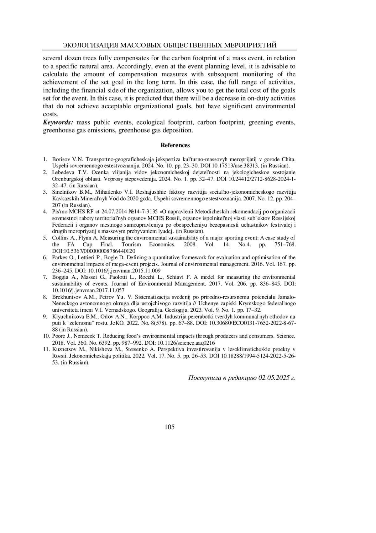 В работе представлены результаты систематизации экологических параметров проведения массовых общественных мероприятий для формирования методики оценки экологизации его проведения. В качестве составляющих рассмотрены составляющие возможные для учёта процессы мероприятия: потребление электроэнергии, питание, транспортировка участников. Для сопоставимости показателей авторами выполнено приведение показателей к оценке совокупных выбросов парниковых газов, которые рассчитываются по распространённым международным практикам с выходом на определённые значения выброса парниковых газов. В качестве меры оценки эффективности предложена двоичная система удовлетворительная либо неудовлетворительная степень экологизации массового общественного мероприятия, в зависимости от соотношения депонирования парниковых газов с их эмиссией в рамках реализации всех мероприятий, включая постсобытийную компенсацию.