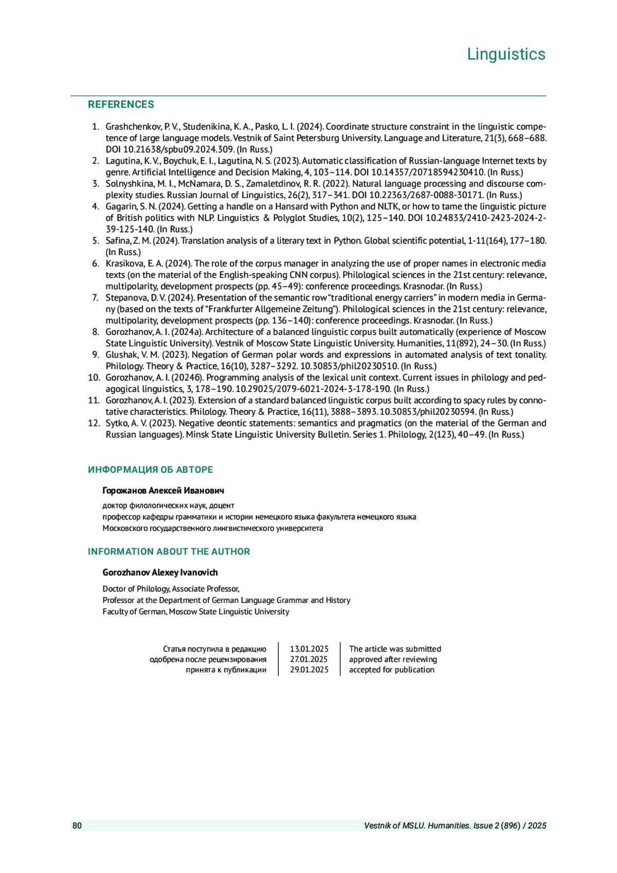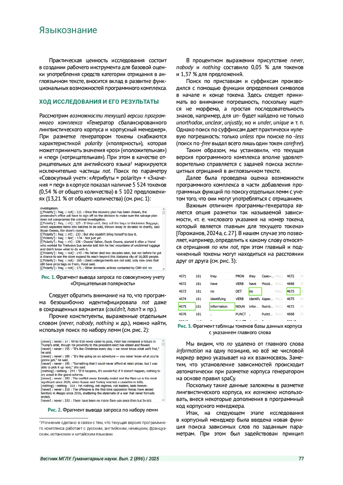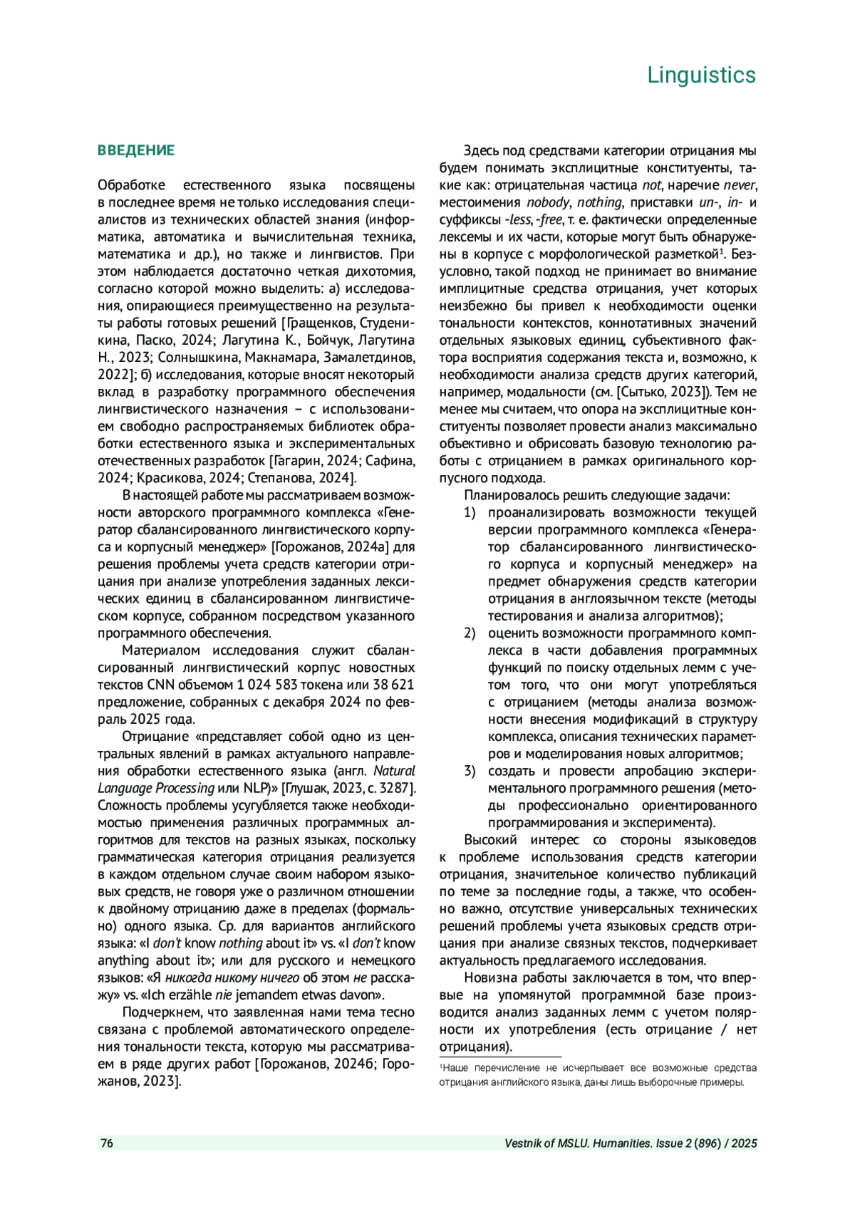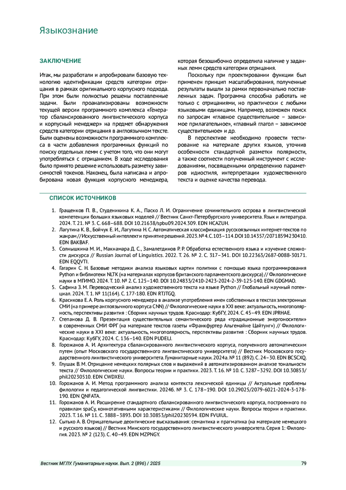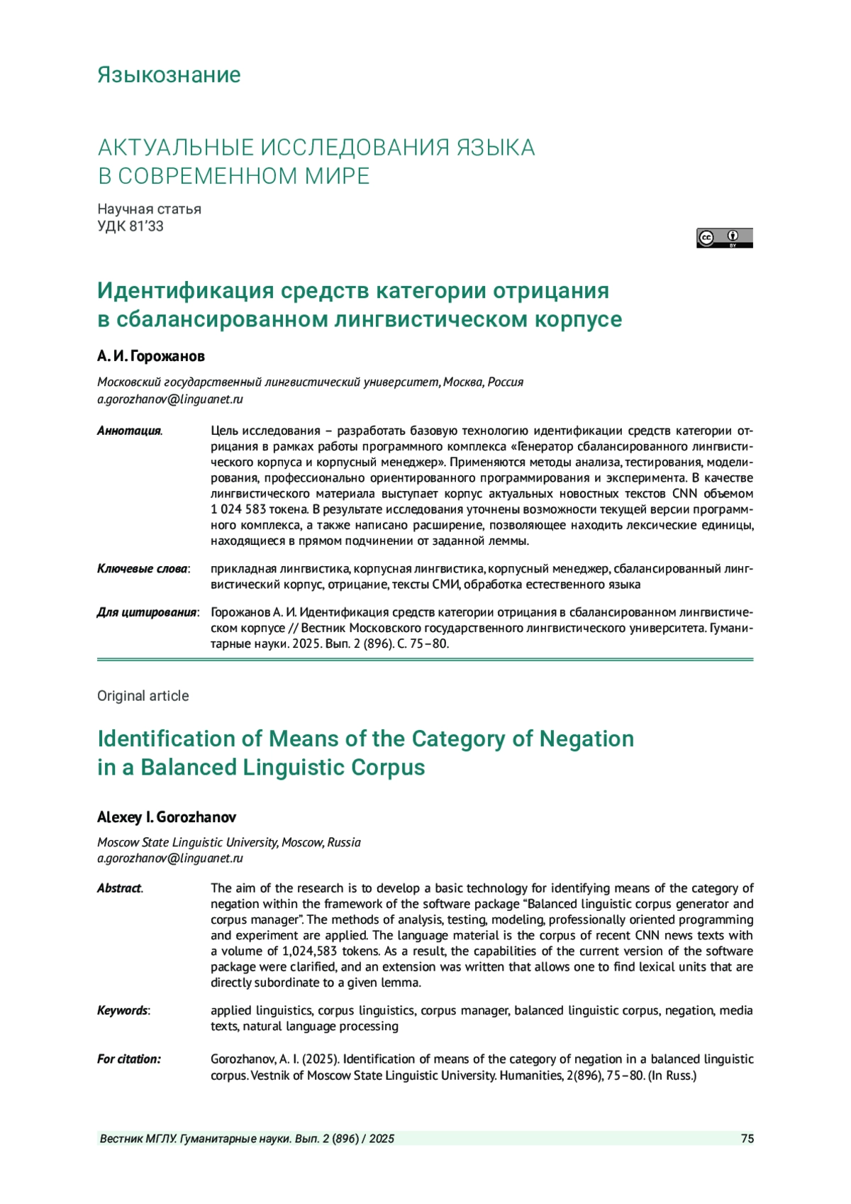 ГОРОЖАНОВ А. И. ИДЕНТИФИКАЦИЯ СРЕДСТВ КАТЕГОРИИ ОТРИЦАНИЯ В СБАЛАНСИРОВАННОМ ЛИНГВИСТИЧЕСКОМ КОРПУСЕ // ВЕСТНИК МОСКОВСКОГО ГОСУДАРСТВЕННОГО ЛИНГВИСТИЧЕСКОГО УНИВЕРСИТЕТА. ГУМАНИТАРНЫЕ НАУКИ. 2025. № 2 (896)