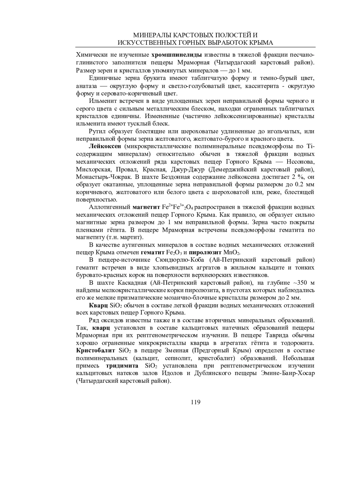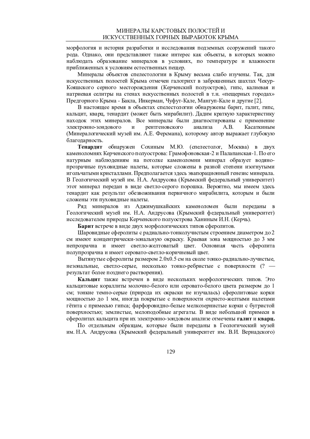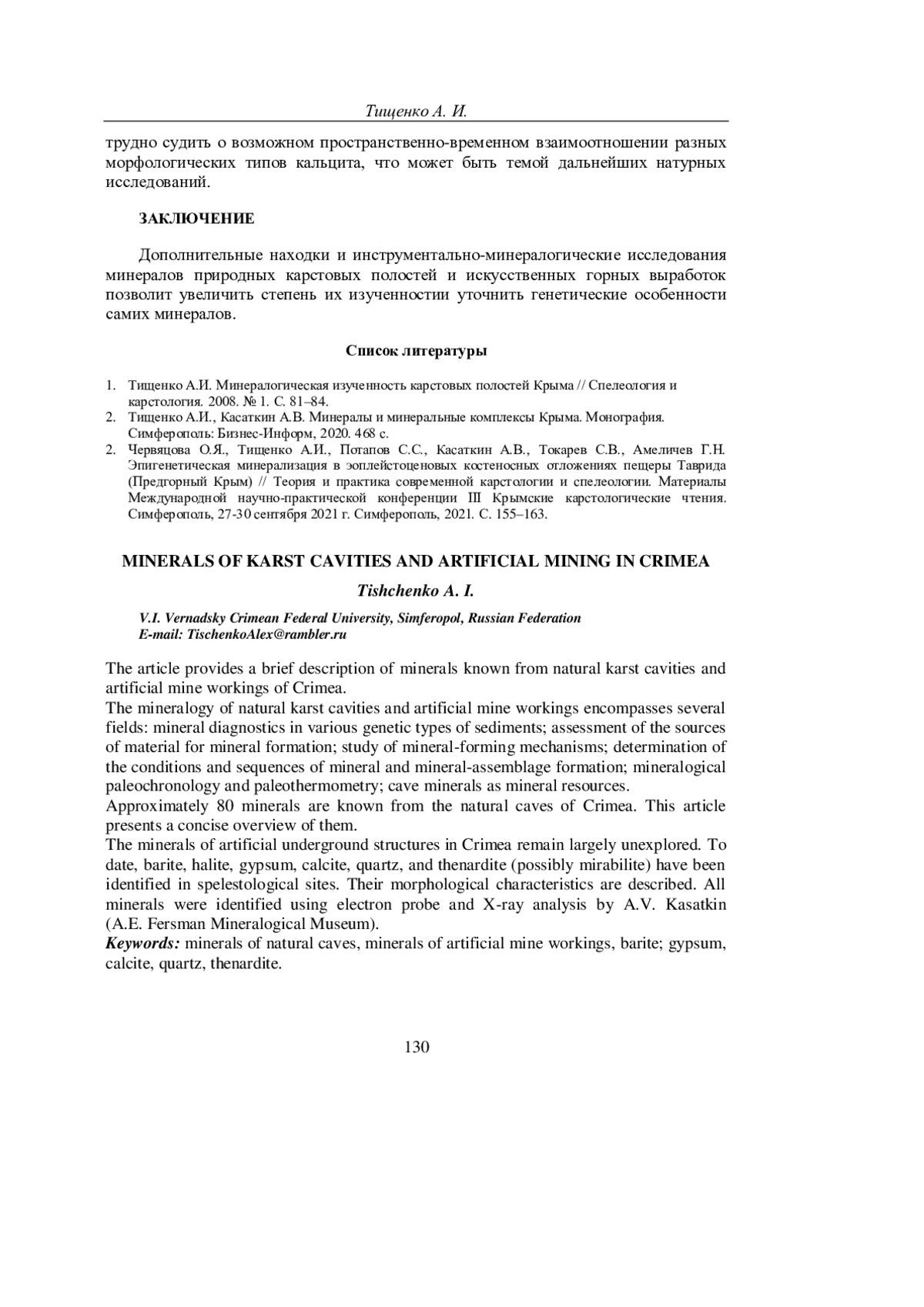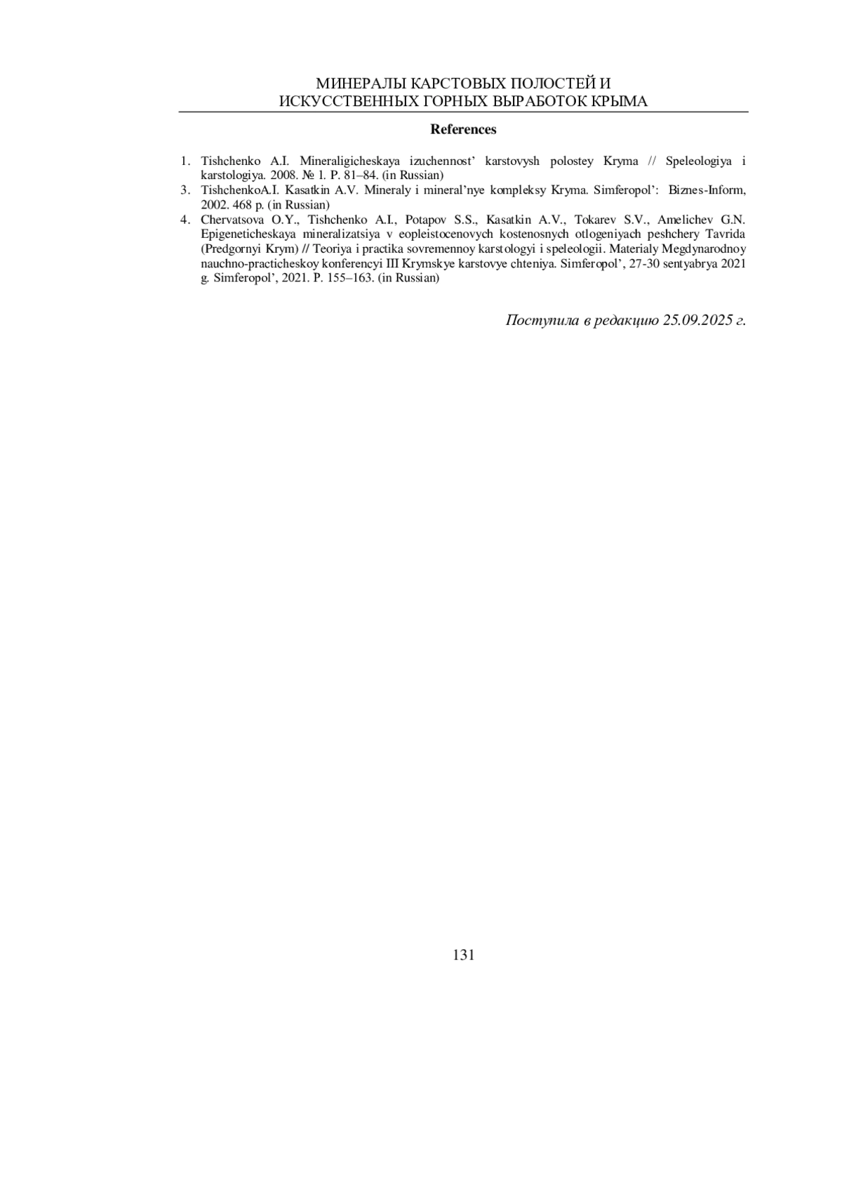ТИЩЕНКО А. И. МИНЕРАЛЫ КАРСТОВЫХ ПОЛОСТЕЙ ИИСКУССТВЕННЫХ ГОРНЫХ ВЫРАБОТОК КРЫМА // УЧЕНЫЕ ЗАПИСКИ КРЫМСКОГО ФЕДЕРАЛЬНОГО УНИВЕРСИТЕТА ИМЕНИ В. И. ВЕРНАДСКОГО. ГЕОГРАФИЯ. ГЕОЛОГИЯ. 2025. ТОМ 11 (77). № 3